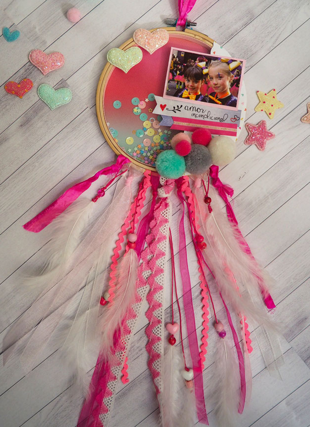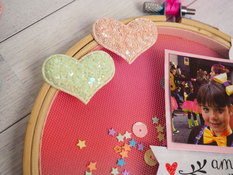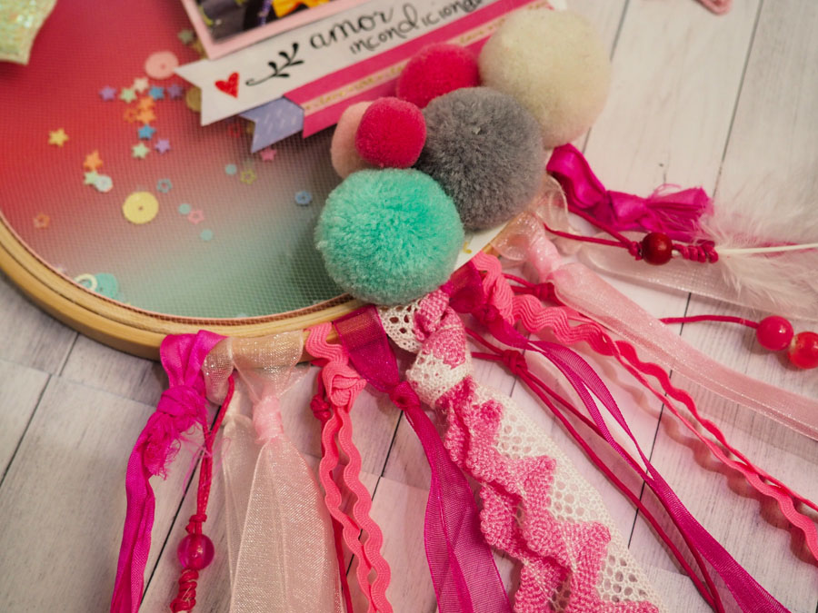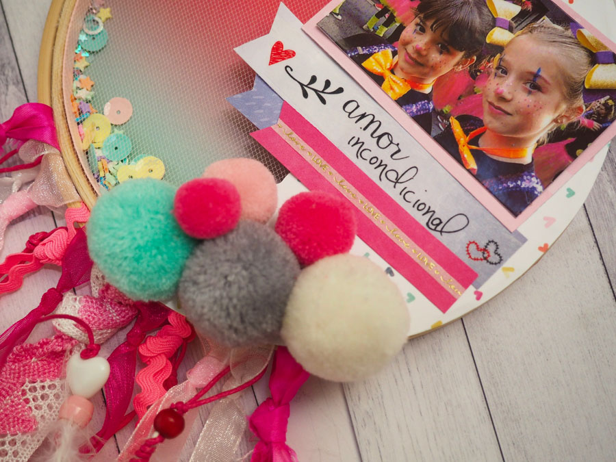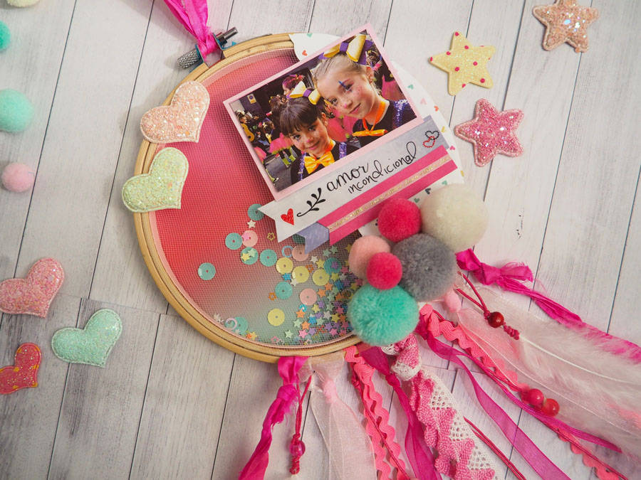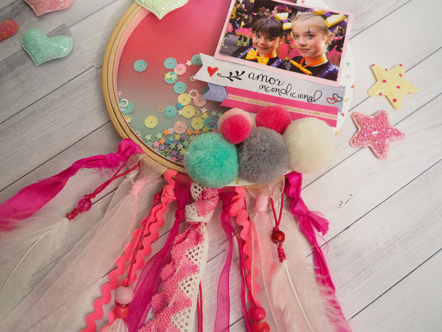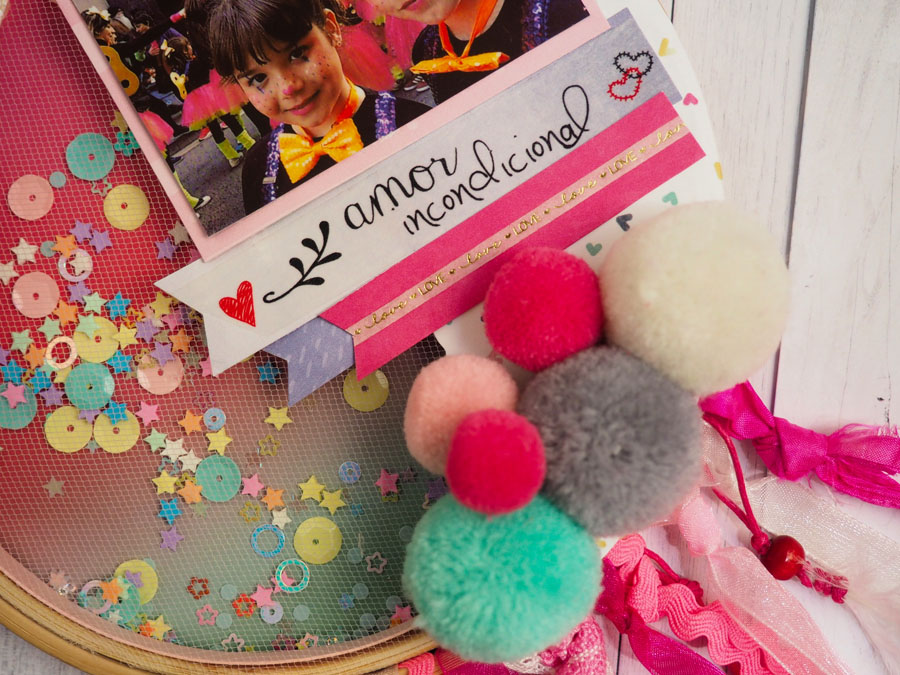 Es un bastidor shaker hecho con tul y lleno de lentejuelas, estrellitas y cristalitos… en la parte de detrás un papel de scrapbooking de la colección Wild & Free de Glitz. Delante un trocito de corazones de Pink Paislee aunque casi no se ve… Una foto de carnaval de mis peques, un par de banderines con washi tape de Estrelles de colors, pompones de colores y corazones de purpurina… En la parte de abajo varios lazos de organza, ganchillo y puntilla. Con cordón unas plumas atadas con bolitas de hacer collares… Y poca cosa más! aquí os dejo fotos de todos los detalles…