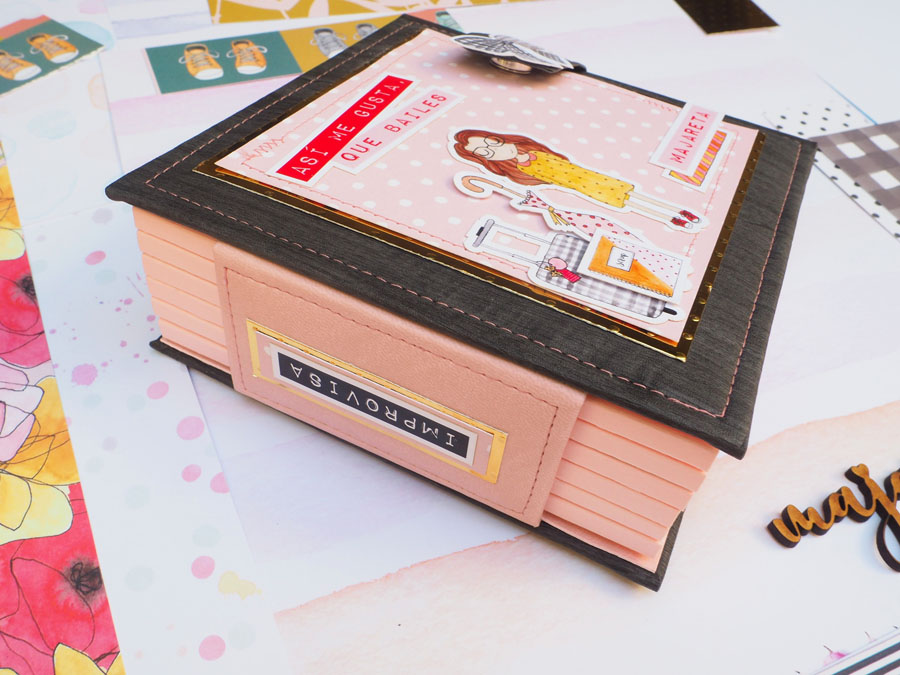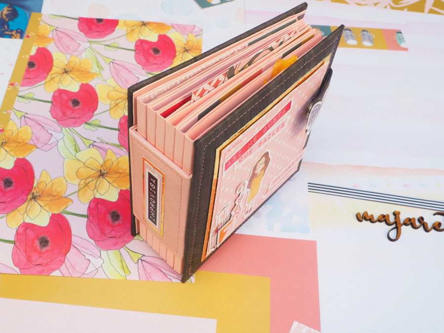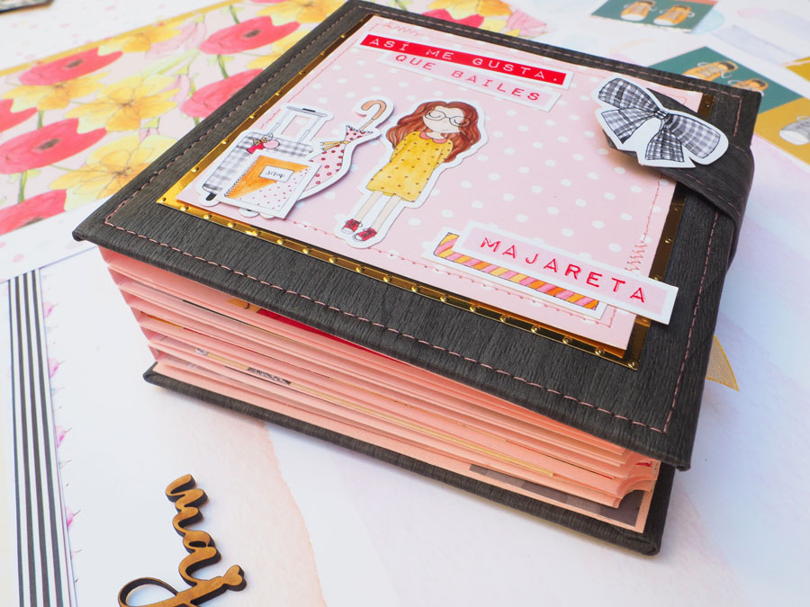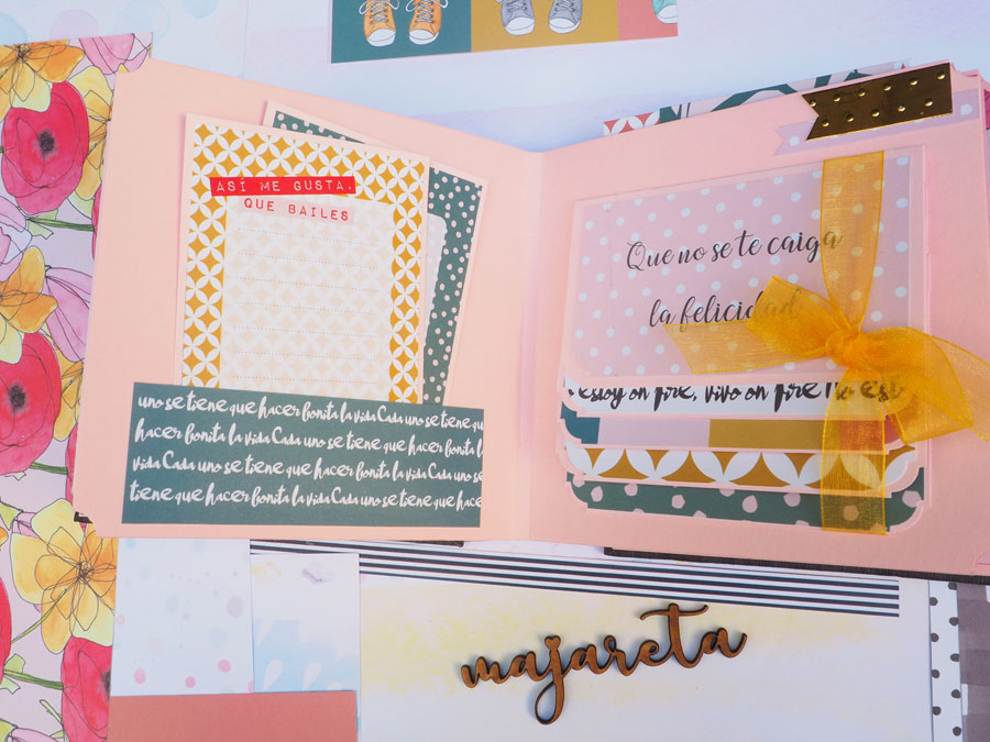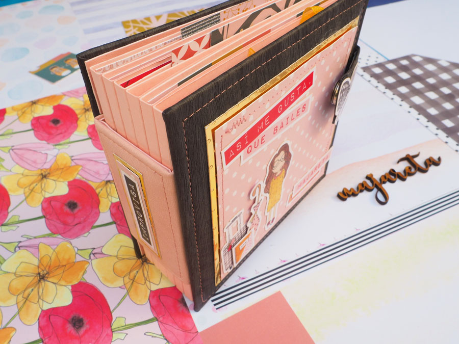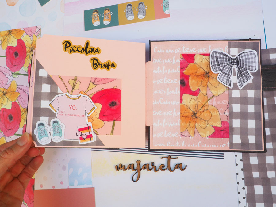 Para hacer el álbum he usado la colección Piccolina Brava, los diecuts y el velum de flores. Cartulina de alta calidad de SdnArt para hacer los minilibritos interiores que simulan una encuadernacion espina, cartulina dorada, y ecopiel madera negro y rosa crepe de Kora Projects para forrar el lomo. Es la primera vez que utilizo ecopiel y me requetechifla el resultado! 🙂 El lomo lo he dejado mitad visto mitad tapado y y por dentro está lleno de bolsillos, una cascada y desplegables con cierres de imán y lazos … El cierre también es la primera vez que lo uso, un cierre de imán como los de los monederos, y creo que no será la última vez que lo utilice… A ver si os gusta!