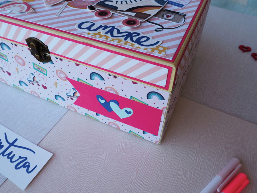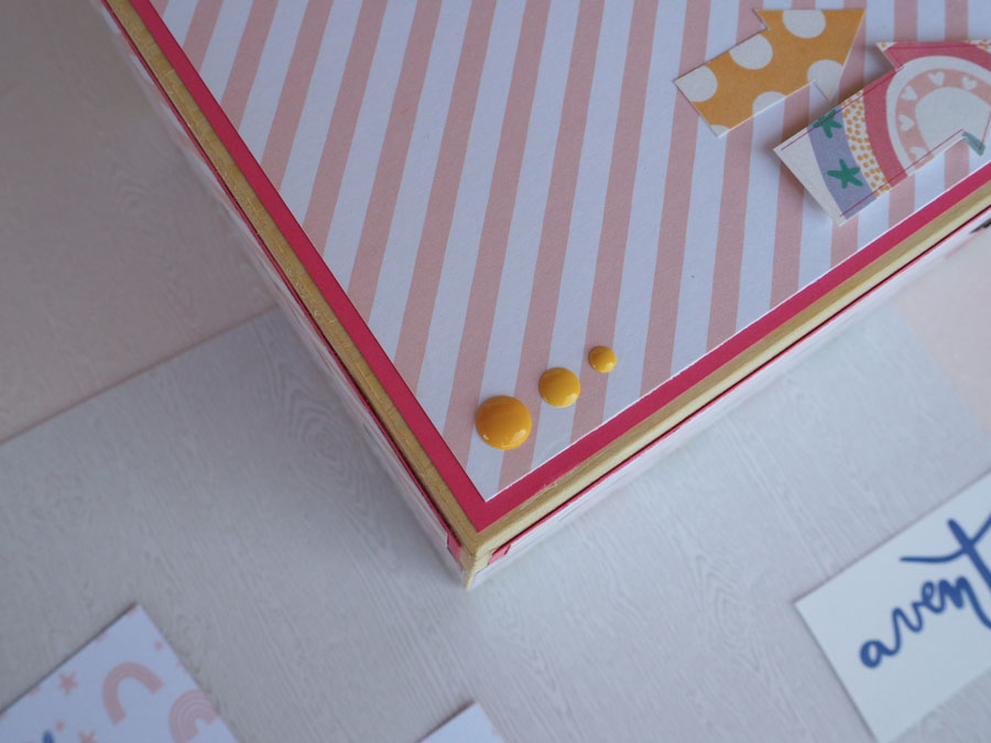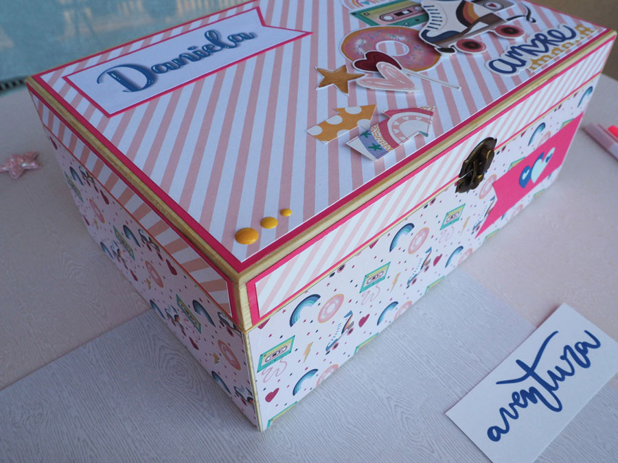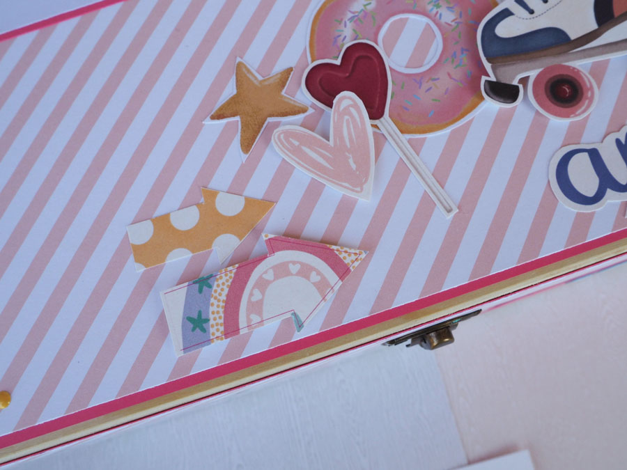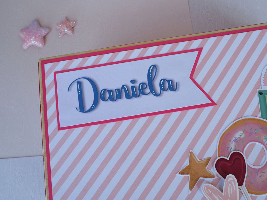En la tapa he puesto cartulina rosa fucsia y un papel de la colección de rayitas. Para decorarla he puesto una banderola con el nombre de Daniela, la peque destinataria de este regalito, y lo he decorado con die cuts de la misma colección.