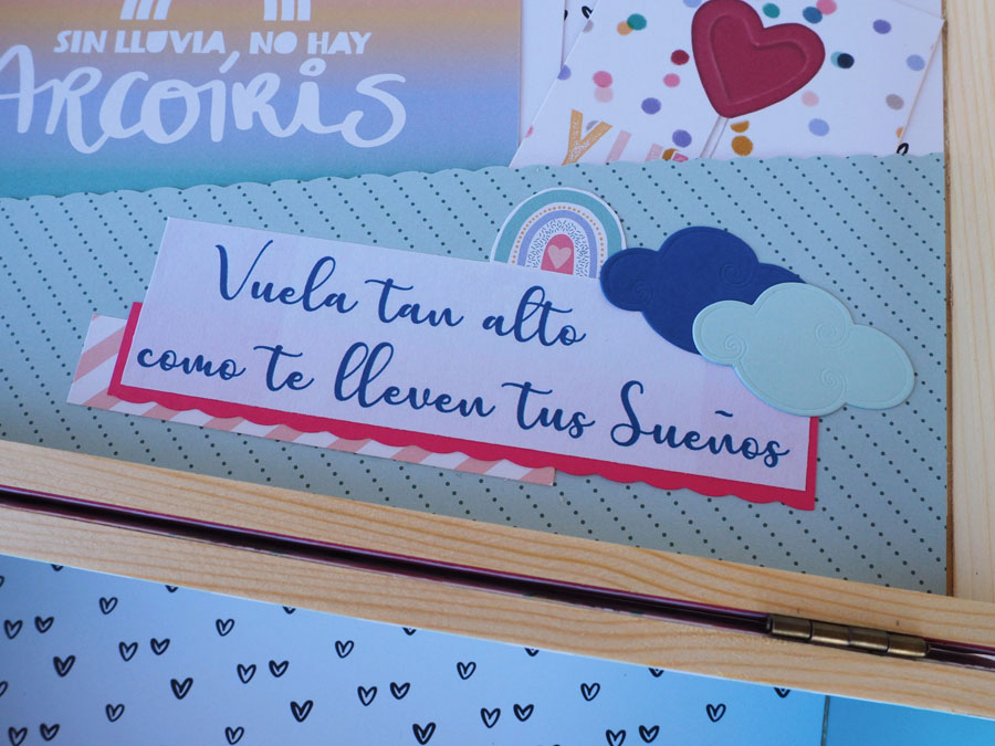 La verdad es que me ha encantado trabajar con esta colección por su calidad y diseño, es fácil de combinar y los die cuts son lo más :-). Los laterales decorados con un papel estampado que lleva muchos dibujos en pequeñito y el interior combinado en dos colores verdes… en la parte interior de la tapa un bolsillo con una frase que suelo utilizar bastante: «Vuela tan alto como te lleven tus sueños» con unas nubes y unas tarjetas de la misma cole… mirad mirad, y contadme que os parece: