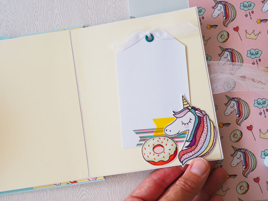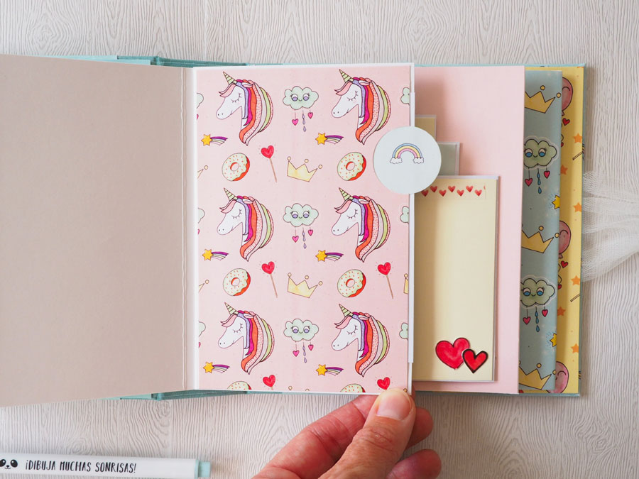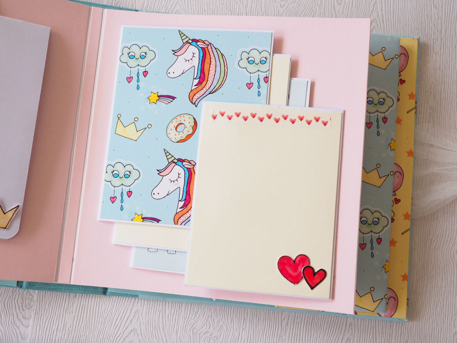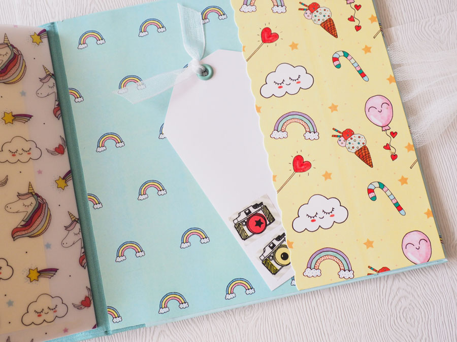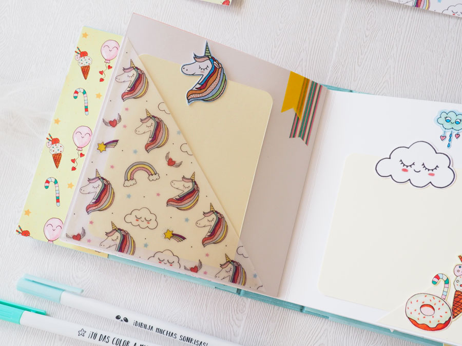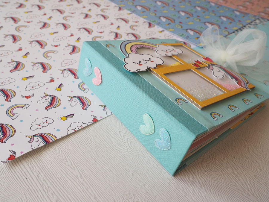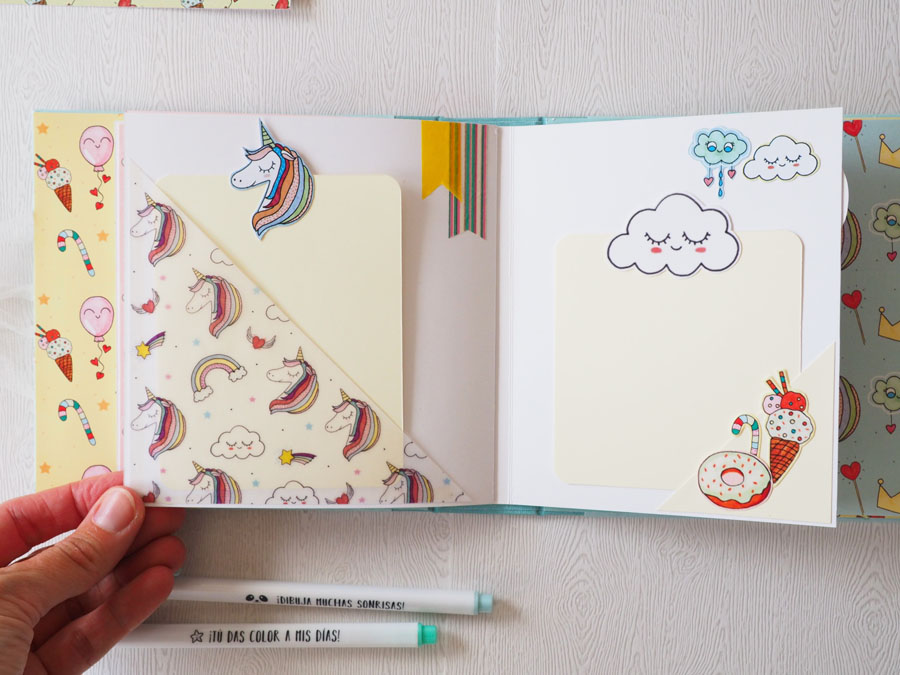 Es un álbum con encuadernación de falsa espina, decorado con los papeles de la preciosa colección digital de Unicornios de Laura, combinados con cartulinas lisas de SdnArt que son una maravilla… La colección la he impreso en cartulina y también en velum y la verdad es que queda genial.