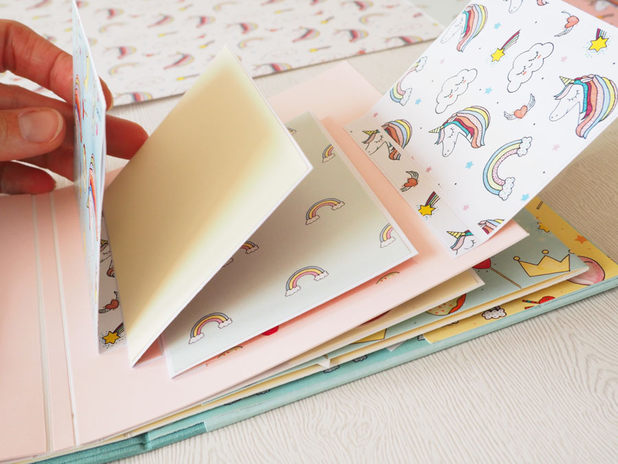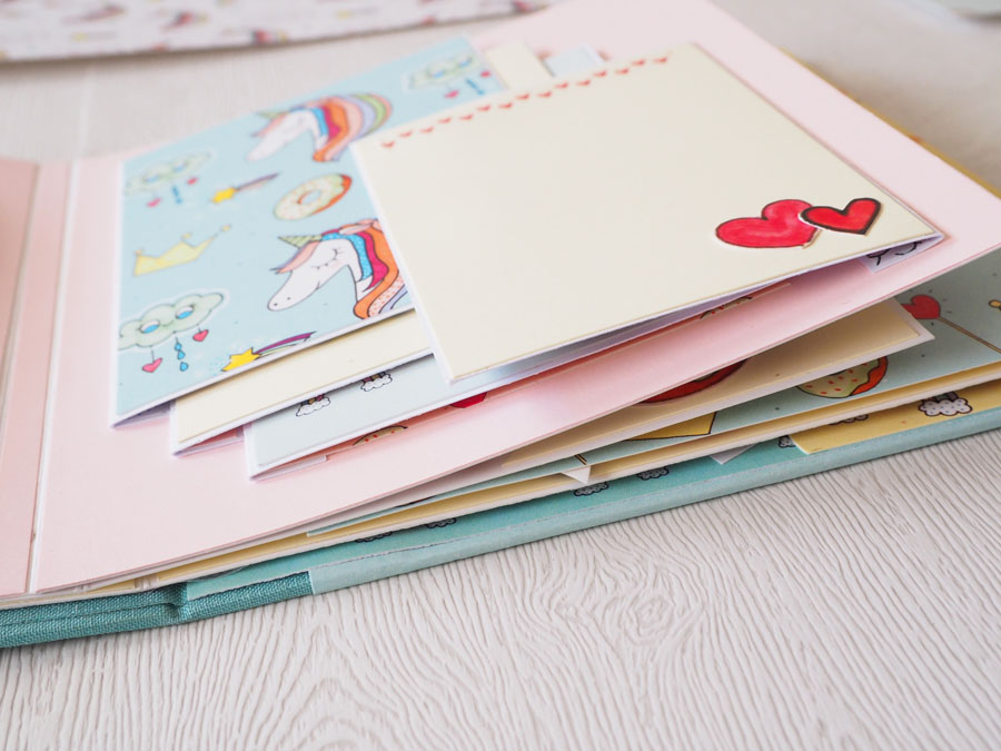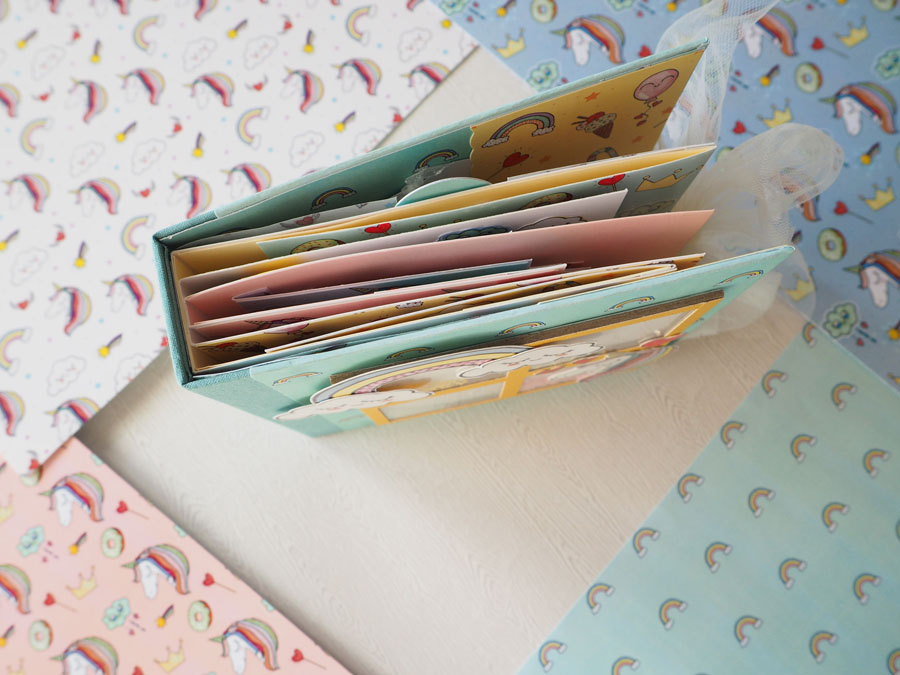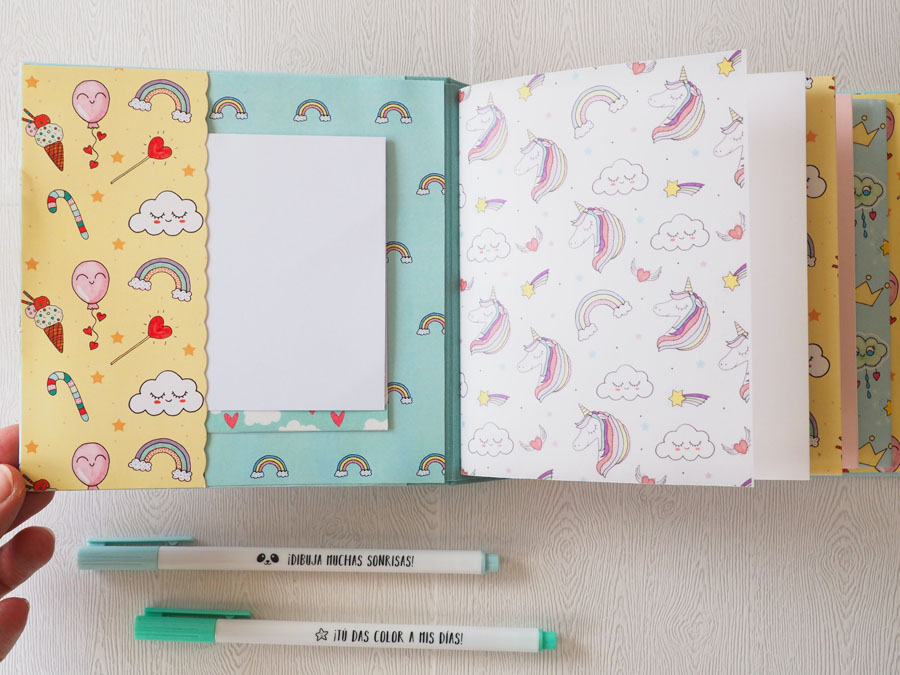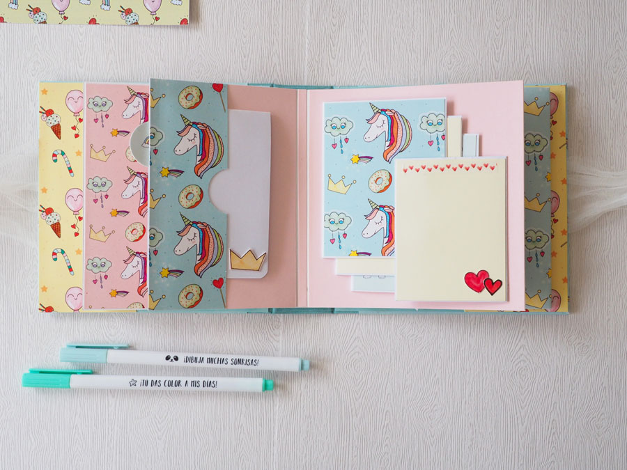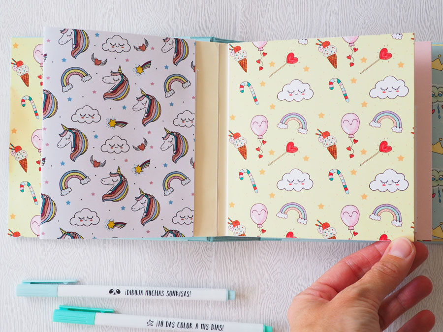Es un álbum con encuadernación de falsa espina, decorado con los papeles de la preciosa colección digital de Unicornios de Laura, combinados con cartulinas lisas de SdnArt que son una maravilla… La colección la he impreso en cartulina y también en velum y la verdad es que queda genial.