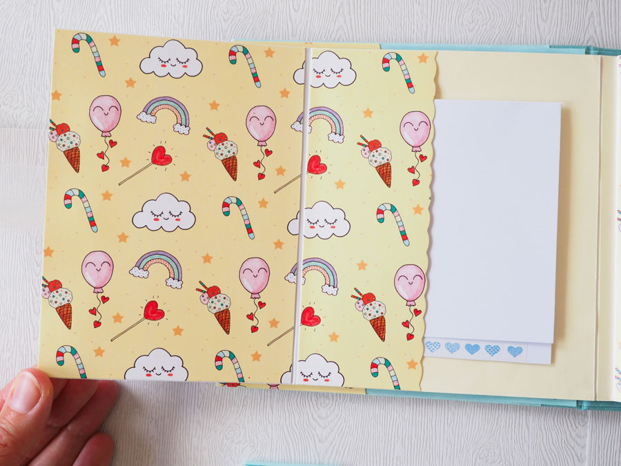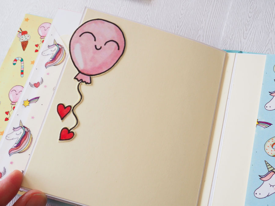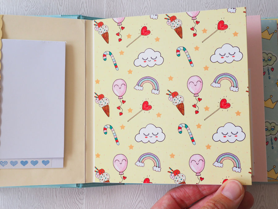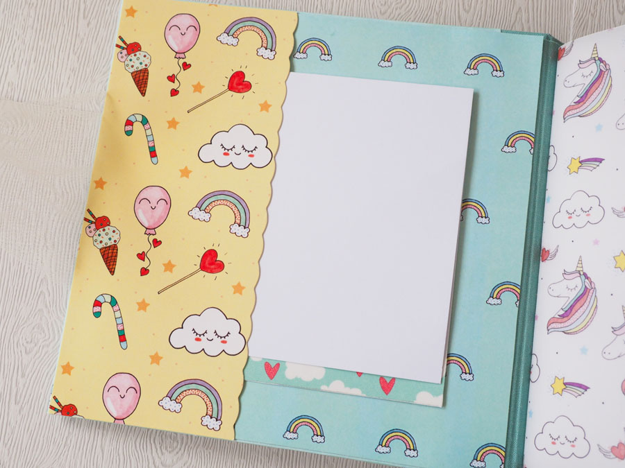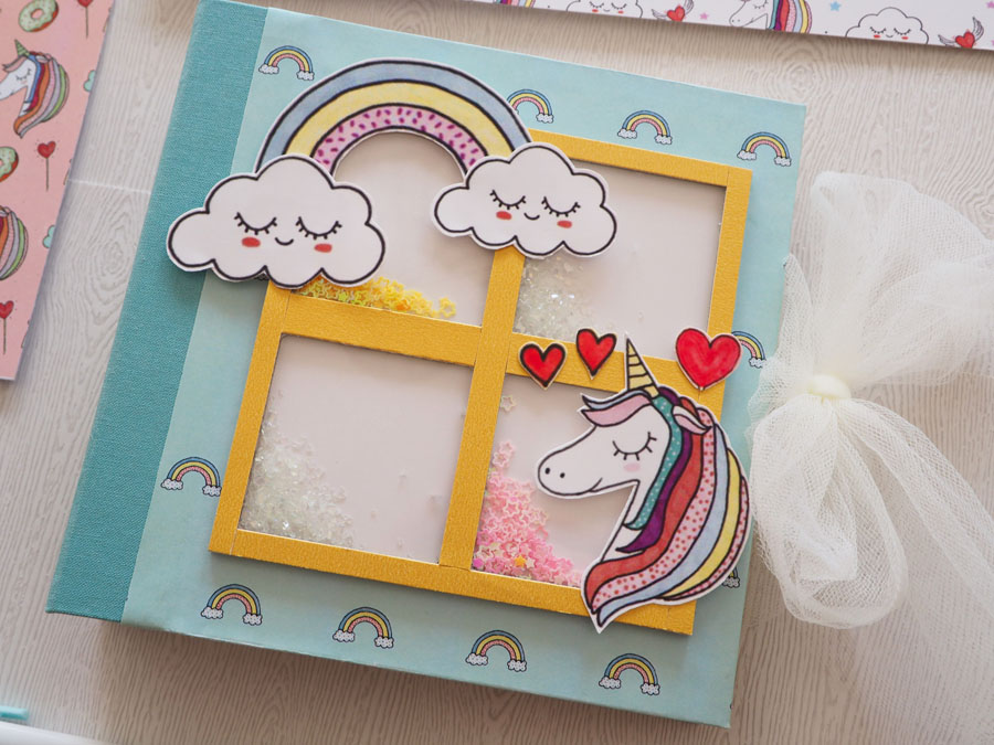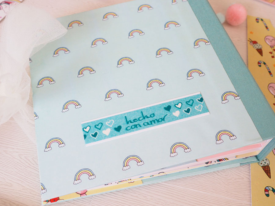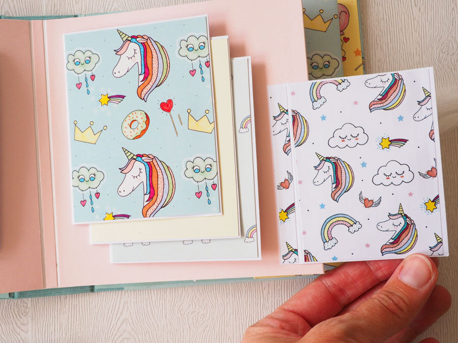 Es un álbum con encuadernación de falsa espina, decorado con los papeles de la preciosa colección digital de Unicornios de Laura, combinados con cartulinas lisas de SdnArt que son una maravilla… La colección la he impreso en cartulina y también en velum y la verdad es que queda genial.