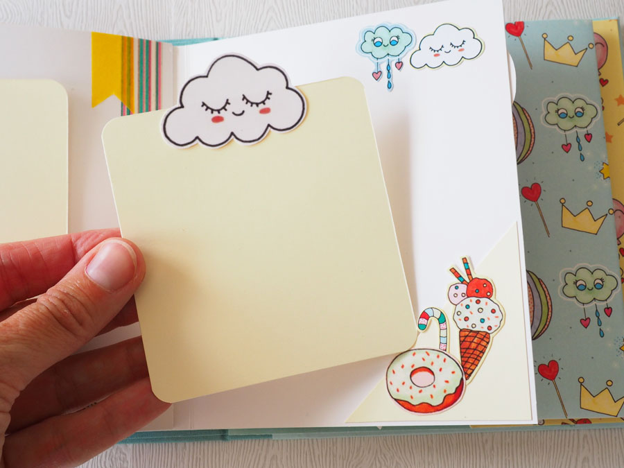 En la portada una shacker de 4 separaciones, rellena con diferentes lentejuelas y sparkles de Bellas y Creativas. Hace unas semanas estrenamos un juego, y las cartas venían enganchadas en unos cartones… mi marido los iba a tirar pero yo los guardé, porque nada más verlos ví una shaker, una ventana o algo bonito jeje… además en el scrap no se tira nada oiga!! no sé si os pasa pero a mí me da la sensación de que todas las scraperas y scraperos tenemos un poco síndrome de diógenes y a todo le vemos utilidad 🙂 Además de la shaker he usado unos die cuts de la misma colección para decorar la portada, y unos corazones acolchados en el lomo del álbum. De cierre un lazo con tul. El interior lleno de desplegables, alguna cascada, bolsillos de velum y muchos detallitos recortados para decorar… aquí os enseño las fotos y en instagram os dejaré un vídeo, a ver si os gusta tanto como a mi peque que le ha encantado 🙂