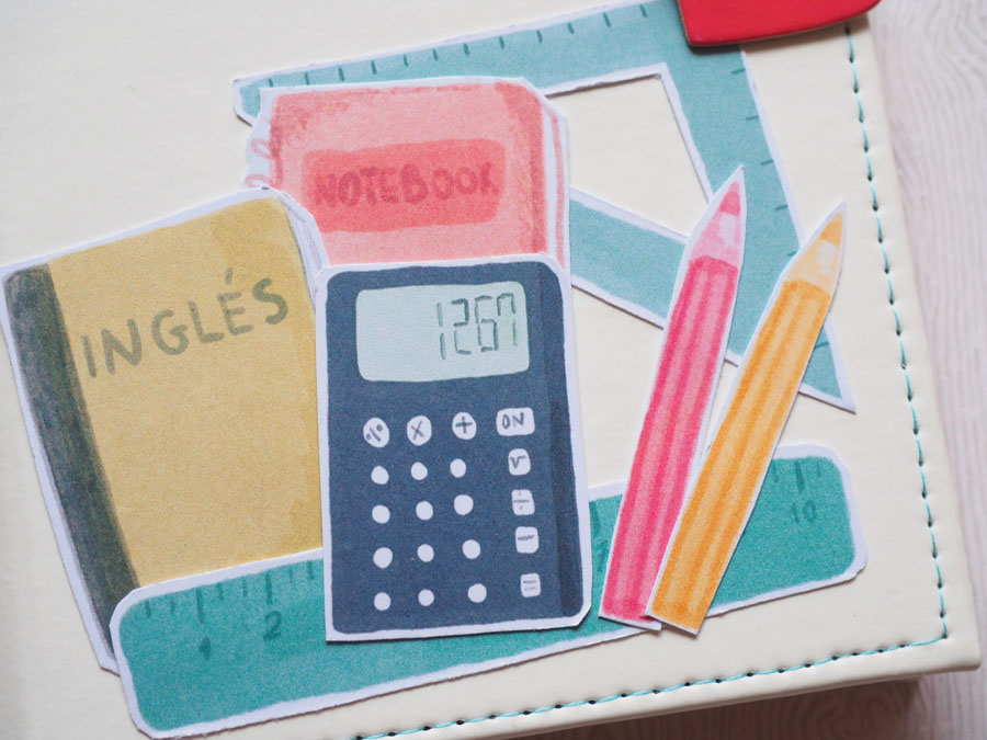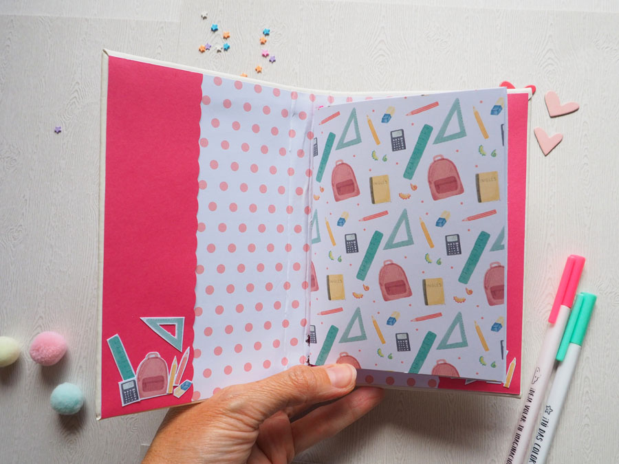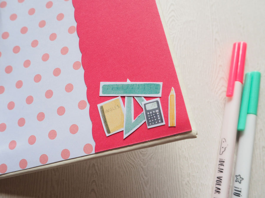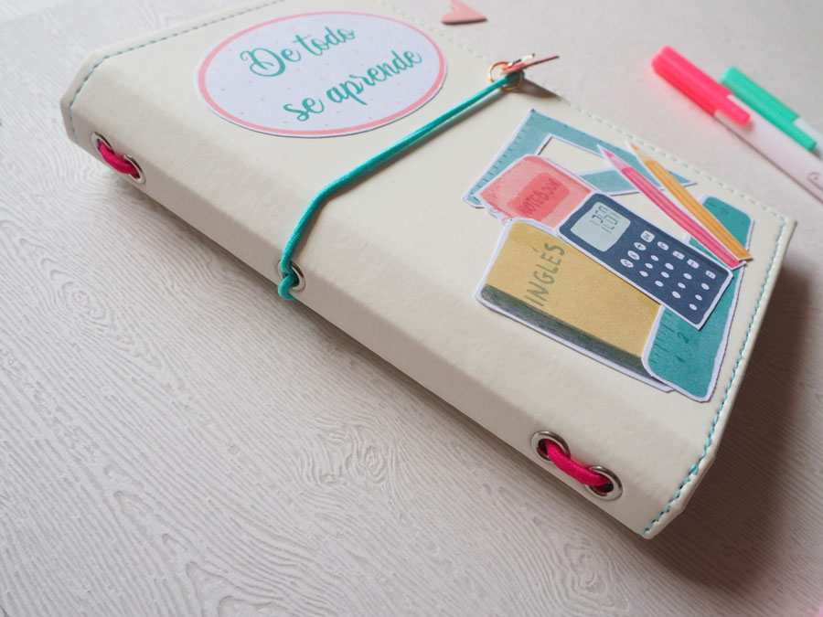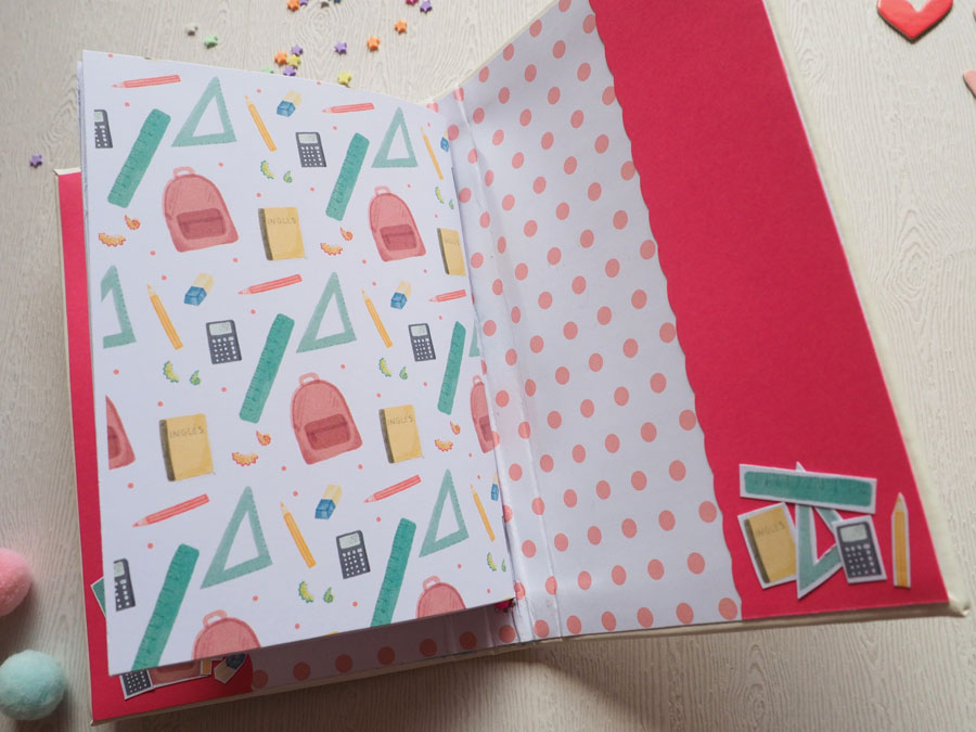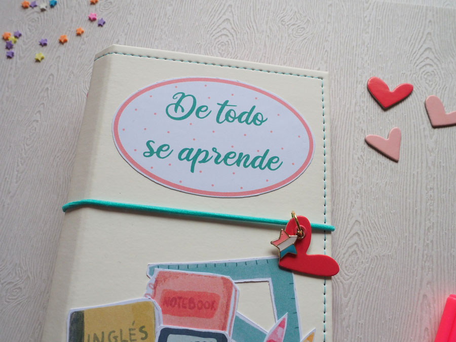 Yo he hecho un midori con polipiel blanco y he decorado la portada con los die cuts… a la goma de cierre le he puesto una estrella y un corazón colgados. El interior lo he forrado con un papel de lunares rosas de la nueva colección digital de cocina, que es una chulada (en breve os enseño un proyecto con esta cole 🙂 ). Un par de bolsillos en el interior de la portada y contraportada, decorados con detallitos recortados. El cuadernillo interior lleva el papel que nos regala Laura y unos folios blancos. Y eso es todo, ya veis que es muy sencillito. Mirad las fotos: