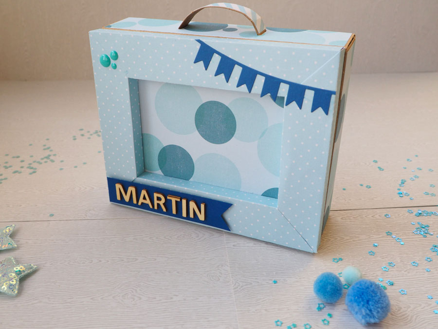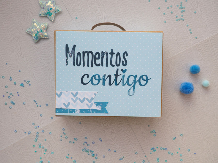 El marco hecho con papel con un troquel de Elizabet Craft Designs. De decoración tan solo un banderín arriba, unos dots y una banderola con el nombre en madera. En la parte de atrás de la tapa la frase «Momentos contigo» con letras troqueladas, y por dentro unos corazones y unos detallitos de la colección.