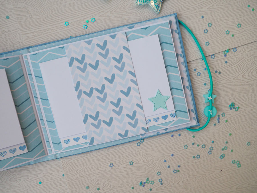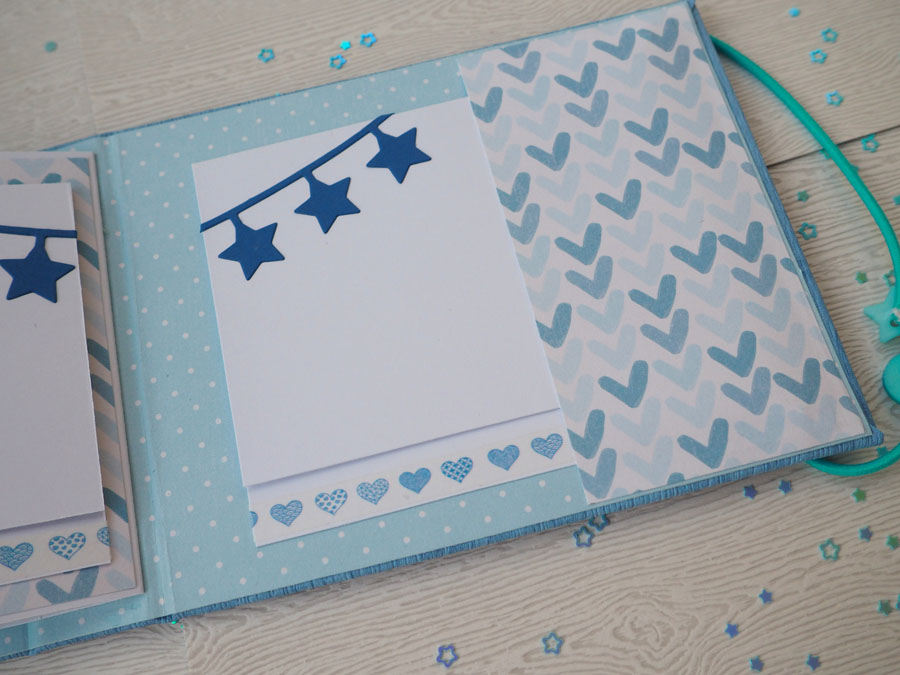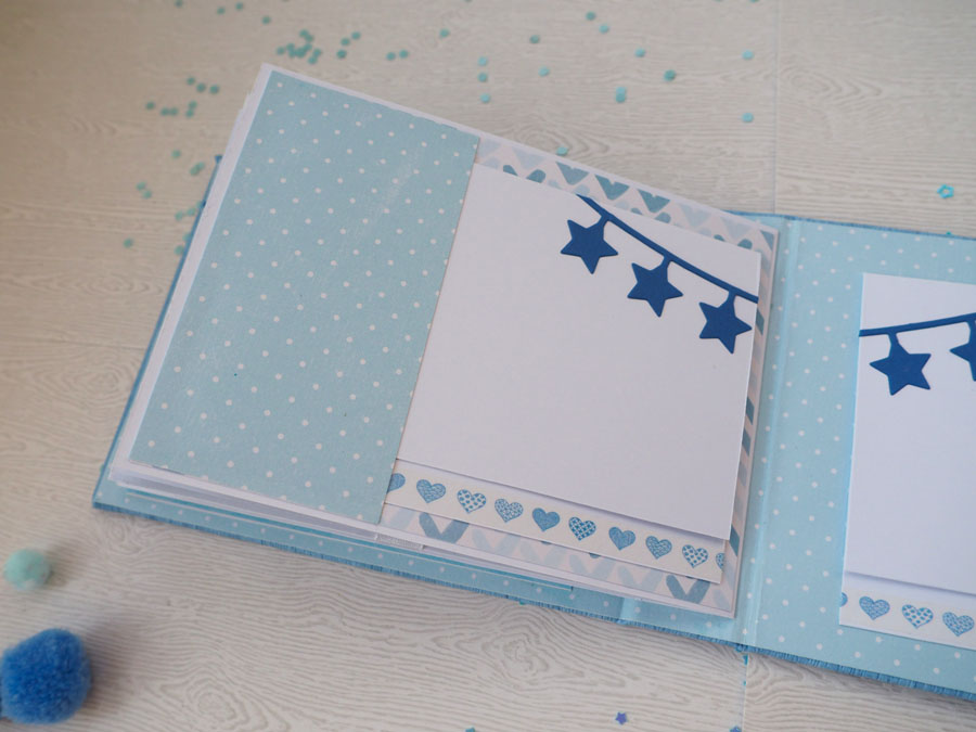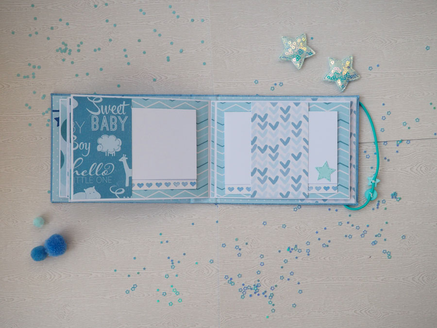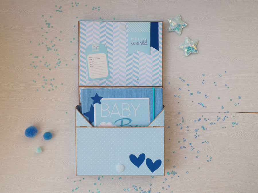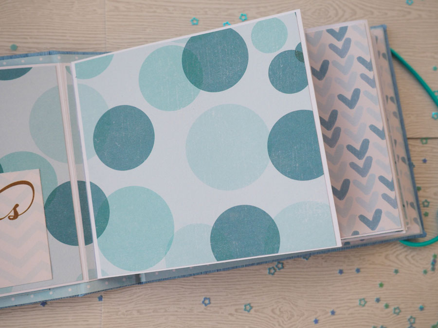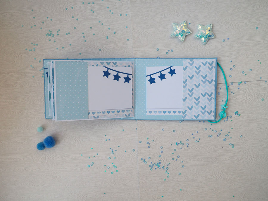 Para hacer tanto el álbum como la caja he usado la colección My baby de American Crafts, y para forrar la estructura del mini he utilizado ecopiel azul, que le da un acabado perfecto 🙂