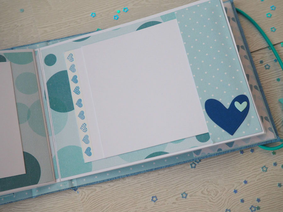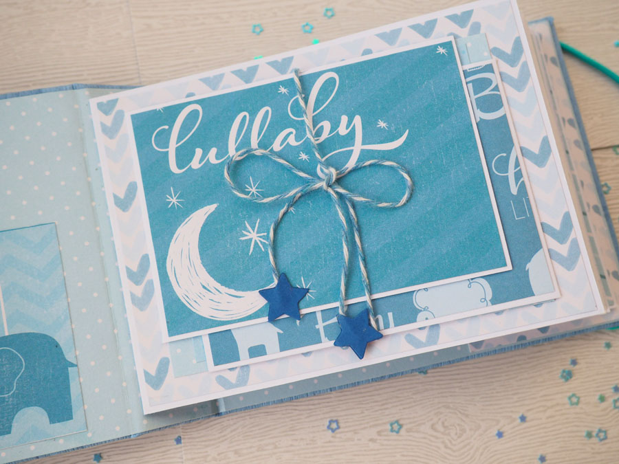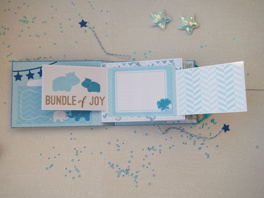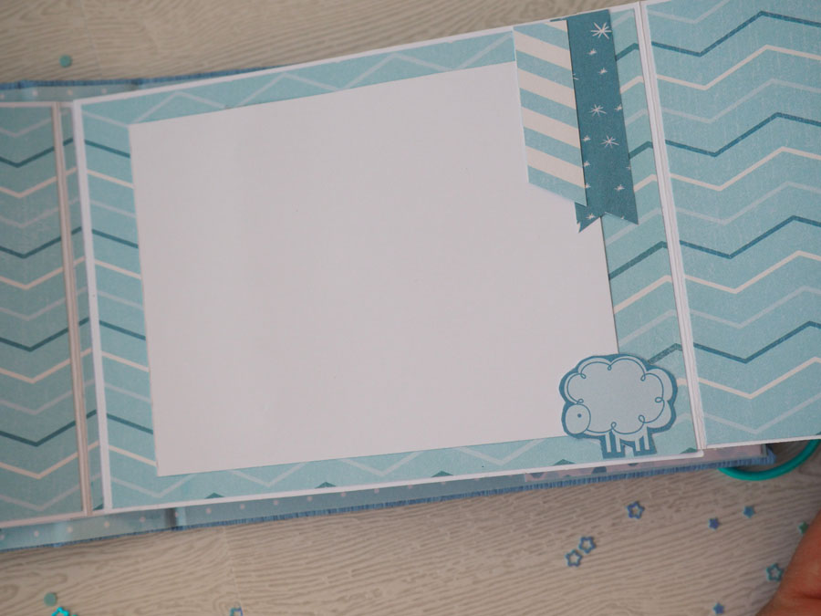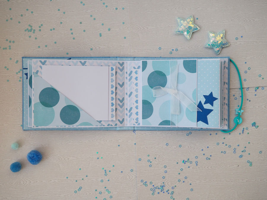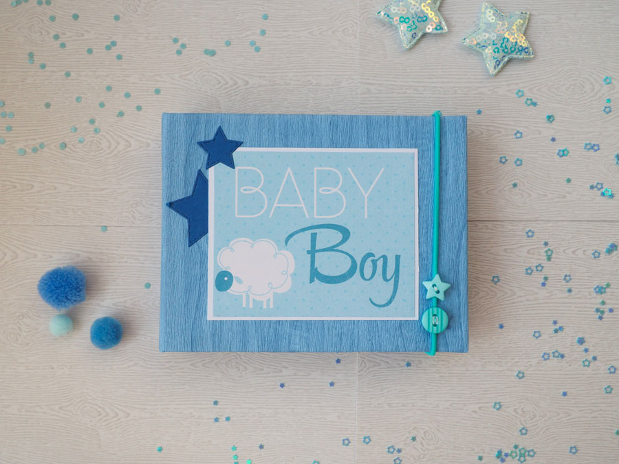 Para hacer tanto el álbum como la caja he usado la colección My baby de American Crafts, y para forrar la estructura del mini he utilizado ecopiel azul, que le da un acabado perfecto 🙂