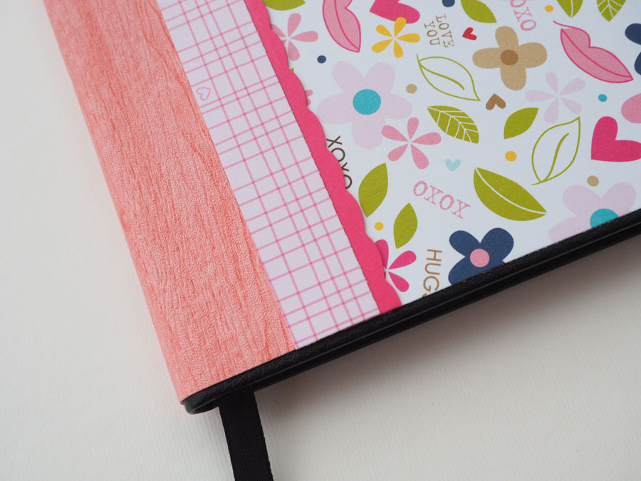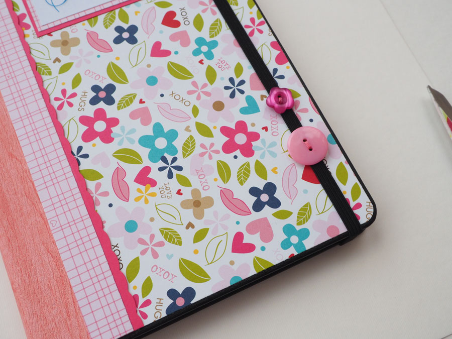 Es una libreta decorada con un papel muy alegre de la colección Kiss me de Bella BLVD. He forrado el lomo con ecopiel rosa, y he forrado toda la tapa con el papel de flores. He puesto una tira de papel de cuadritos y una tira de cartulina cortada con forma de ondas. Esto además de decorar tapa la junta del papel con la ecopiel, y así queda disimulado. El nombre impreso en cartulina blanca con un marquito rosa y de cuadritos alrededor. Cierre de goma con un par de botones cosidos.