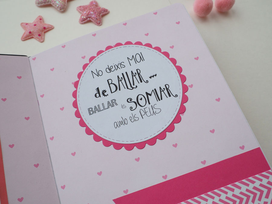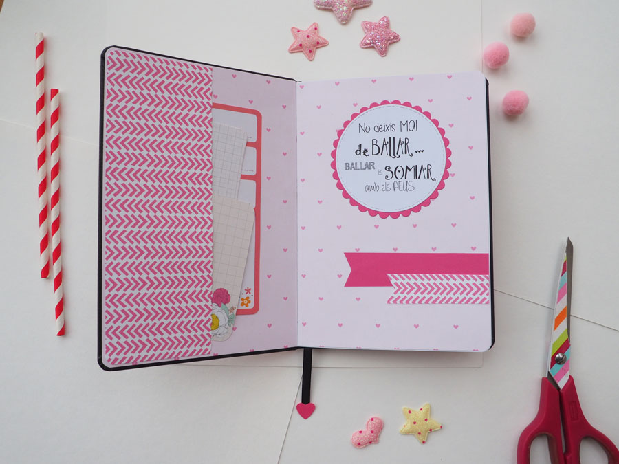 Por dentro bolsillos y en la primera hoja una frase: «No dejes nunca de bailar, bailar es soñar con los pies»… y es que esta libreta me la encargó una amiga para su profe de zumba, así que esta frase le va que ni pintada 🙂
