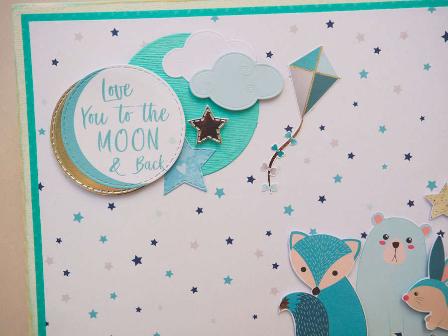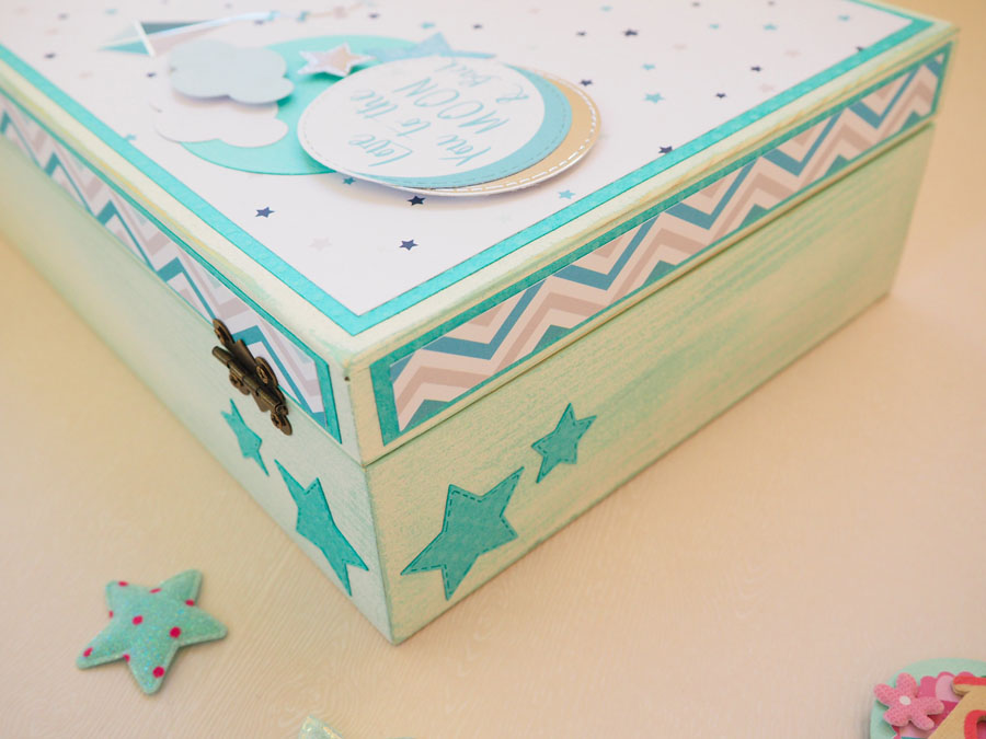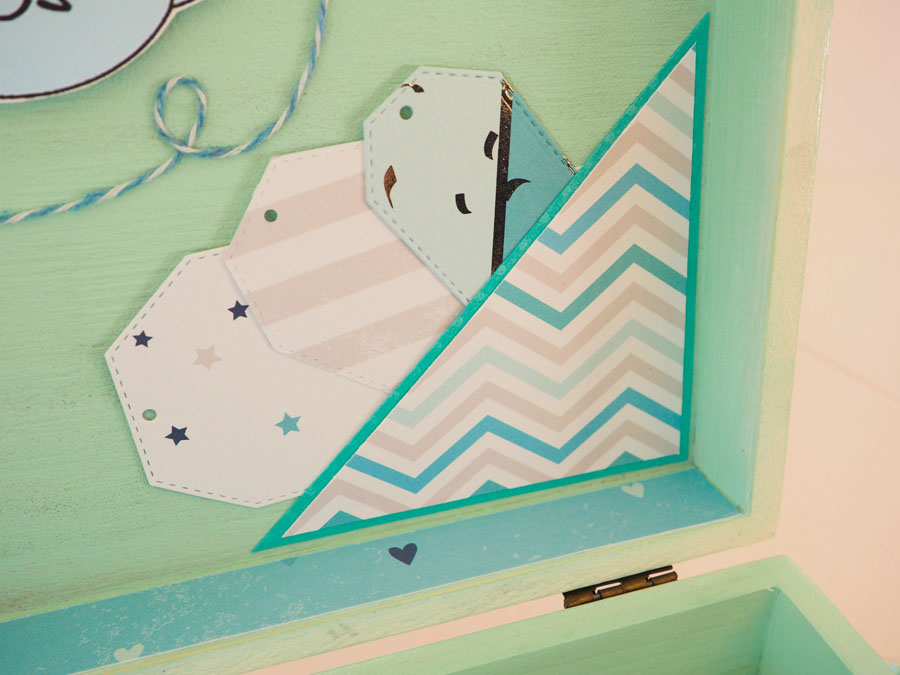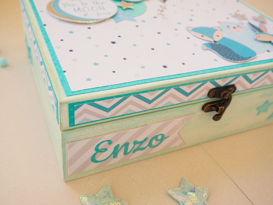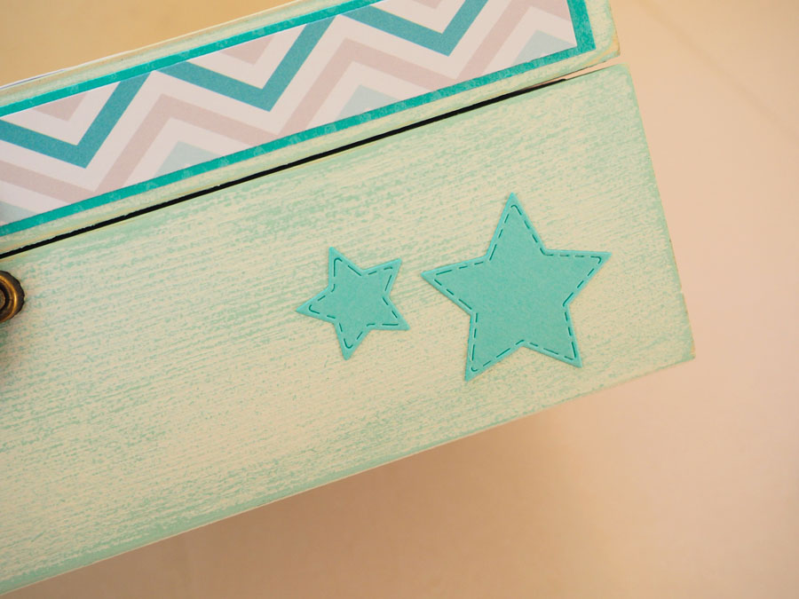 Paso 4: Pasamos un paño para quitar el polvo que hemos creado con la lija y a decorar!! En mi caso he puesto una cartulina mint en la tapa, y encima el papel de estrellitas. Luego he recortado los dibujitos de la colección y los he pegado con foam de doble cara a diferentes alturas. En el borde de la tapa he puesto un papel de rallas para darle un toque más divertido. El nombre lo he troquelado y pegado en una banderola de rayas grises, pegada encima de una cartulina plateada. Unas estrellas troqueladas en las esquinas de la caja y poca cosa más! Una vez decorada la parte exterior ya podemos montar de nuevo la caja.