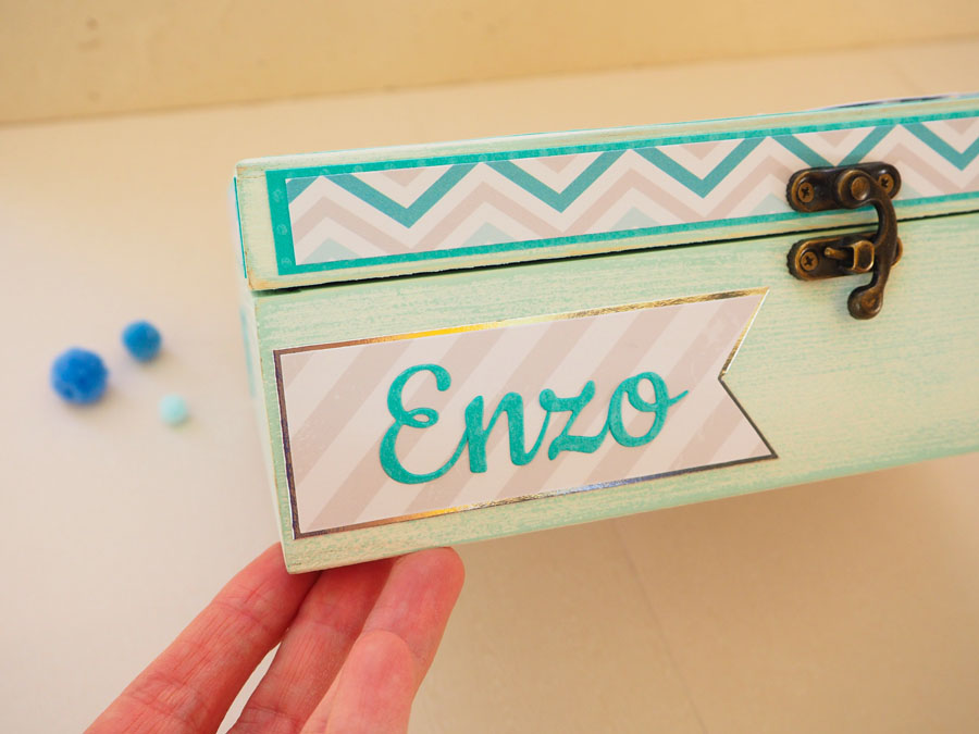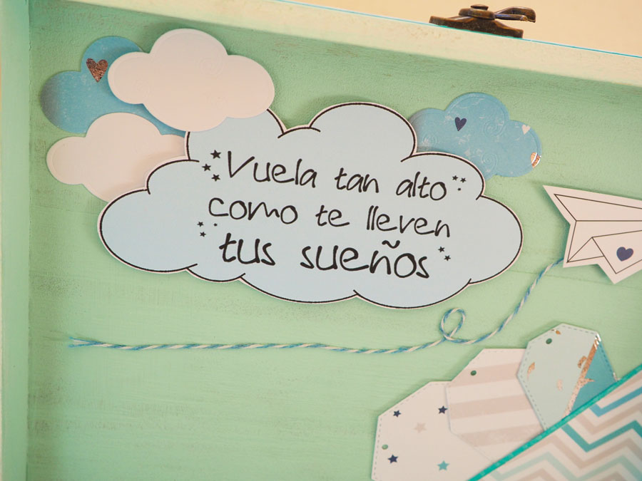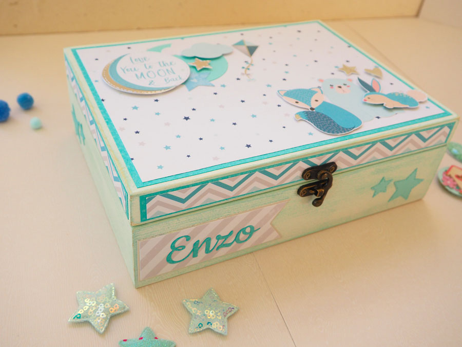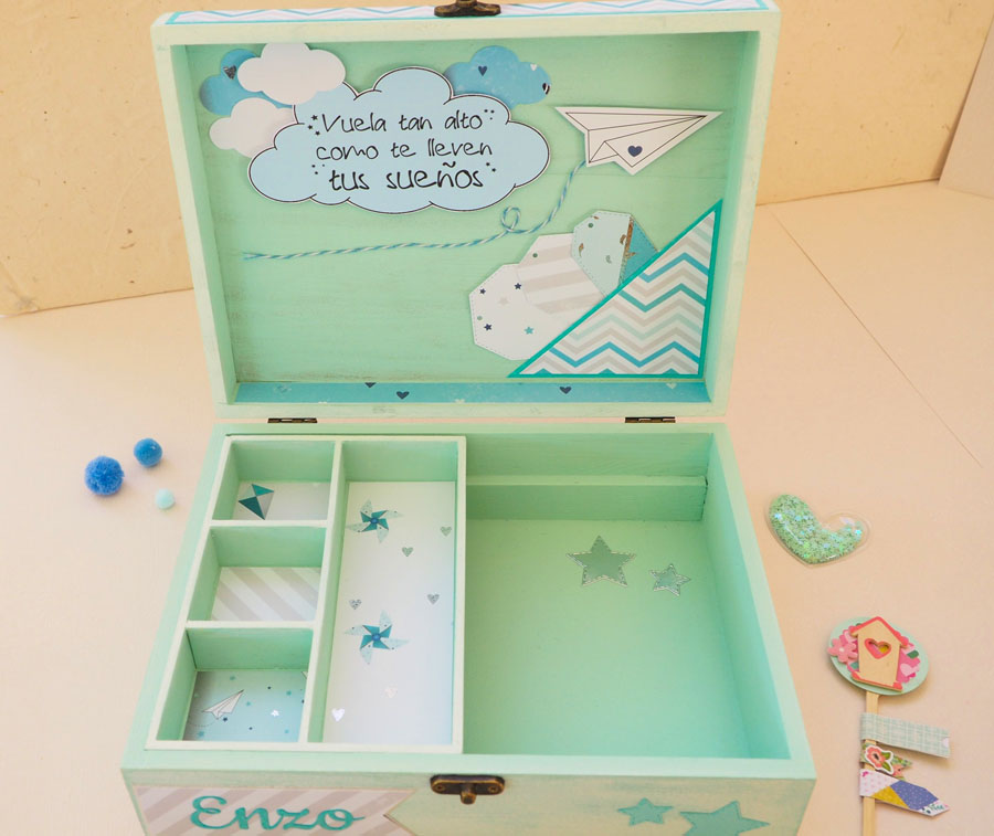 …Como te lleven tus sueños! Esta frase es la que he escogido para decorar el interior de esta cajita de bebé. He hecho 2 cajas, una de niño para Enzo y otra de niña para Elsa, su hermanita. Regalo para dos mellizos preciosos que acaban de nacer. Hoy os enseño la de Enzo, decorada en tonos mint y azules… a ver si os gusta!
