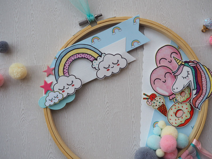 3.- Pegamos unos trozos de cartulina blanca y papel decorado por la parte de detrás, de manera que ocupe un lateral del aro, y luego recortamos el sobrante del papel dándole la forma del círculo. En la parte de arriba pegamos un par de trozos de cartulina como si fuera una banderola.