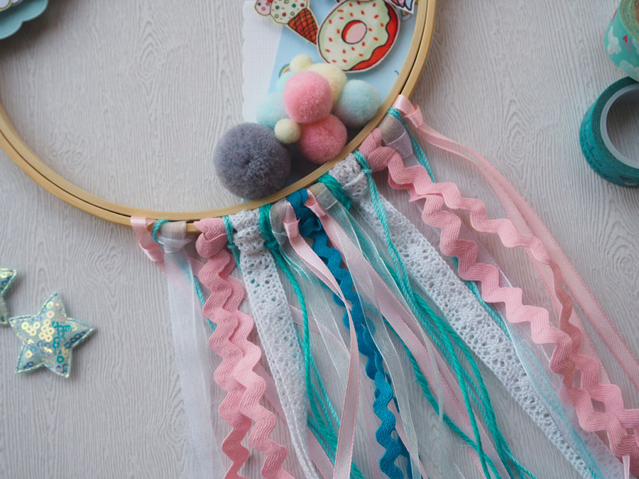 1.- Separamos el bastidor, y en el aro más grande atamos varios lazos de diferentes tipos y colores. Yo he ido combinando los colores rosa, blanco y mint, para que quede más vistoso.