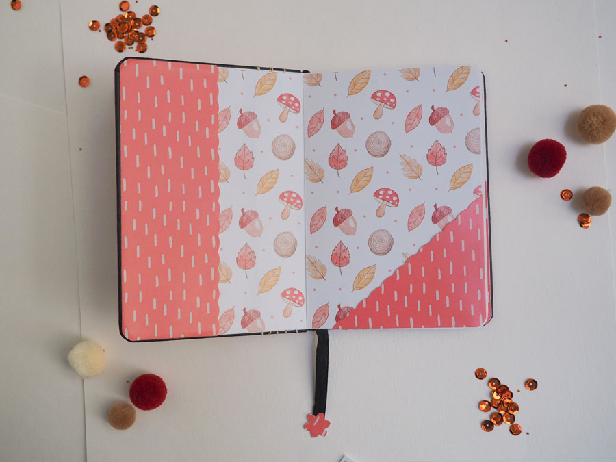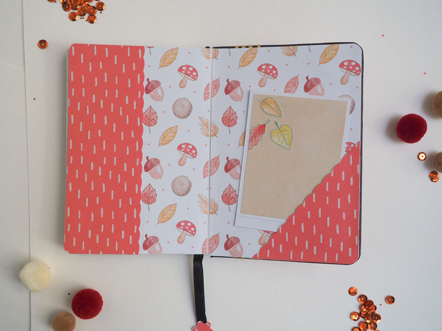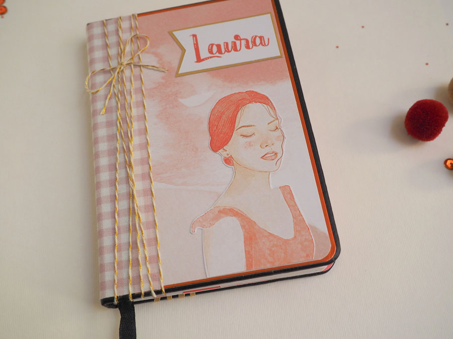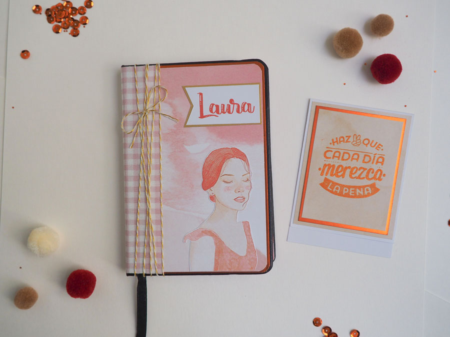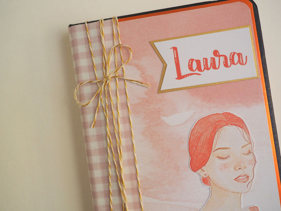 Está hecha con la colección Otoño de Laura Cyinder, que tiene unas ilustraciones preciosas. En el lomo tela de encuadernar de cuadritos y una tira de hilo de algodón dorado atado. Un banderín con el nombre y poca cosa más! En la parte de detrás unas tiras de cartulina dorada y el sello de hecho a mano. El interior forrado con otros papeles de la colección, con bolsillos y tags con un mensajito estampado con embossing.