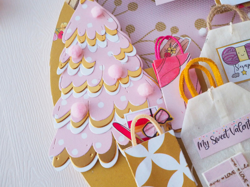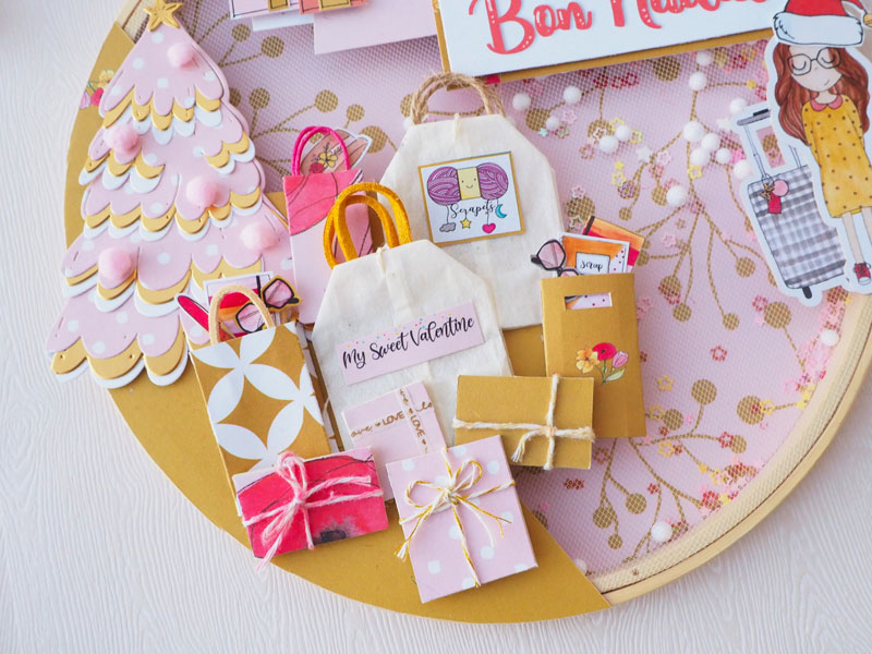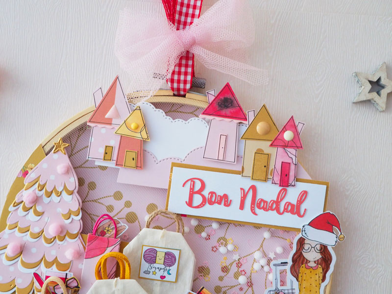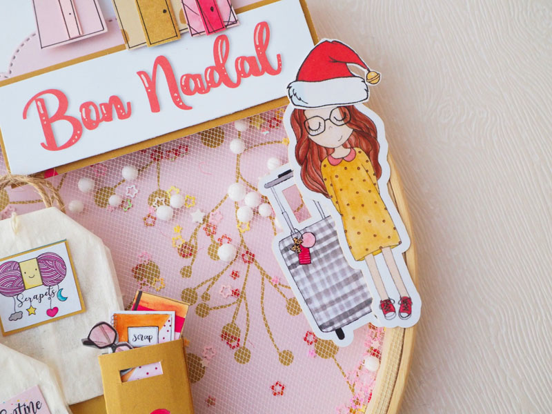 Es un bastidor shaker de navidad, hecho con la colección Piccolina Brava de My Sweet Valentine, que no es navideña pero es tan versátil que sirve para cualquier ocasión. Va relleno de bolitas de nieve y lentejuelas de estrellitas. En la parte de arriba lleva unas casitas hechas a mano con diferentes retales de la colección, y una tira de papel con «Bon Nadal» (Feliz Navidad en catalán)… abajo a la izquierda un árbol de Navidad hecho con el troquel de Lora Bailora, combinando cartulina dorada con un papel Piccolina y blanco. Unos pompones simulan las bolas del árbol… y debajo del árbol muchas bolsas hechas con retales y con dos bolsitas de té 🙂 Y como no, nuestra piccolina con un gorrito de Navidad!