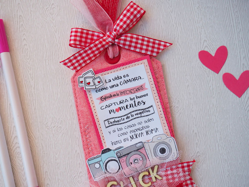 En la parte de abajo del tag he cosido un par de trozos de lazo, uno de vichy y otro de saco rojo y encima un trozo de tul. Luego he puesto las letras en madera «CLICK» también cosidas. Unas cámaras recortadas y unos lazos arriba. Ya veis que es muy sencillo pero queda muy resultón 🙂