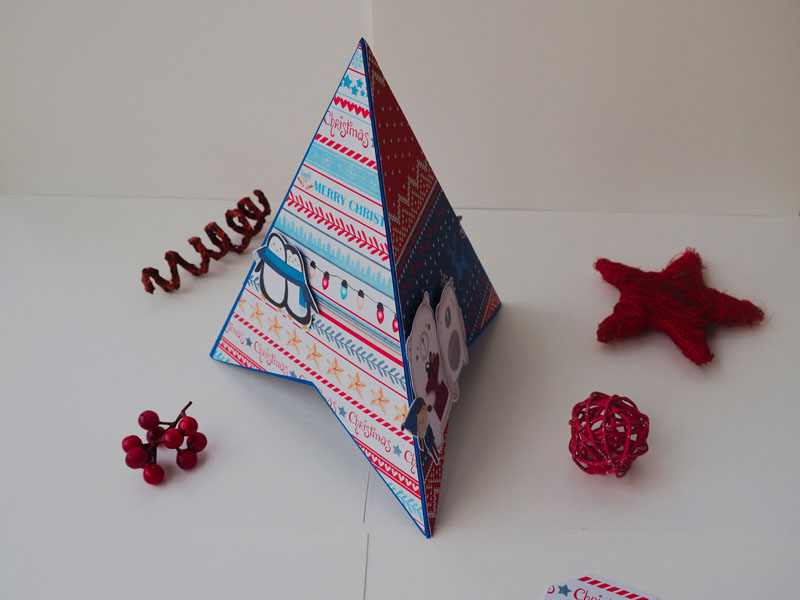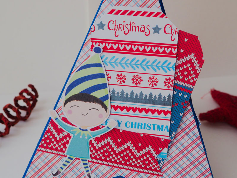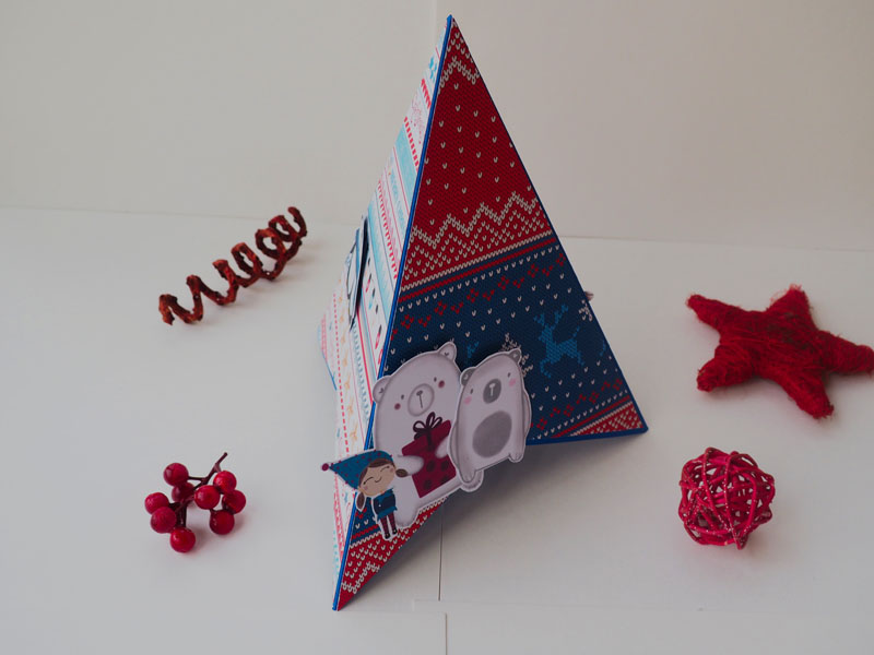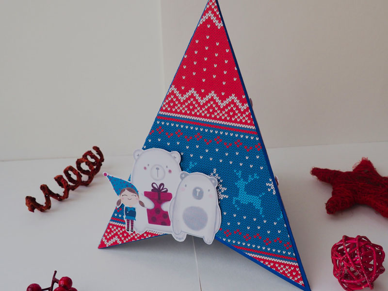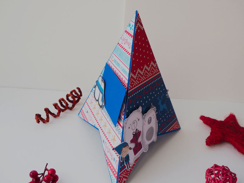 La base está hecha con cartulina azul marino, y está decorada con papel de navidad de la colección Christmas Tale de Kora y recortes de la colección Estrella Polar de Sweet Möma…