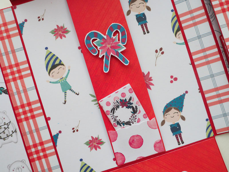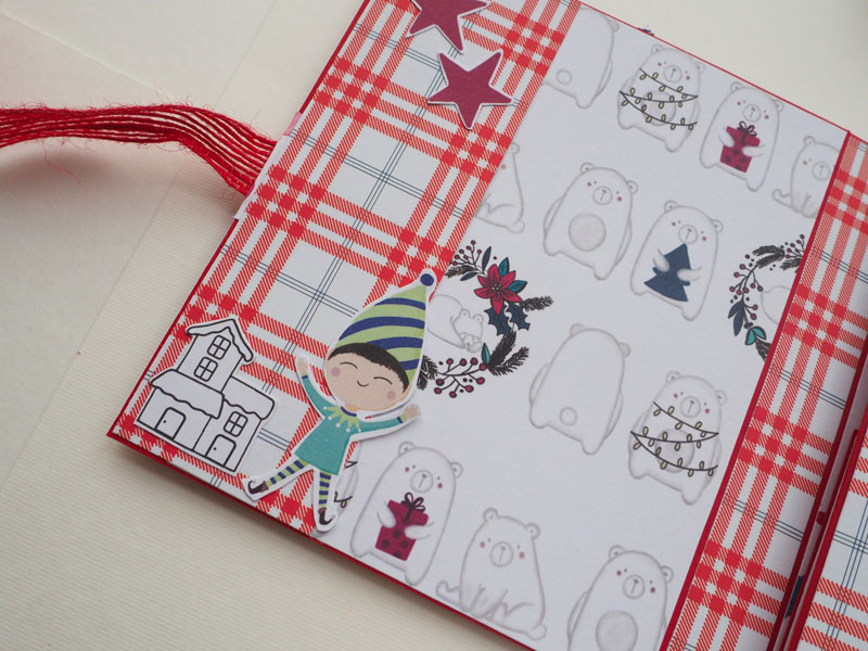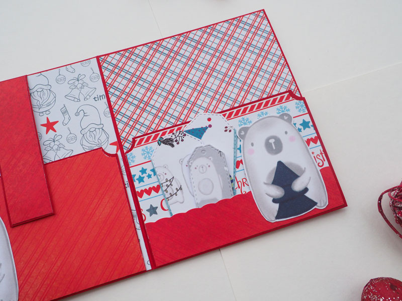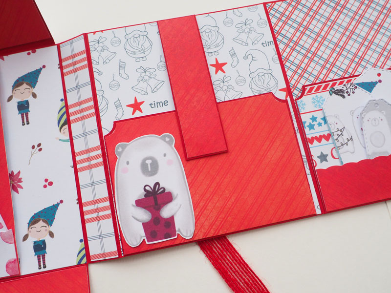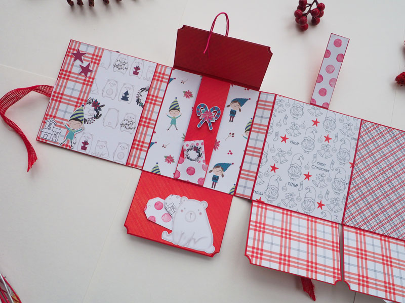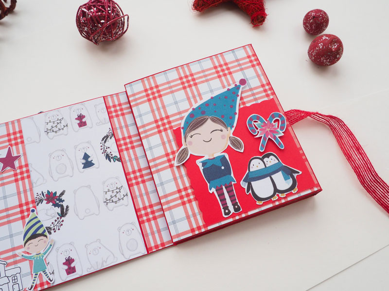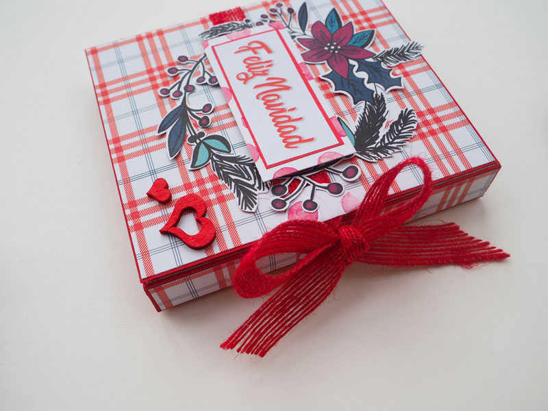 Se trata de un desplegable muy sencillito, hecho con la colección Estrella Polar de Sweet Möma y Christmas Tale de kora Projects. La estructura en rojo, y forrado con un papel de cuadritos muy navideño. En la portada una corona de flores y muérdago, y encima un cartelito que dice «Feliz Navidad»… para completar la decoración un par de corazones de madera. De cierre un lazo de arpillera también en rojo. Por dentro bolsillos y desplegables que cierran con imanes… Por aquí os dejo las fotos y en instagram tenéis un vídeo por si queréis ver mejor el interior.
