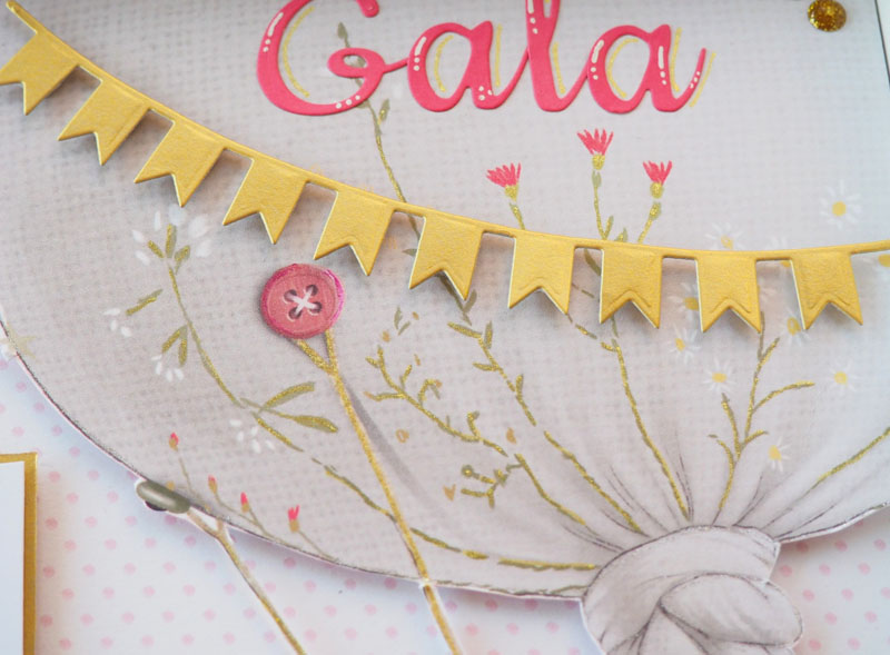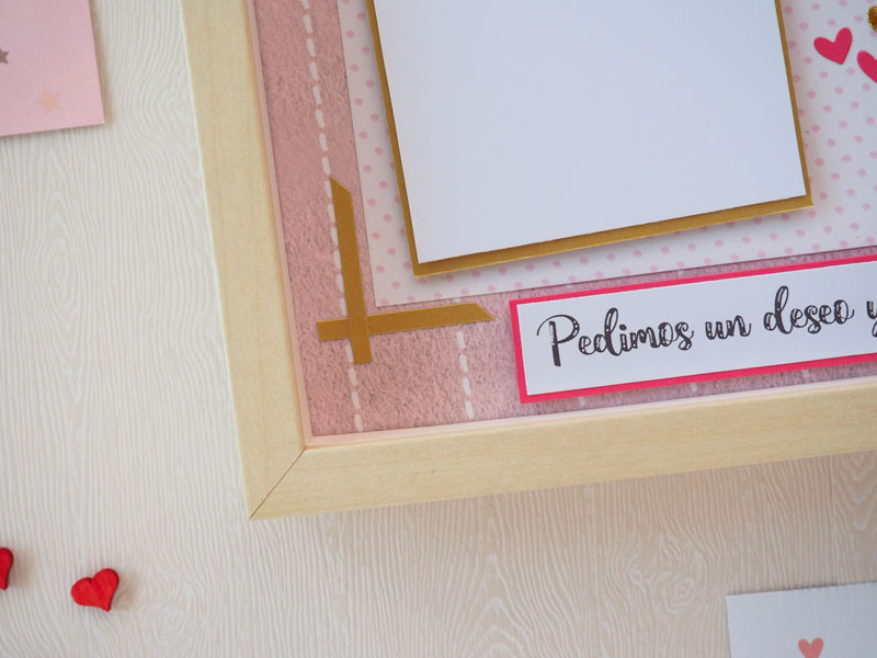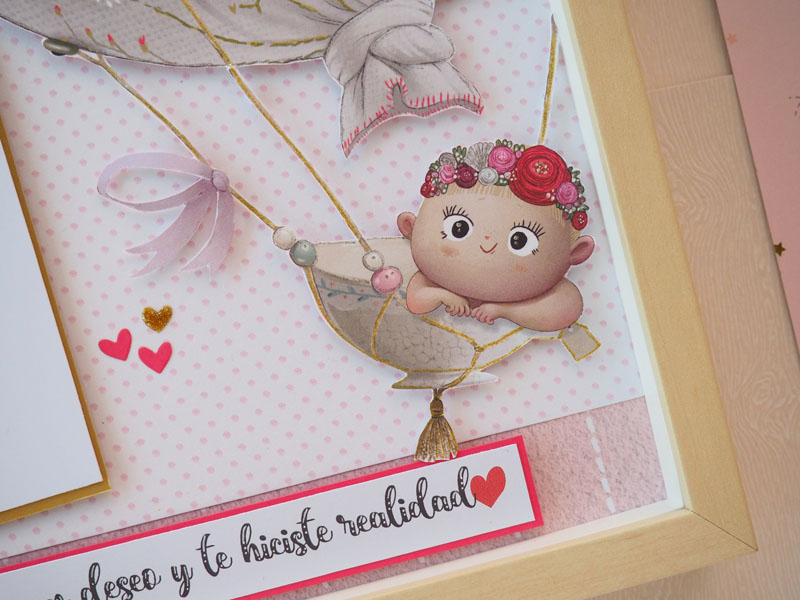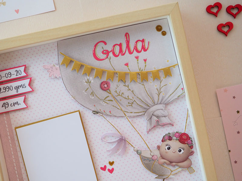 El marco de 23×23 es de ikea, y al ser bastante ancho permite dar volumen al layout interior. He utilizado unos papeles de la colección Mi Princesa de Amelie Prager que llevan unos dibujos muy cukis, y los he combinado con algún detalle de cartulina dorada. Para la base he escogido un papel blanco con puntitos rosas y una esquina con papel rosa para darle contraste. El globo es un trozo de otro de los papeles de la colección, simplemente lo he recortado y pegado con foam para darle un poco de volumen, y le he dado algunos toques con un rotulador de purpina dorada. El nombre troquelado en cartulina, unos banderines con la fecha de nacimiento, el peso y medidas del bebé, y una frase: «Pedimos un deseo y te hiciste realidad». Por último una foto de Gala, una bebé preciosa y al final es la protagonista del cuadro: