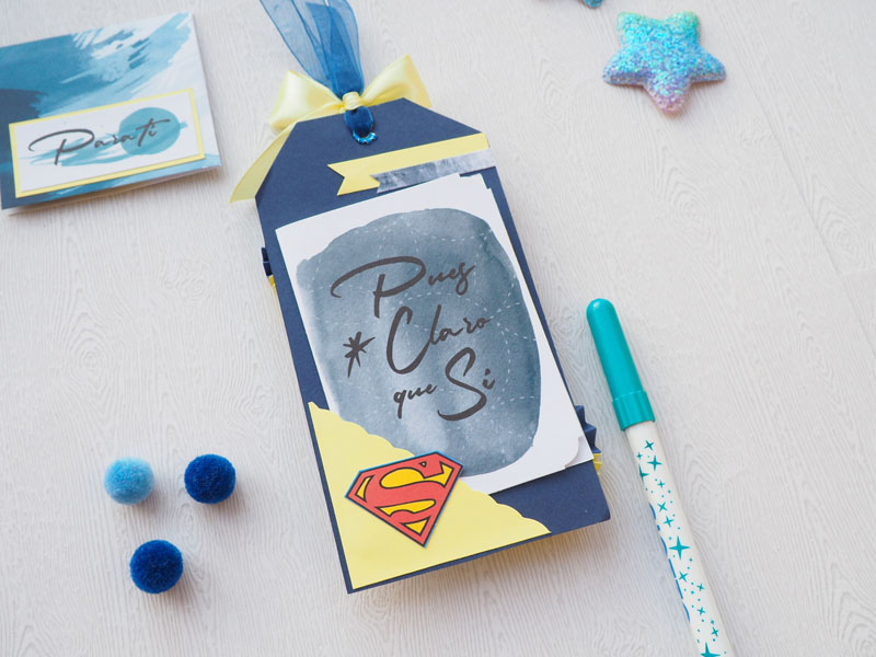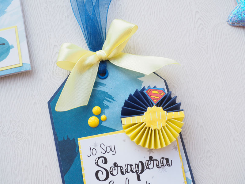 Una base de cartulina azul marino y recortes de la colección Boro de Paperinky. Los rosetones en azul y amarillo con el logo de Superwoman pegados en la parte de arriba. Un lazo de raso amarillo con lazo de organza azul y unos dots. Por detrás un bolisllo con una tarjetita y una dedicatoria… Y eso es todo! ¿Que os parece, ha quedado cuki, no?