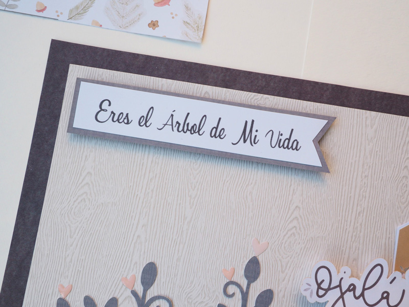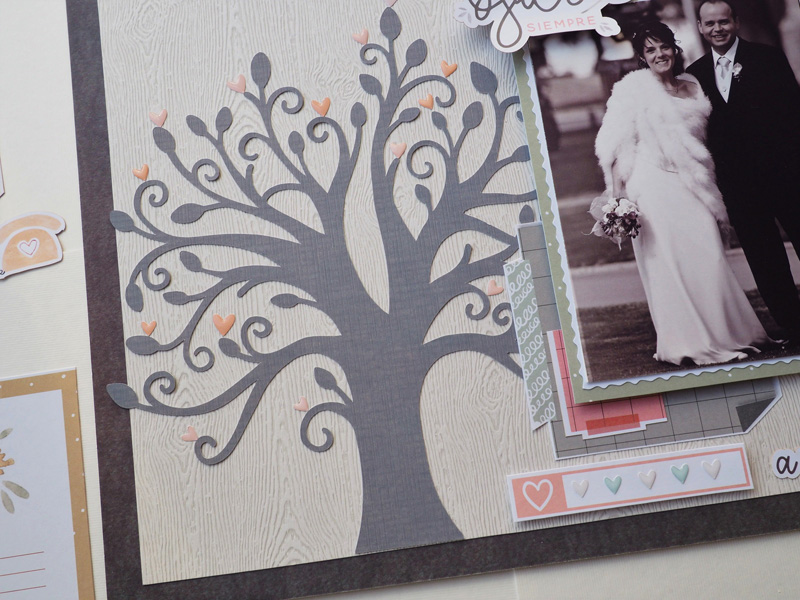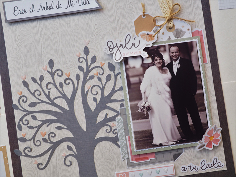 Sofía quería poner la frase «Eres el árbol de mi Vida» y también quería un árbol, así que la idea es suya, y la verdad es que lo demás ha sido muy fácil… Unos recortes de papel, unos die cuts, unos tags con lazos de cuerda y poca cosa más. El árbol es un archivo de corte de Silhouette y lleva tantos corazones como años llevan casados. Y los corazones que hay debajo de la foto son los años que fueron novios… quería darle algún sentido a las hojas del árbol