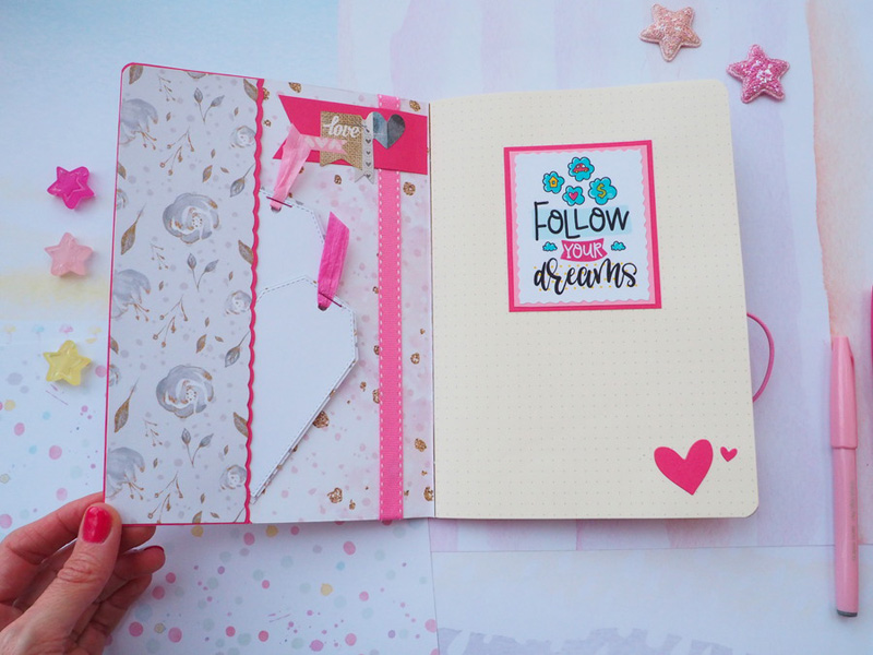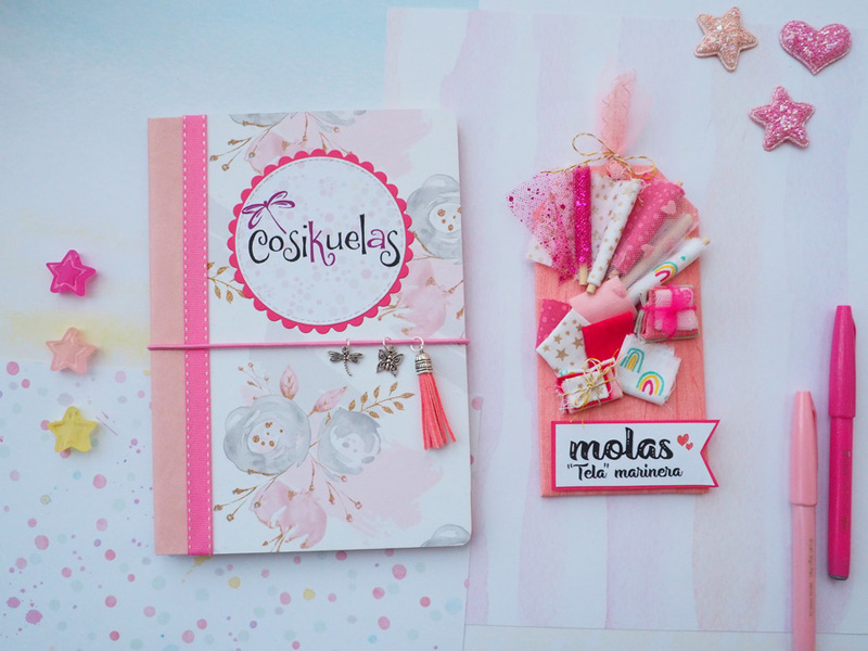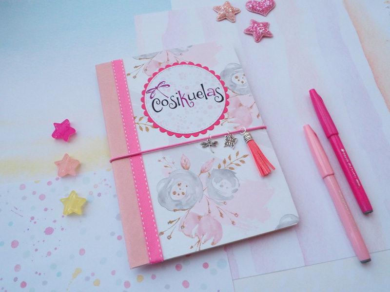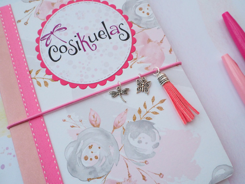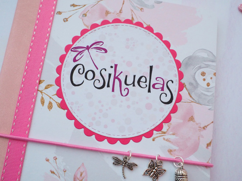 Es una mini libretita decorada con papel de la colección Special events de Amelie-Orita. En el lomo lleva tela de encuadernar y un lazo rosa. El título «Cosikuelas» que es el nombre de Bea en redes sociales. De cierre una goma con un tassel y unos charms colgados (uno de los charms es una libélula igual que lleva el logo de Bea, aquí todo tiene una razón 🙂 )… Por dentro unos bolsillos con tags y un mensajito que dice: Follow your dreams… espero que os guste, mirad las fotos: