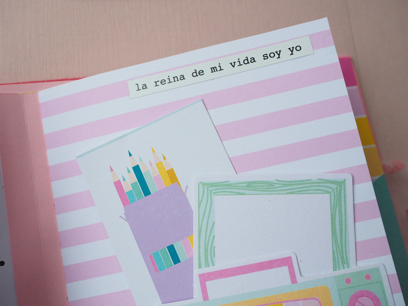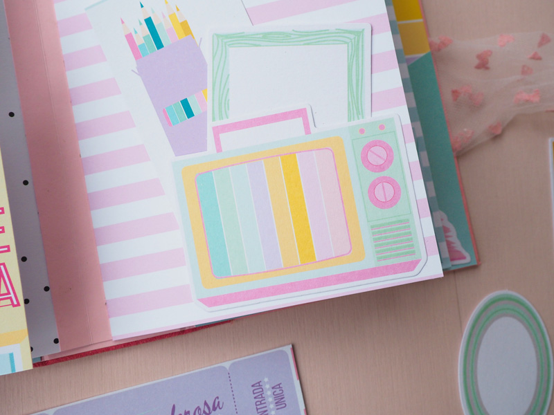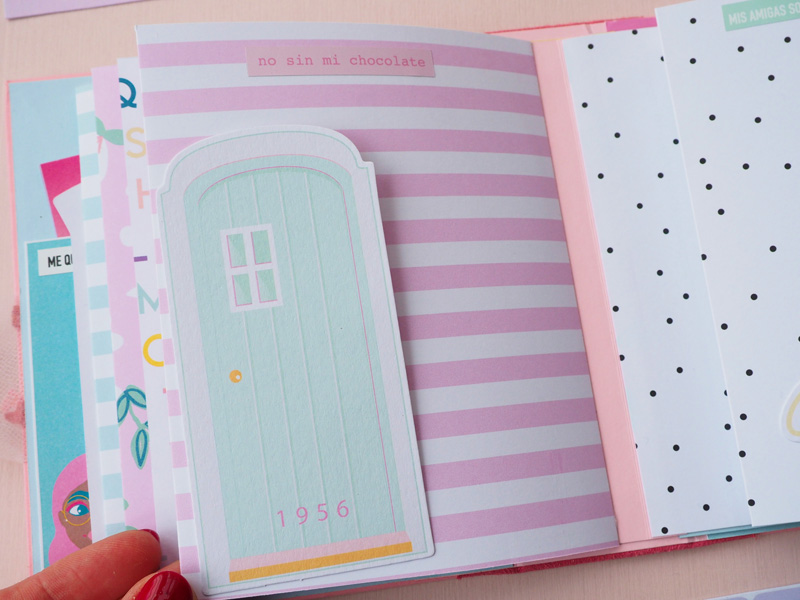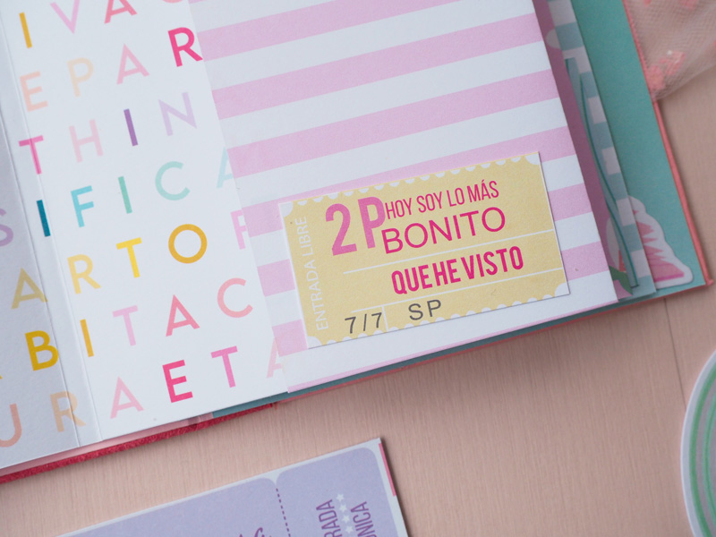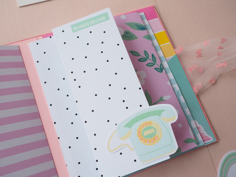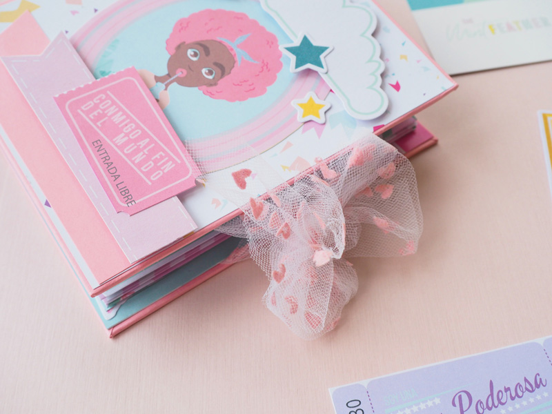 Como os decía al principio, para hacer el álbum he utilizado restos de la colección de Adela, antelina para el lomo, cartulina rosa y un trozo de tul de corazones para el cierre… En la portada he combinado un marco con unos diecuts encima de un papel estampado. El interior con espina vista y las hojas con desplegables y bolsillos… muy sencillito porque como os digo ha sido un álbum express, que tenía que entregar hoy mismo 🙂 En los bolsillos tarjetitas y die cuts de la misma colección… pero mirad mirad, a ver que os parece…