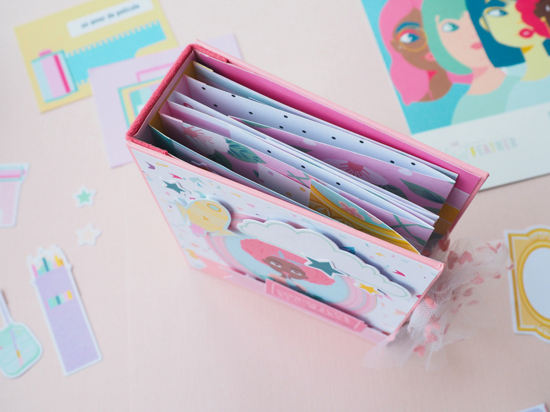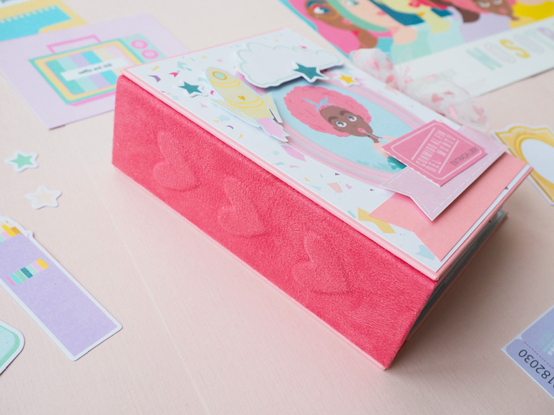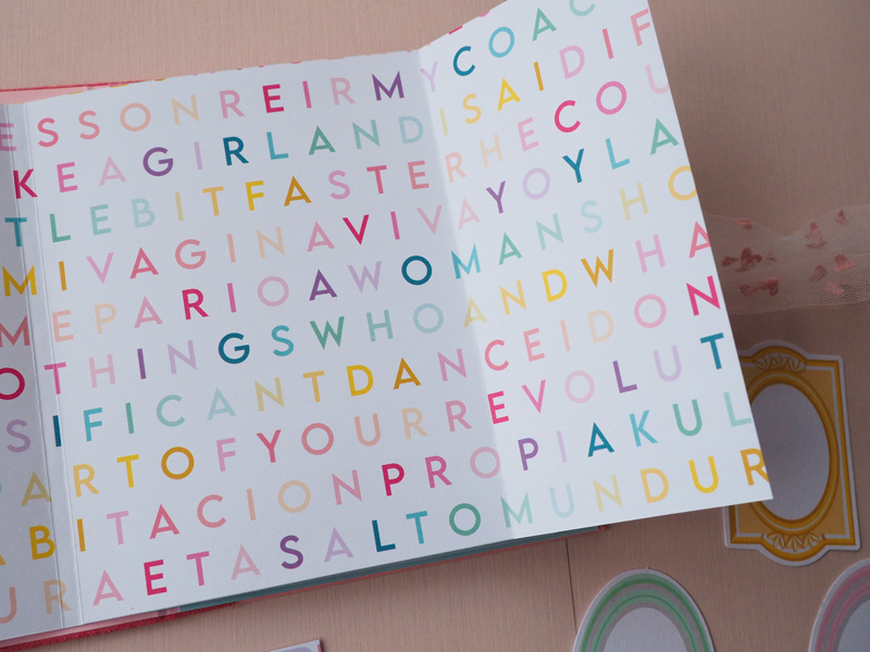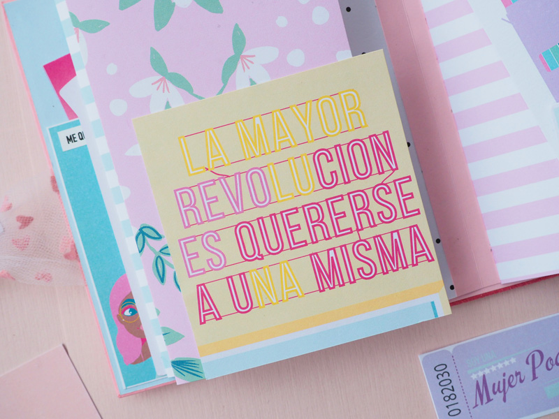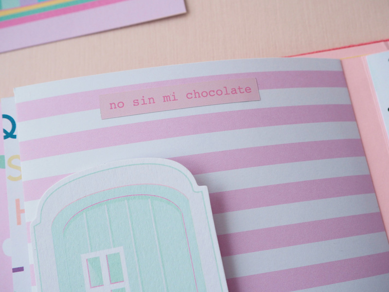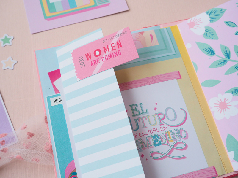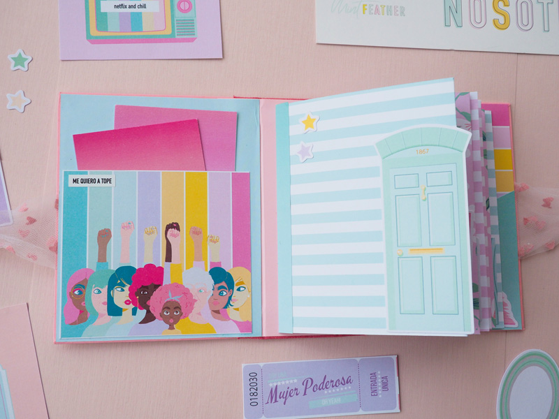 Como os decía al principio, para hacer el álbum he utilizado restos de la colección de Adela, antelina para el lomo, cartulina rosa y un trozo de tul de corazones para el cierre… En la portada he combinado un marco con unos diecuts encima de un papel estampado. El interior con espina vista y las hojas con desplegables y bolsillos… muy sencillito porque como os digo ha sido un álbum express, que tenía que entregar hoy mismo 🙂 En los bolsillos tarjetitas y die cuts de la misma colección… pero mirad mirad, a ver que os parece…