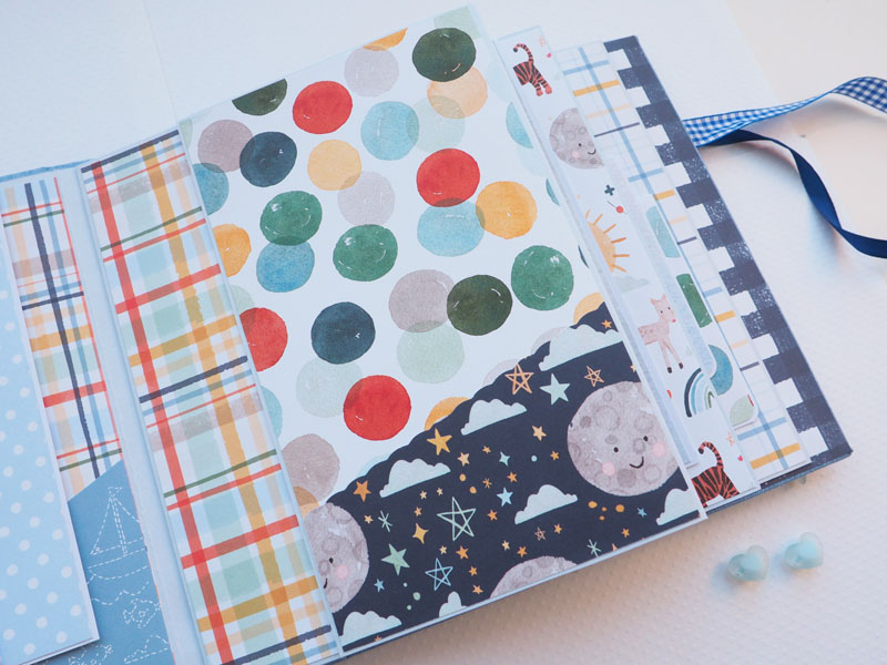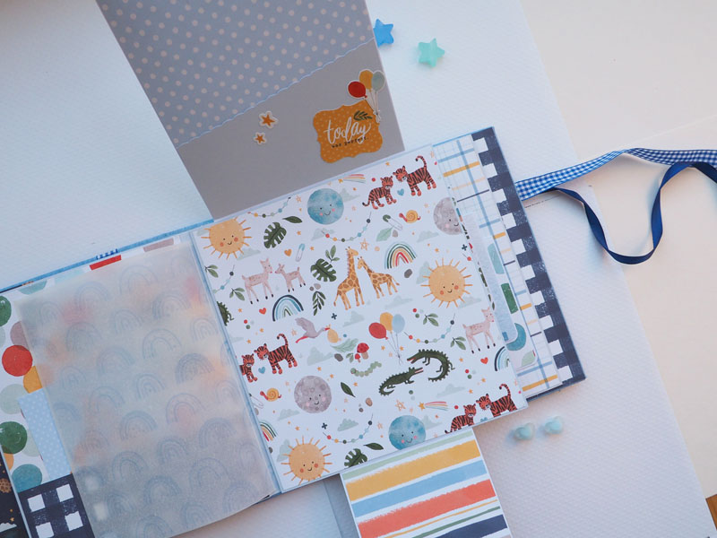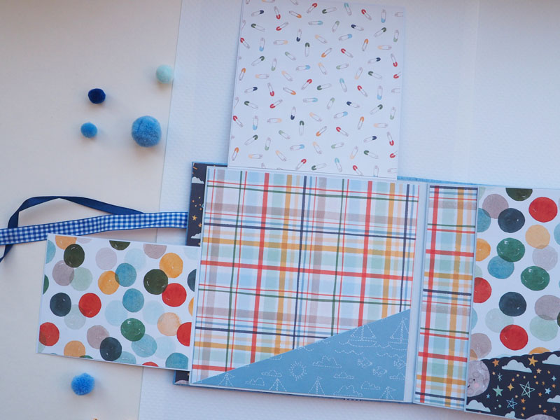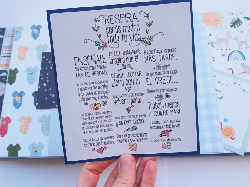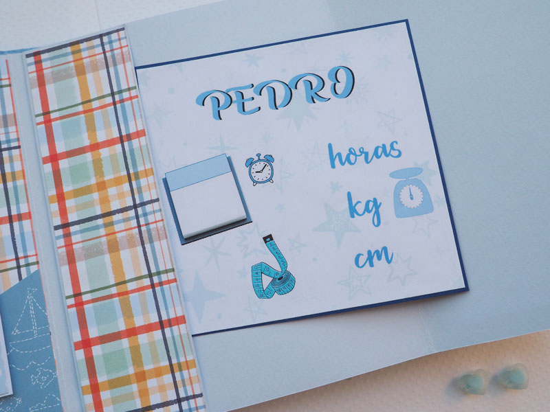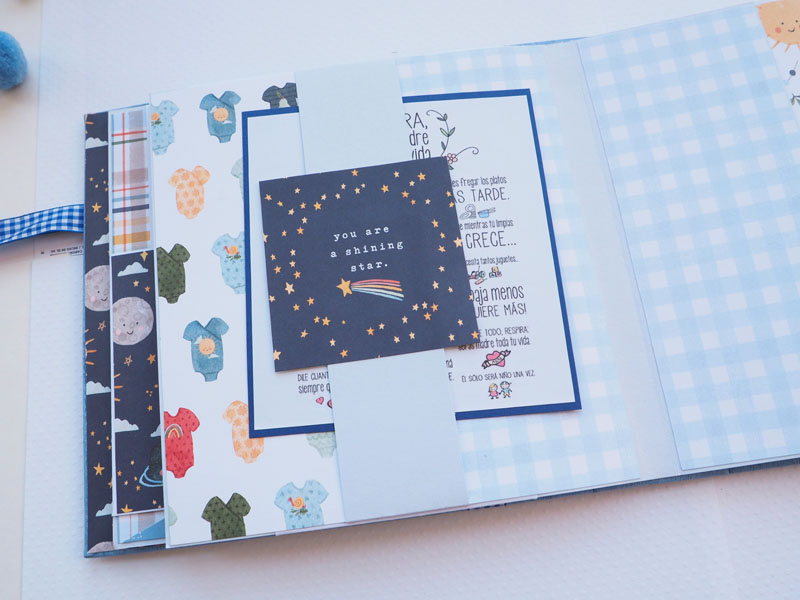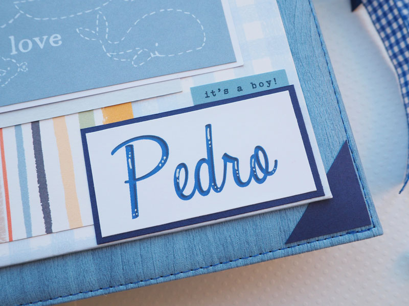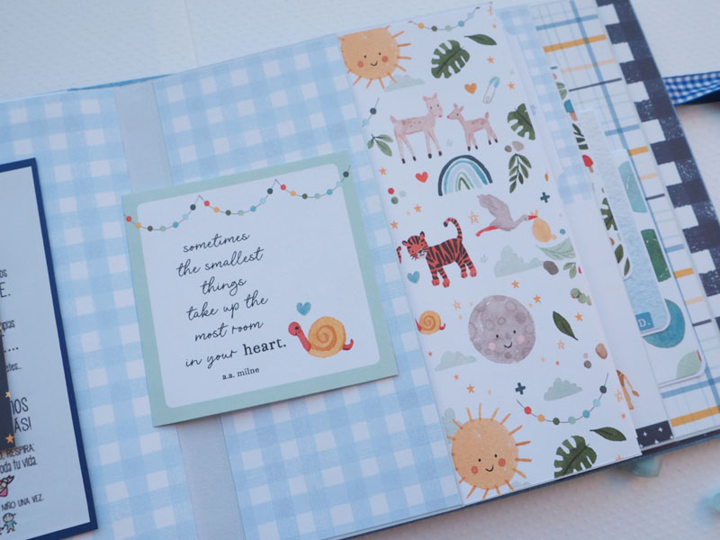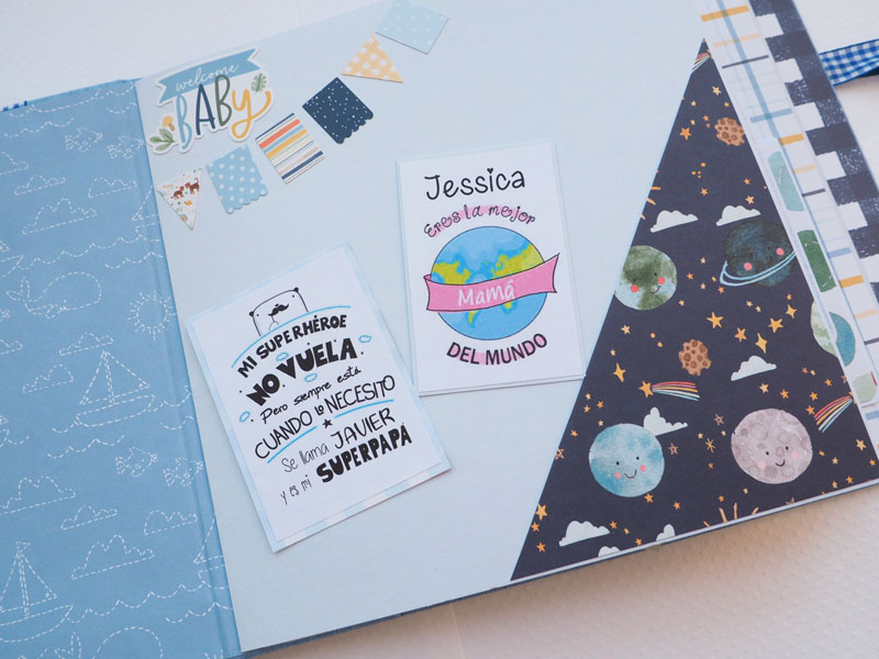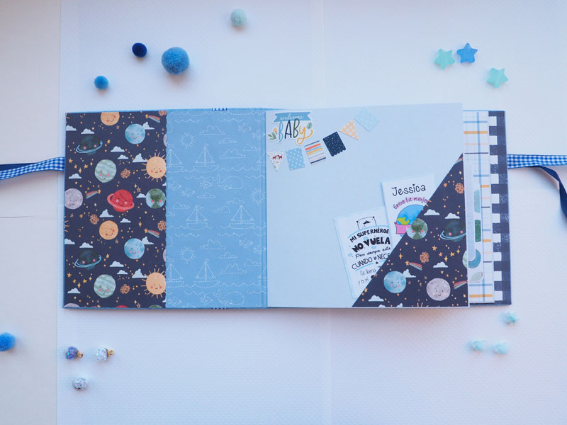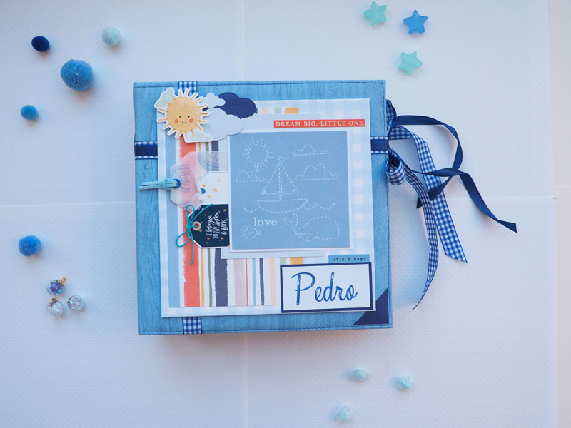 Es un álbum de bebé hecho con la colección «Welcome baby boy» de Echo Park, forrado con ecopiel azul y con encuadernación de espina. Por dentro con bolsillos y desplegables, una cascada… Es una colección muy potente pero muy divertida para bebé. Se sale de lo habitual, de colores suaves y tonos pastel, pero lo cierto es que me ha gustado el resultado… mirad las fotos a ver que os parece, y en instagram os subiré un vídeo para que lo veáis mejor: