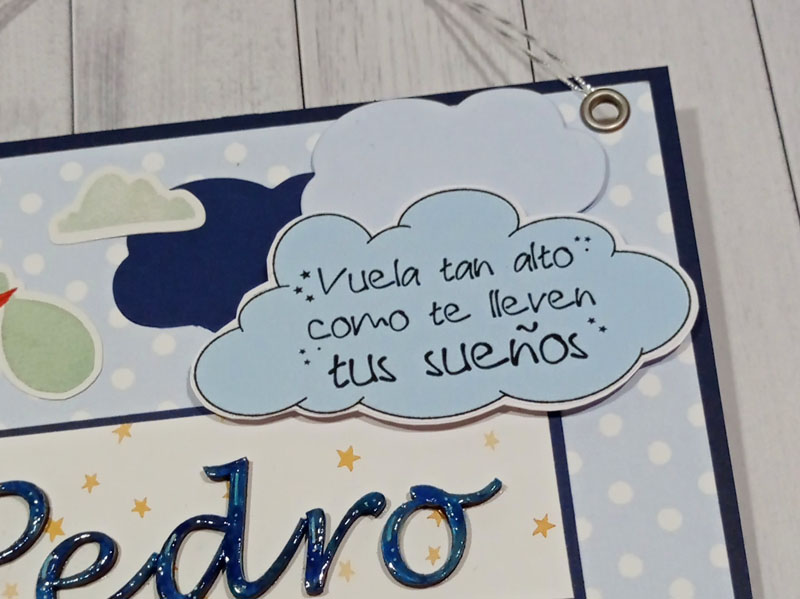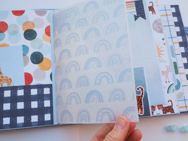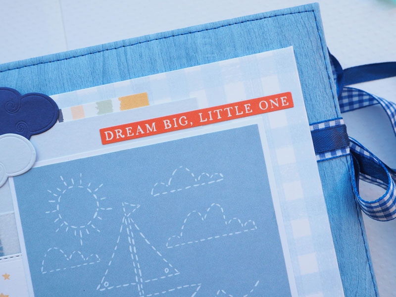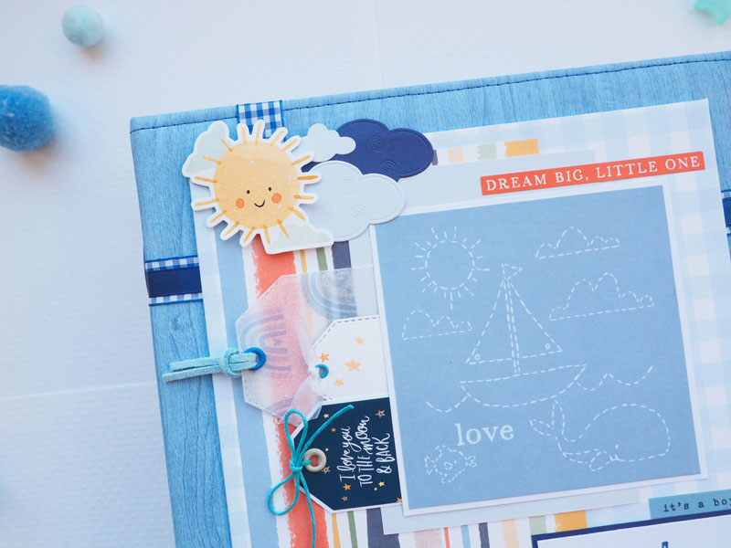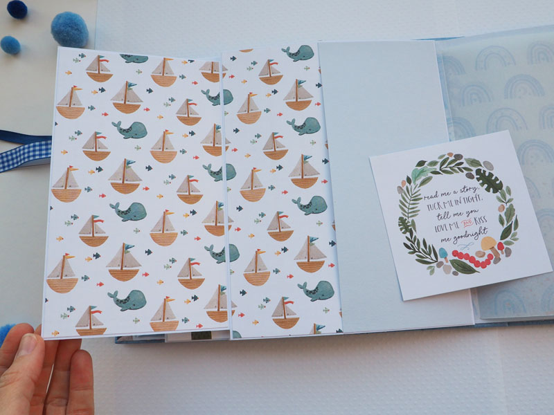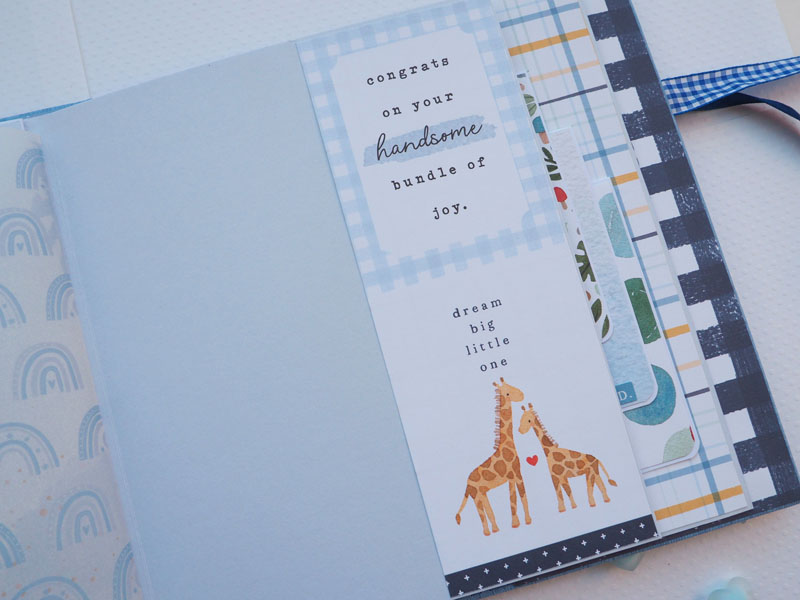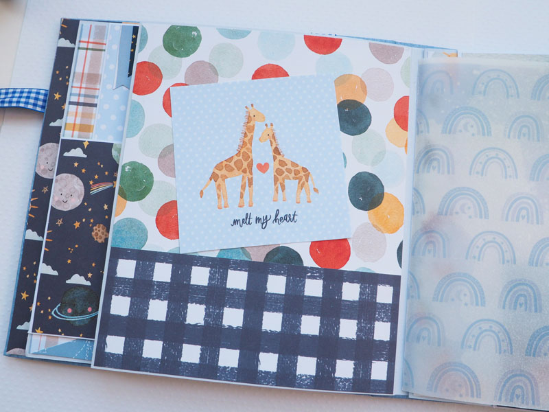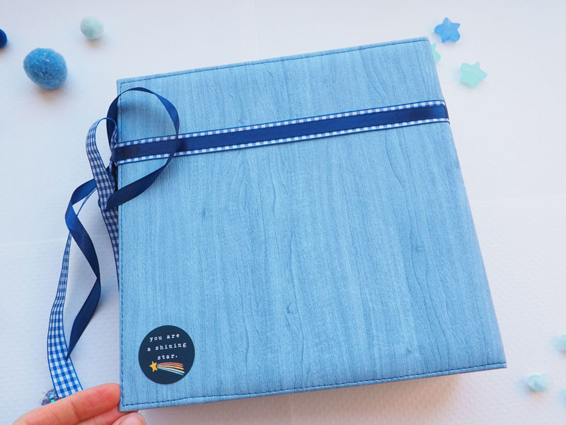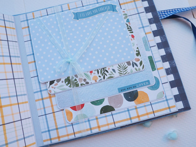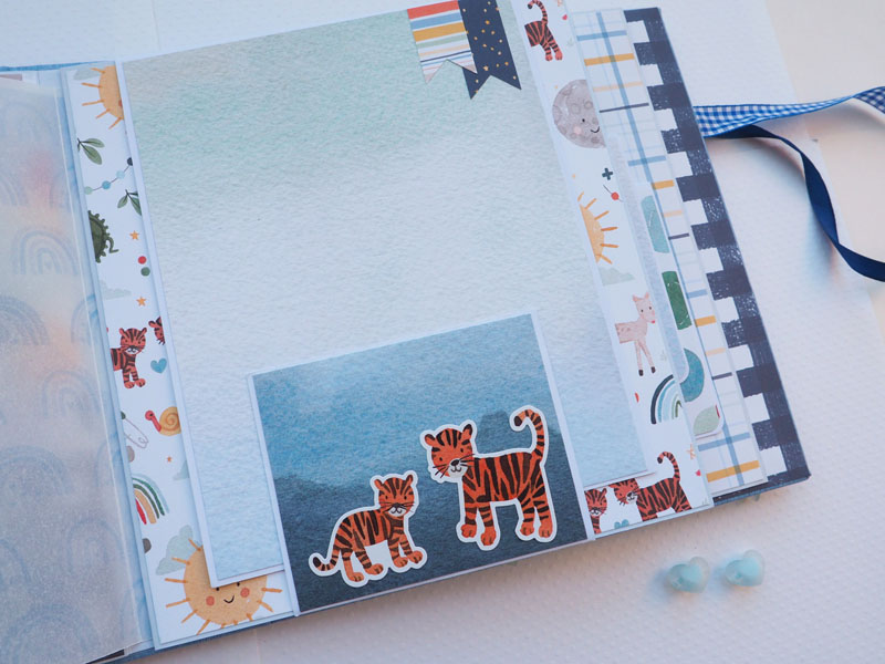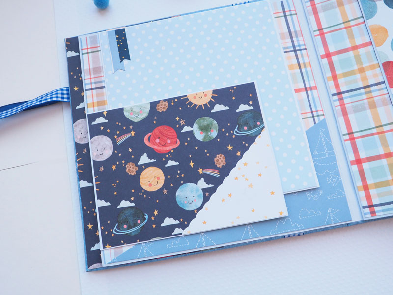 Es un álbum de bebé hecho con la colección «Welcome baby boy» de Echo Park, forrado con ecopiel azul y con encuadernación de espina. Por dentro con bolsillos y desplegables, una cascada… Es una colección muy potente pero muy divertida para bebé. Se sale de lo habitual, de colores suaves y tonos pastel, pero lo cierto es que me ha gustado el resultado… mirad las fotos a ver que os parece, y en instagram os subiré un vídeo para que lo veáis mejor: