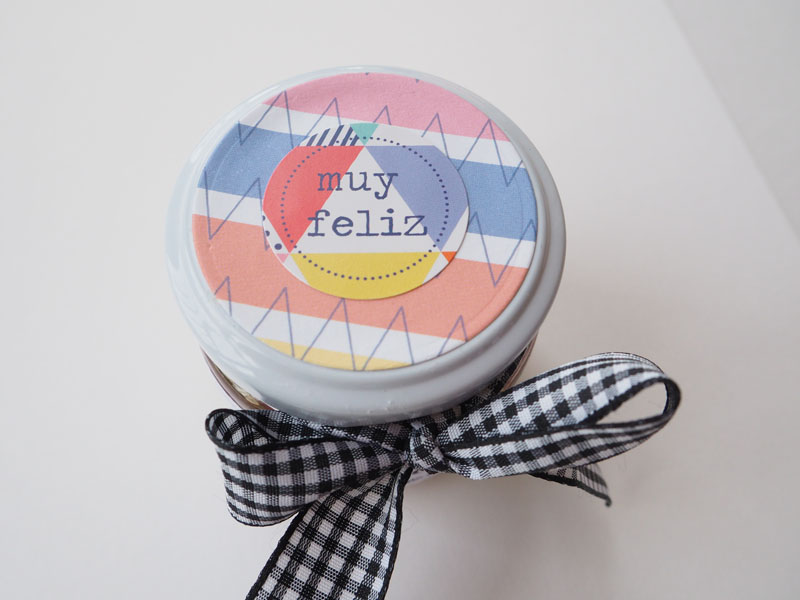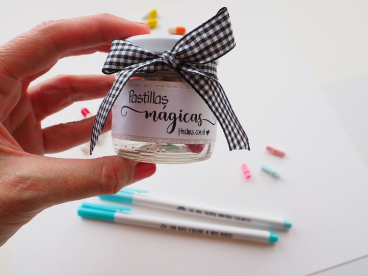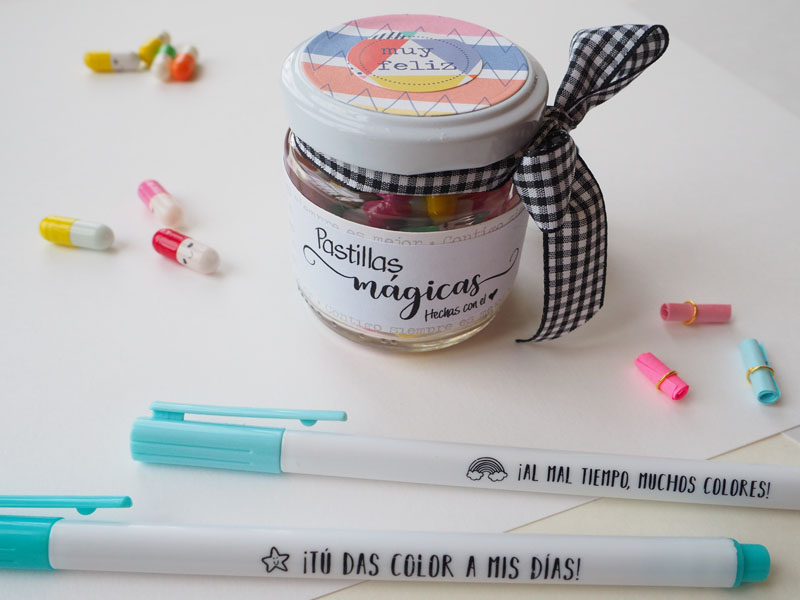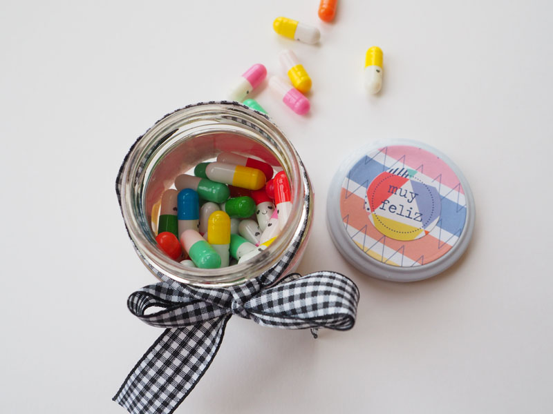 Pues bien, tan solo hay que rellenar las cápsulas con los papelitos y decorar un bote para meterlas. Yo he usado un mini bote de cristal, creo que era de mermelada. Le he puesto una tira de papel de Anita y Su Mundo alrededor y he troquelado un círculo para forrar también la tapa. Un lazo vichy blanco y negro y una pegatina que dice: «Pastillas mágicas hechas con el corazón»… espero que os guste tanto como le ha gustado a la destinataria de estas pastillas: