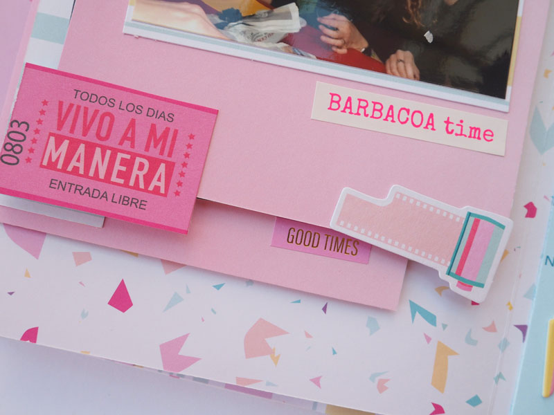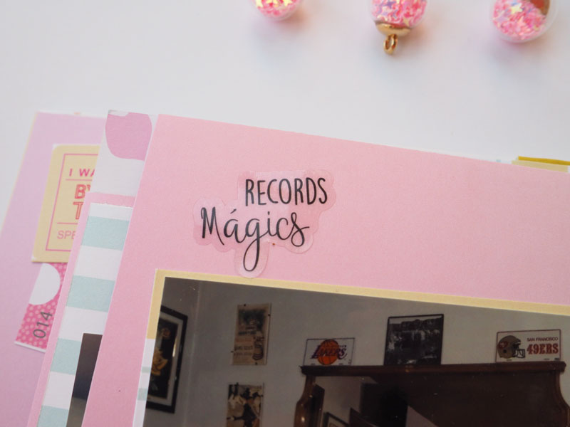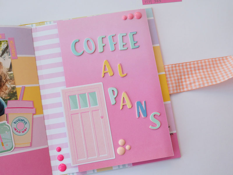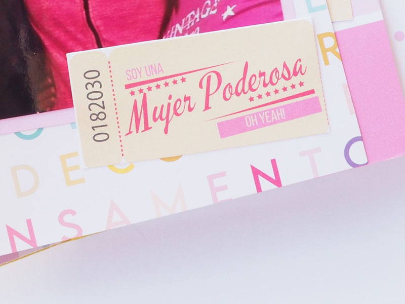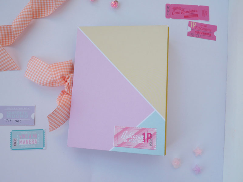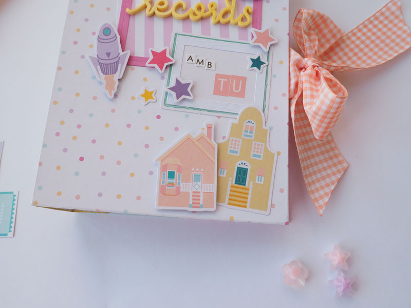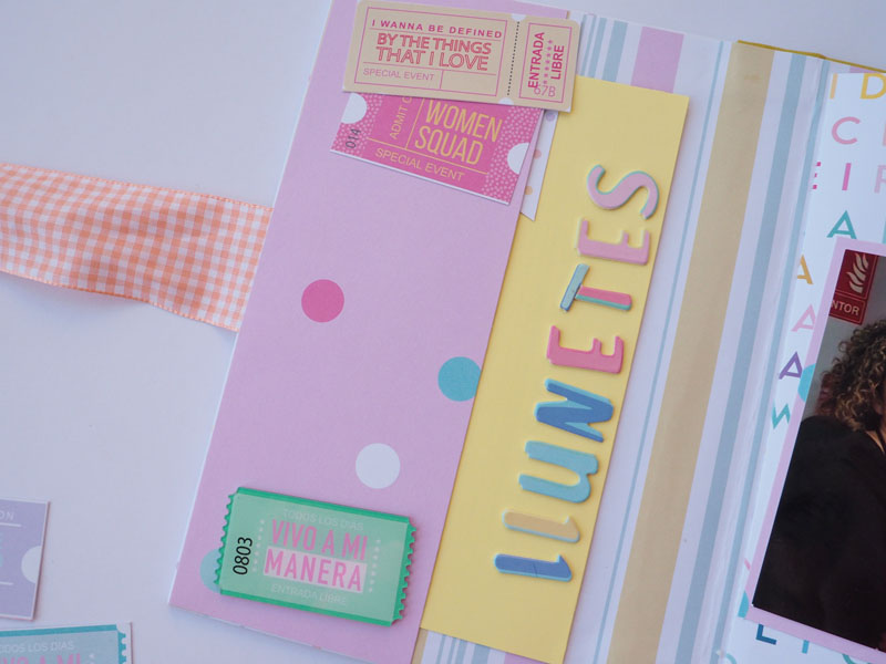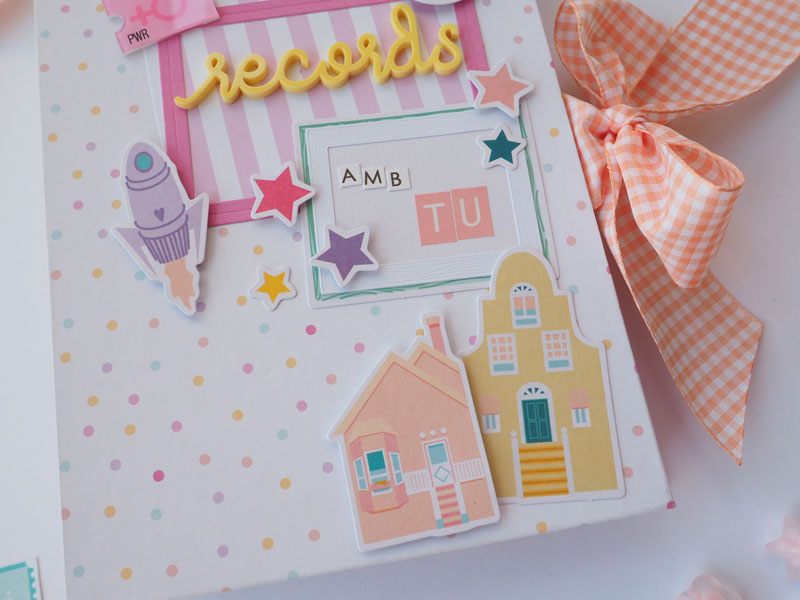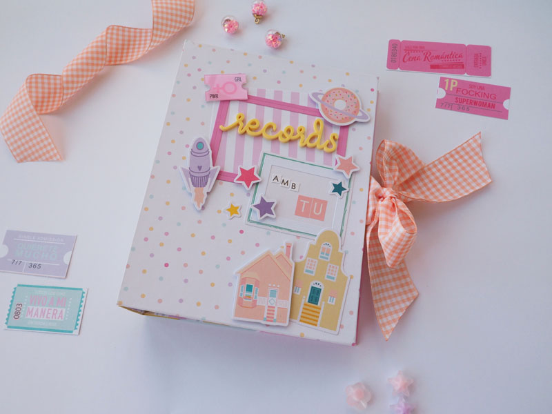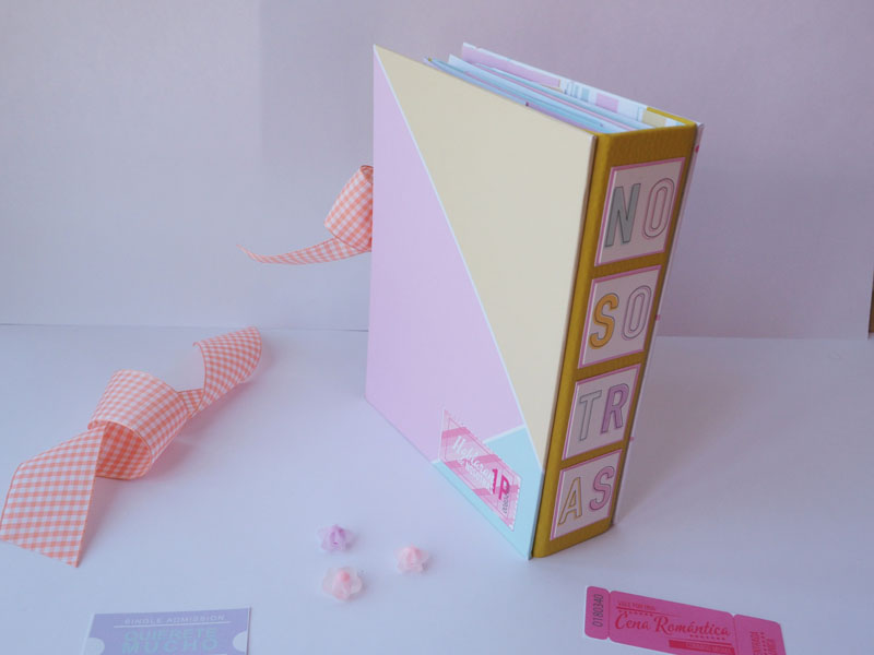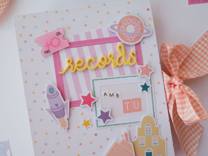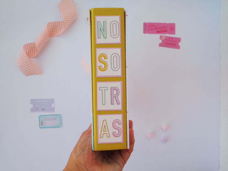Además de la colección, los die cuts y metacrilatos de la colección de Adela, he utilizado un abecedario de Mintopía que le va a juego porque tiene los mismos tonos. Un lazo vichy de cuadritos naranjas para el cierre, la palabra «Records» en metacrilato de Sweet Moma, un poco de washi tape y poco más. Para el lomo he recortado las letras del título de la colección: «NOSOTRAS» porque creo que no podía poner un título mejor.