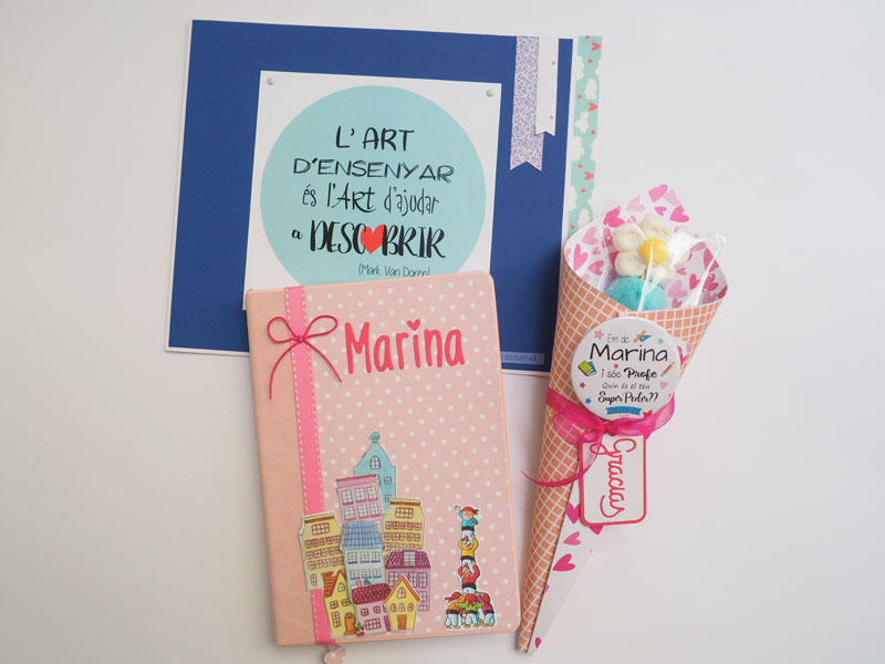 A la libreta le acompañaban otros detallitos de regalo… una postal con una frase de Mark Van Doren que dice: «El arte de enseñar es el arte de enseñar a descubrir», y una chapa personalizada que dice: «Me llamo Marina, soy profe… ¿Cual es tu súper Poder?»… La chapa presentada de una manera muy original: un cono de papel decorado de la colección Gigi et Moi, una brocheta de chuches en su interior y la chapa pinchada delante. Para acabar de decorar con un lazo de organza rosa fucsia y un mini tag troquelado de «Gracias».