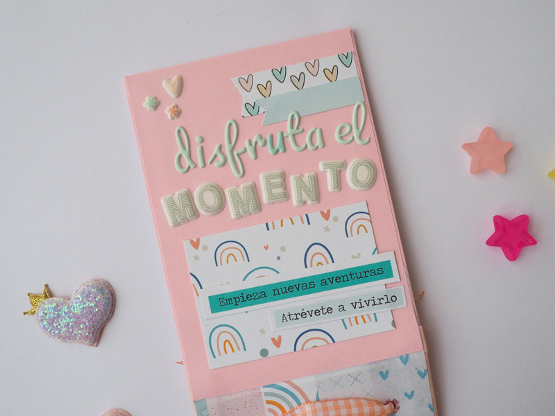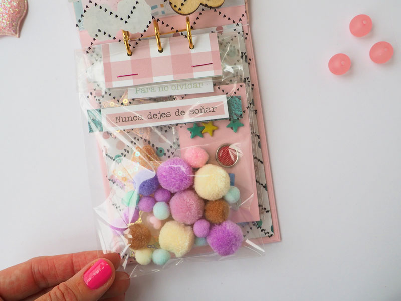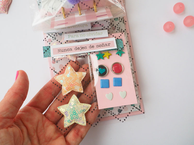 Súper sencillo de hacer, una vez hecha la estructura he colocado unas anillas en la parte superior, para que la carpeta sea en vertical. Un lazo de cuadritos vichy en el lomo, y la portada decorada con unos tags y unos puffys de la misma colección. Las hojas interiores son de acetato, y llevan los detallitos pegados encima: estrellas de lentejuelas, puffys y frases de la colección, detallitos en madera, brads, pompones… cositas que le van a ir muy bien para decorar el álbum a juego, que tenéis en la última foto: