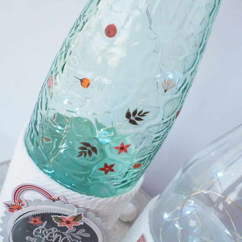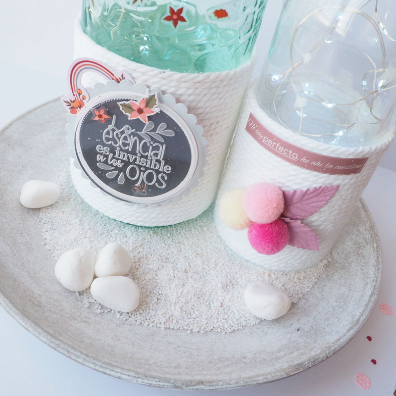 Son unas botellas de Vichy catalán, agua con gas, vamos. Las he decorado y les he puesto luz. La idea es de mi amiga Vanesa, ella siempre decora botellas y la verdad es que quedan muy bien. Son botellas muy bonitas porque llevan el cristal con relieve. Decoradas con cuerda de macramé y con la colección principitas de My Sweet Valentine.