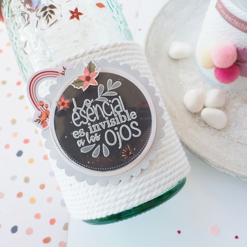 A la otra botella que no es de vichy, le he puesto debajo un trozo de acetato decorado, aunque en las fotos no se aprecia demasiado. Encima la cuerda tal como os he explicado antes y la he decorado con unos pompones y unas hojas de terciopelo en tonos rosas y grises.. en este caso la frase: «No soy perfecta, he ahí la cuestión» otra frase de las que a mí me gustan que te tocan la fibra… también de la colección Principitas…