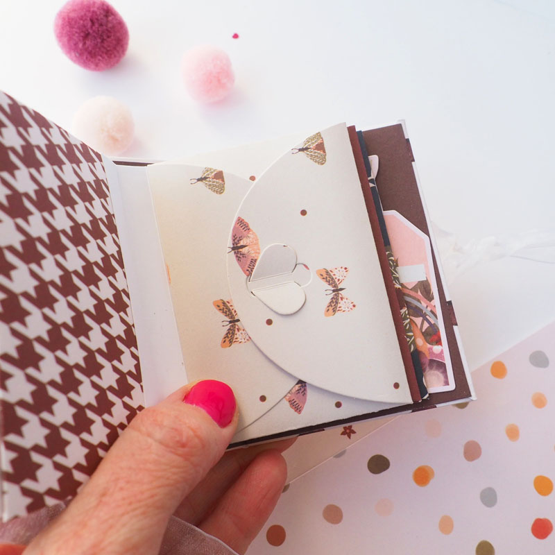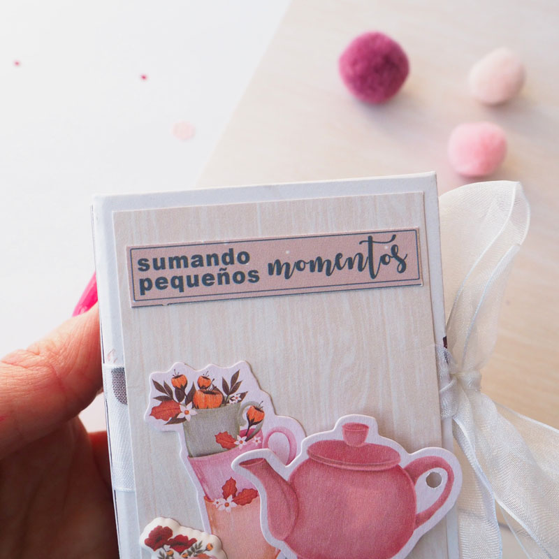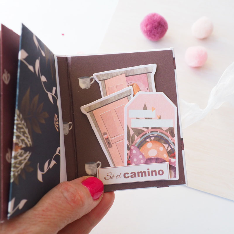 La medida del álbum de 6,5 x 8,5 cm… y el interior lleva 6 sobres hechos con el troquel de Sami Garra, que miden 5,8 x 8 cm… Pegados al lomo con unas tiras de cartulina como una espina, un lazo de cierre, algo de decoración y ya está el álbum hecho!! Súper fácil y muy cuki para regalar, quizá no para fotos porque es muy mini, pero sí para sorprender a alguien con mensajitos positivos dentro de los sobres, para regalar dinero o unas entradas de teatro o de alguna actividad… para un snail mail y enviar en los sobres chuches escraperas… o simplemente para decirle a esa persona tan especial que la quieres!! Será por utilidades que podemos darle a este mini álbum??