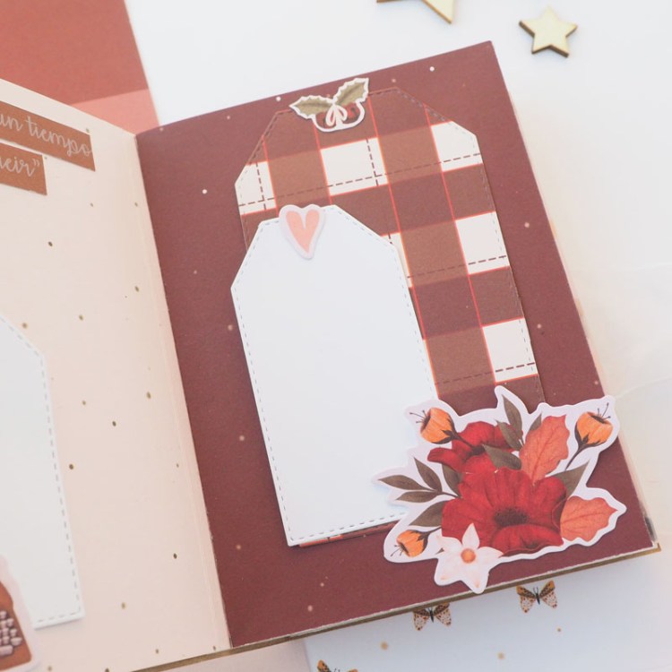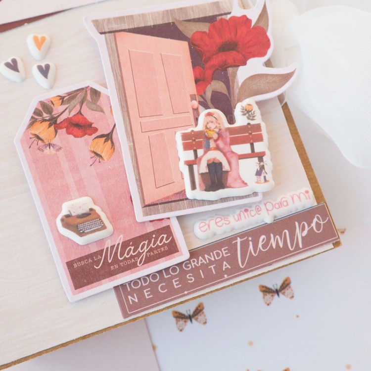 Decorar: Una vez hecho esto, ya tenemos nuestro álbum. Ahora solo nos queda decorar. Podemos hacerlo con diecuts, hacer bolsillos, poner tags para poner frases… lo que se os ocurra!!