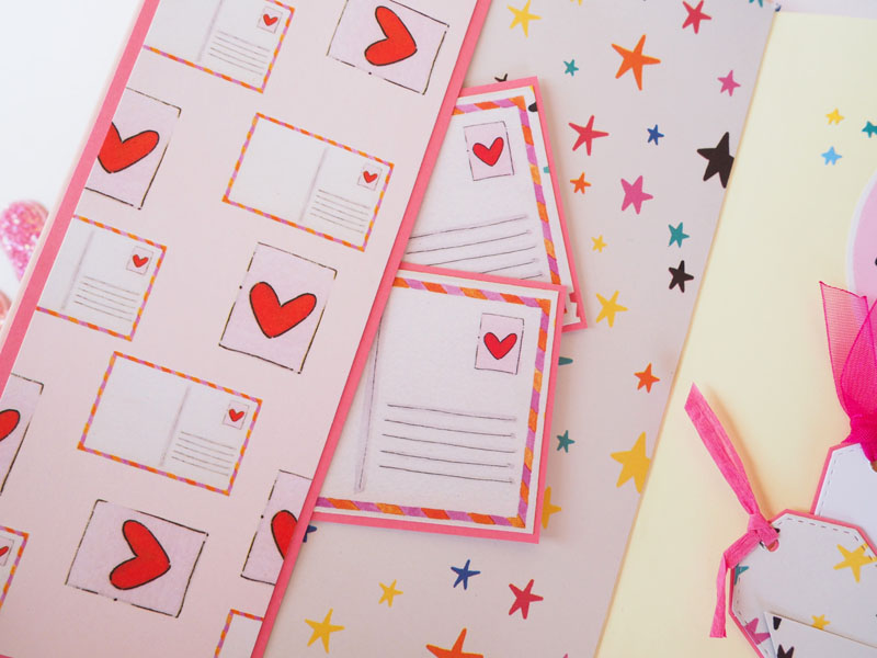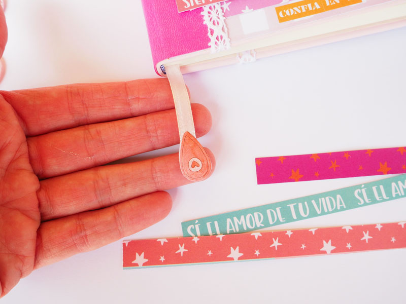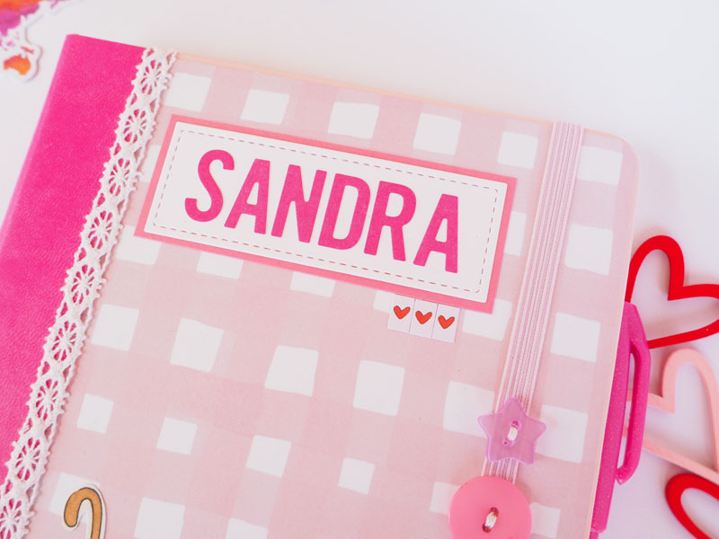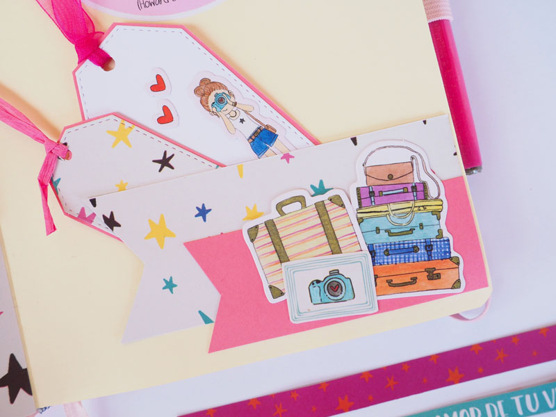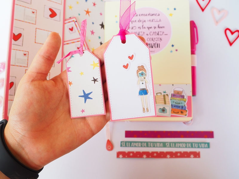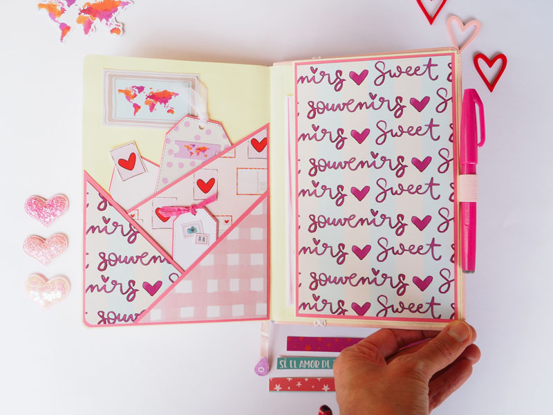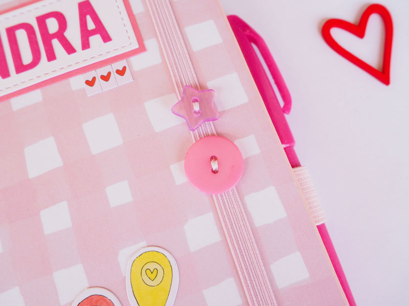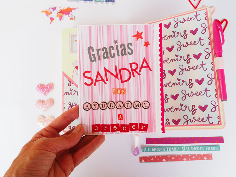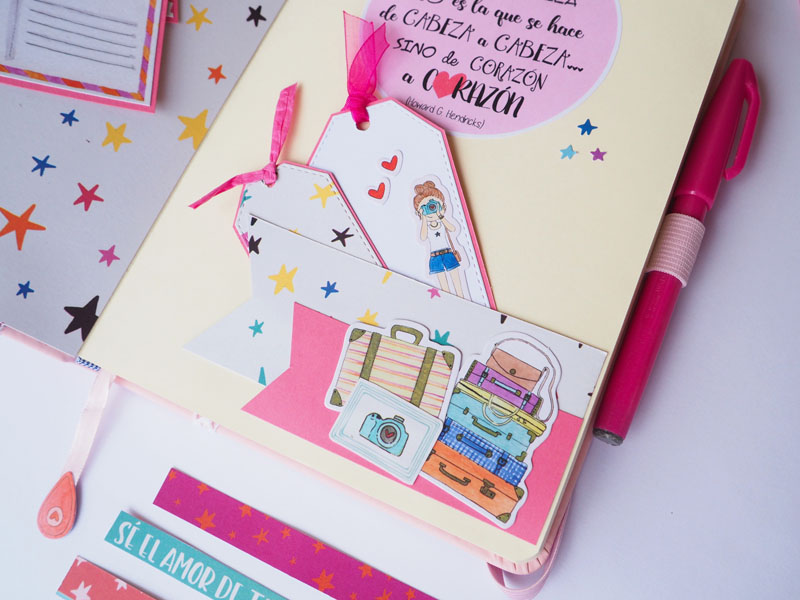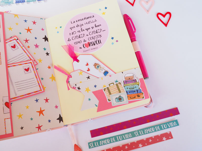 De cierre una goma con un par de botones cosidos y por dentro un bolsillo lateral, tags y una frase impresa: «La enseñanza que deja huella NO es la que se hace de cabeza a cabeza, sino de corazón a corazón»❤️ (de Howard G. Hendricks)… En la contraportada unos bolsillos cruzados con más diecuts y tags decorados…