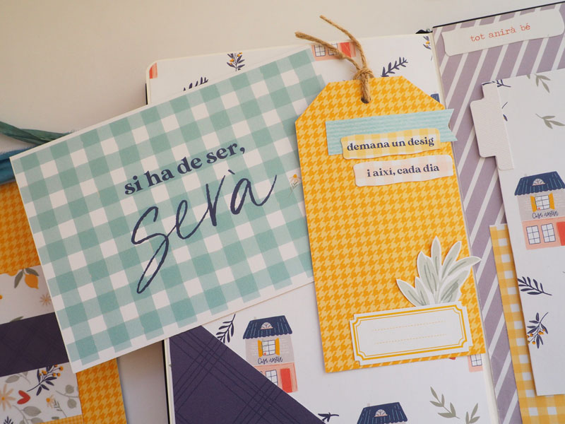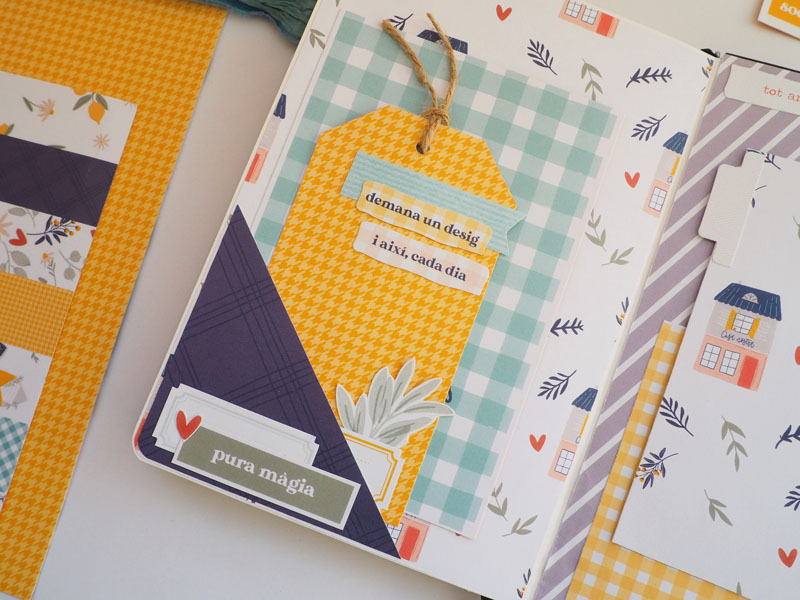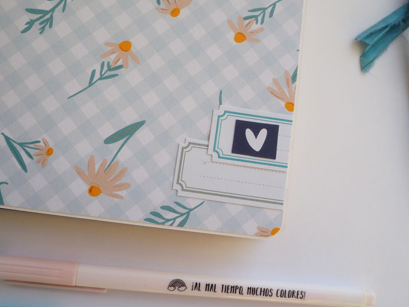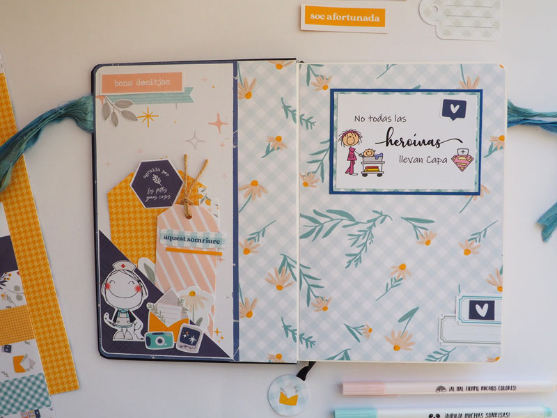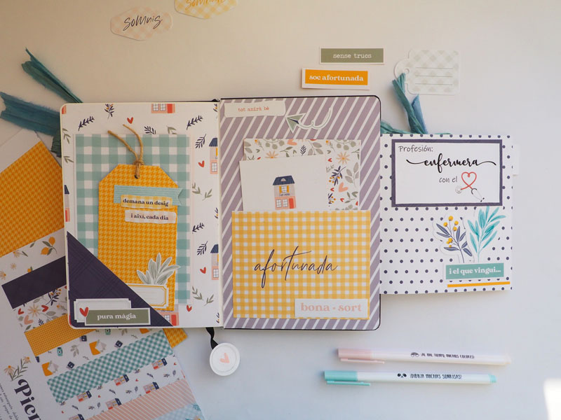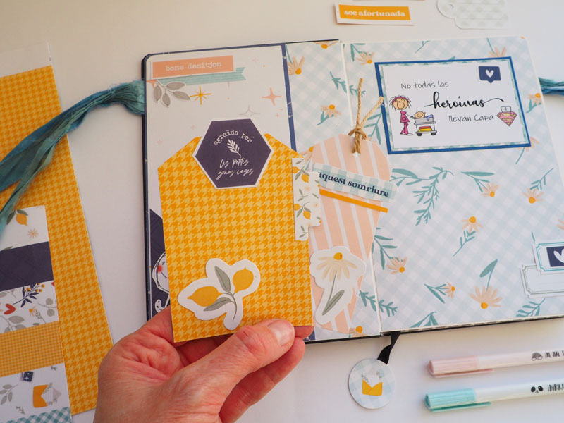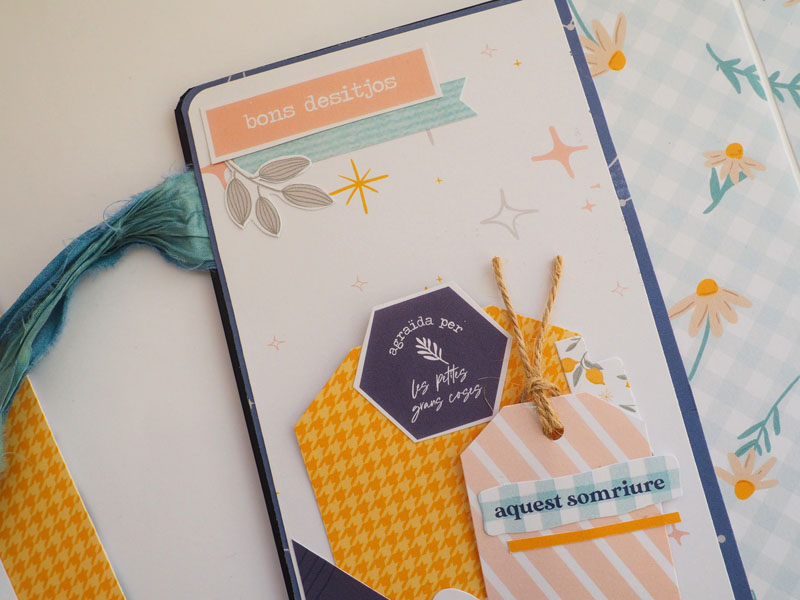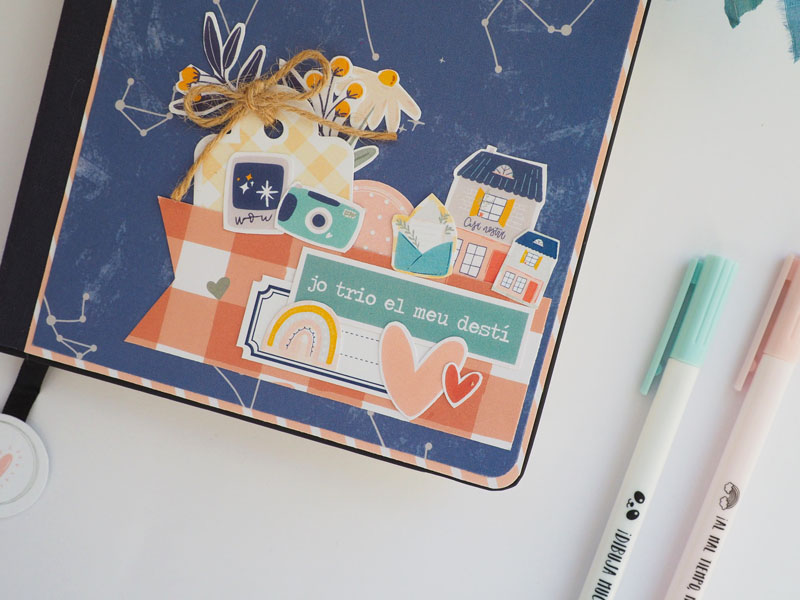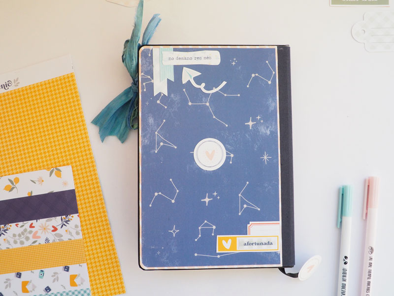 Para hacerla he forrado el lomo con tela tejana de encuadernar y la portada y contraportada las he forrado con un papel azul de constelaciones… el nombre troquelado arriba y en la parte de abajo de la portada unos diecuts y la frase «Jo trio el meu destí», yo escojo mi destino… De cierre un lazo y por dentro bolsillos con tags decorados. En la parte posterior de la contraportada un desplegable con tarjetitas para poder escribir. Aquí os dejo las fotos, a ver si os gusta
