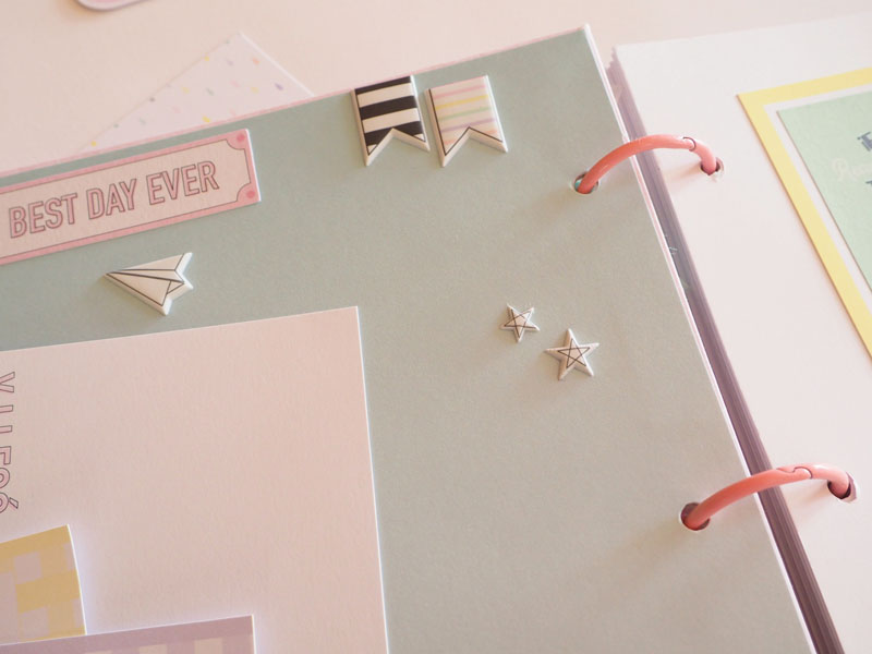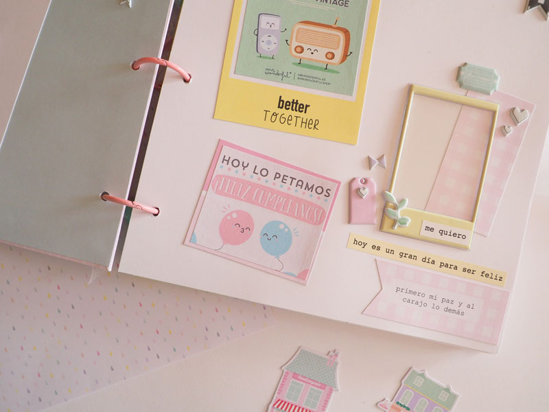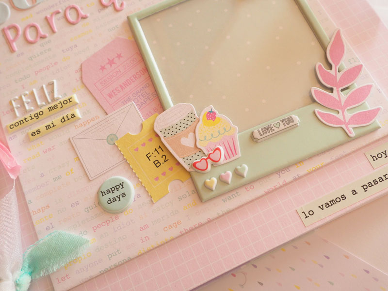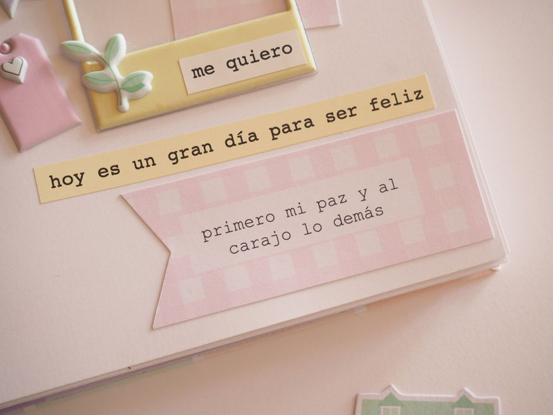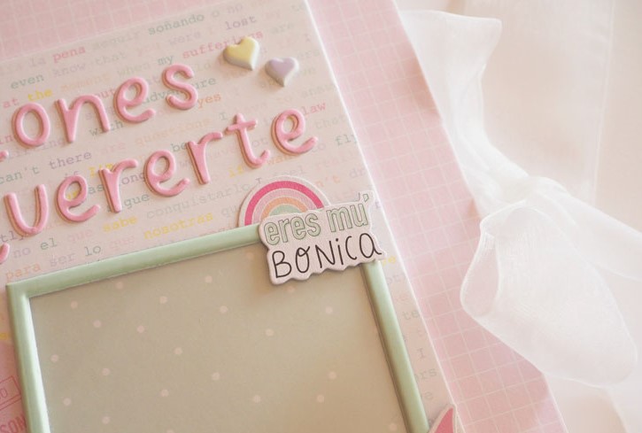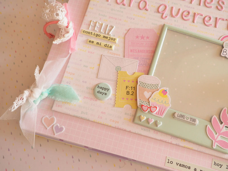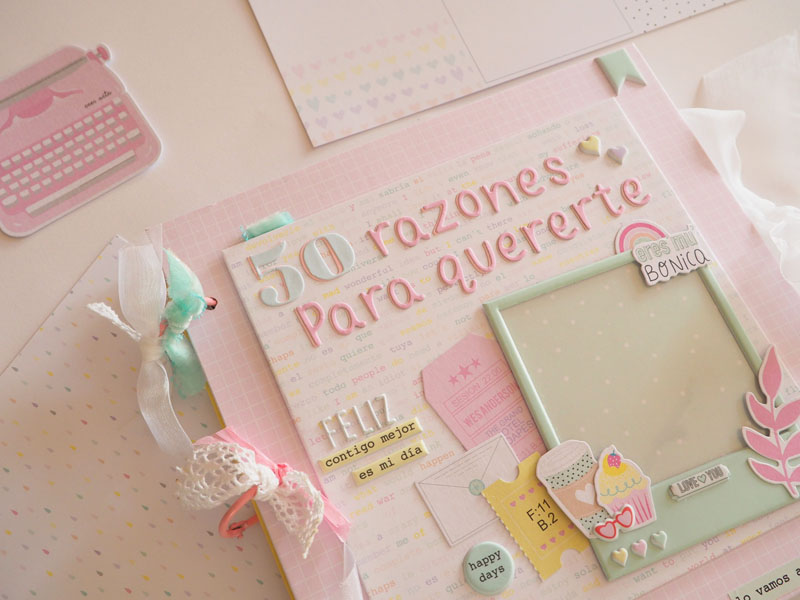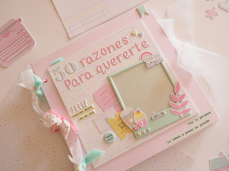 Es un libro de firmas super sencillo de hacer, ya que lleva una encuadernación de anillas de esas de papelería. Así permite añadir fotos o más hojas si es necesario. La portada forrada con un papel rosa de cuadritos y encima otro cartón forrado a modo de decoracion. Como título del álbum: «50 razones para quererte», un marco puffy de la misma colección, unos die cuts i frases cukis, y unos lazos decorando las anillas. Con esta colección no hace falta tener mucha idea de scrap, porque trae cosas tan chulas que te aseguras un bonito proyecto aún sin tener ni idea de scrap!!