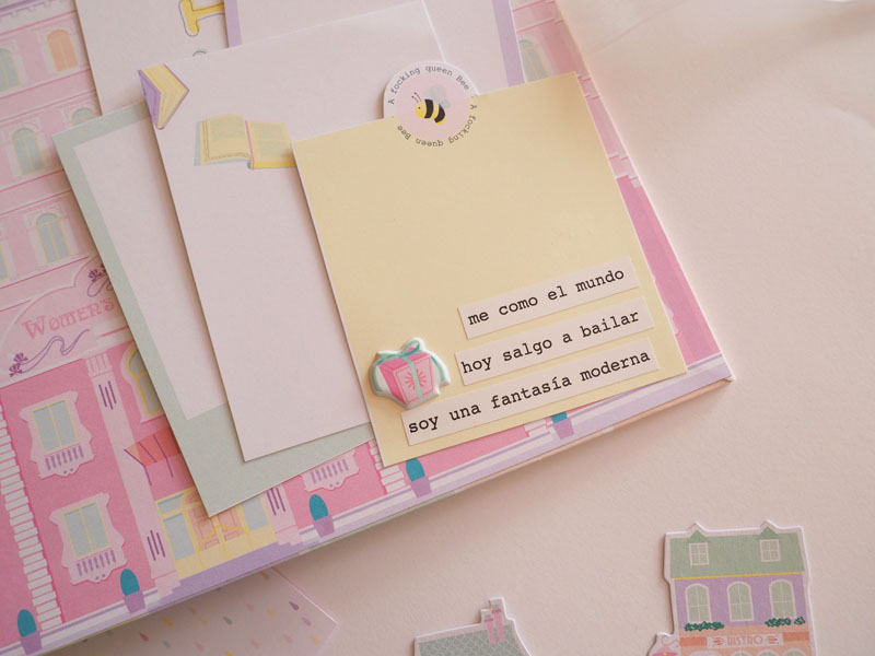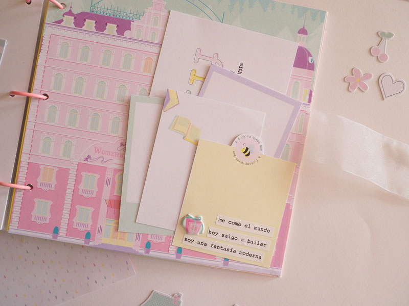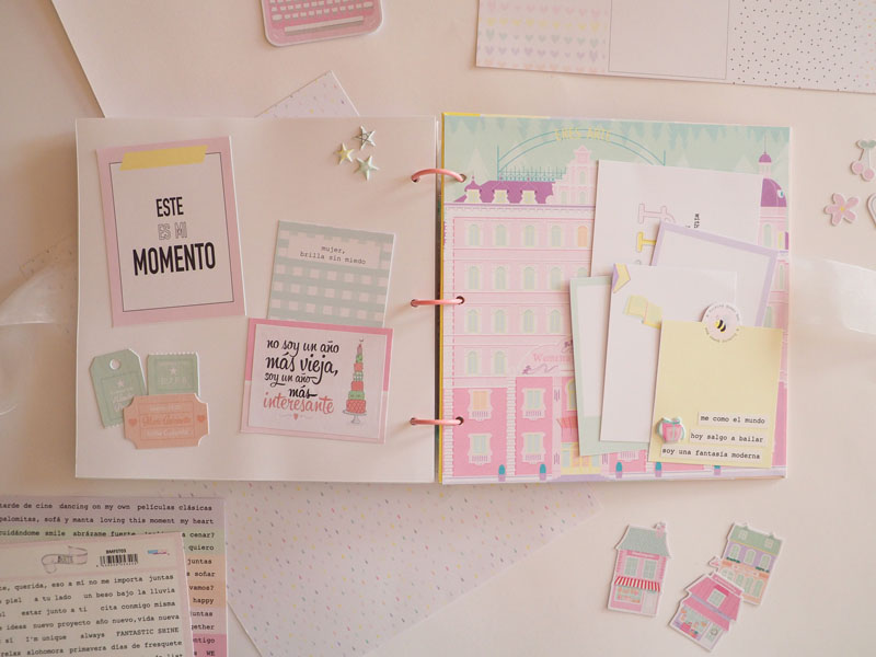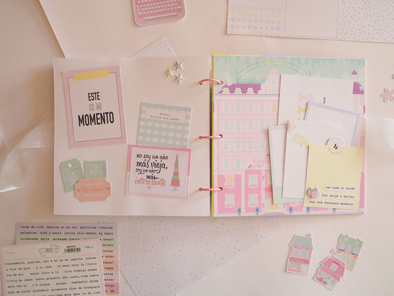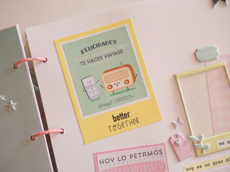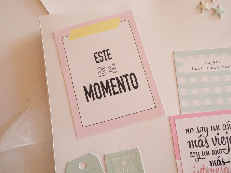 Por dentro bolsillos con tags y frases positivas impresas, puffys, die cuts… otro marquito puffy con otra foto de la cumpleañera y poca cosa más… aquí os dejo las fotos, que una imagen vale más que cien palabras.