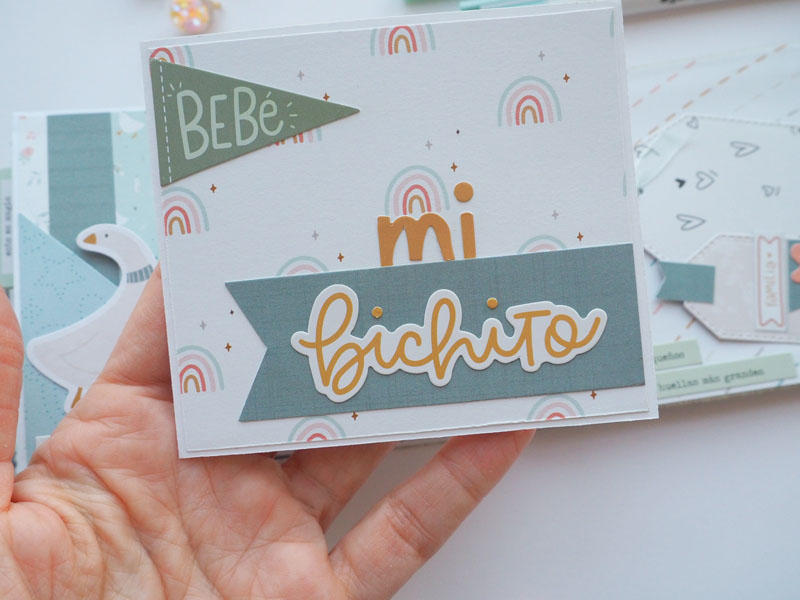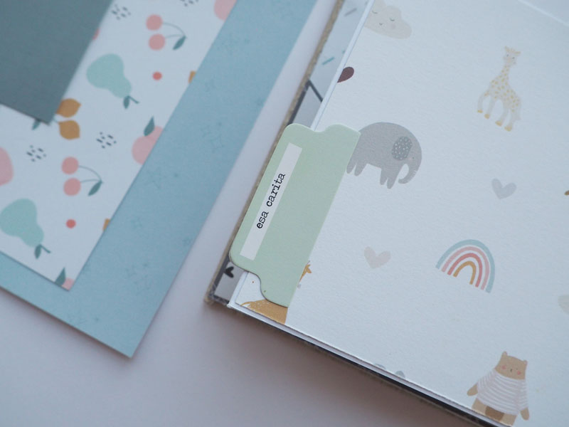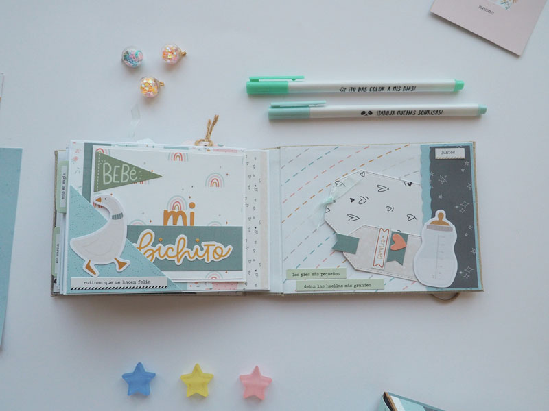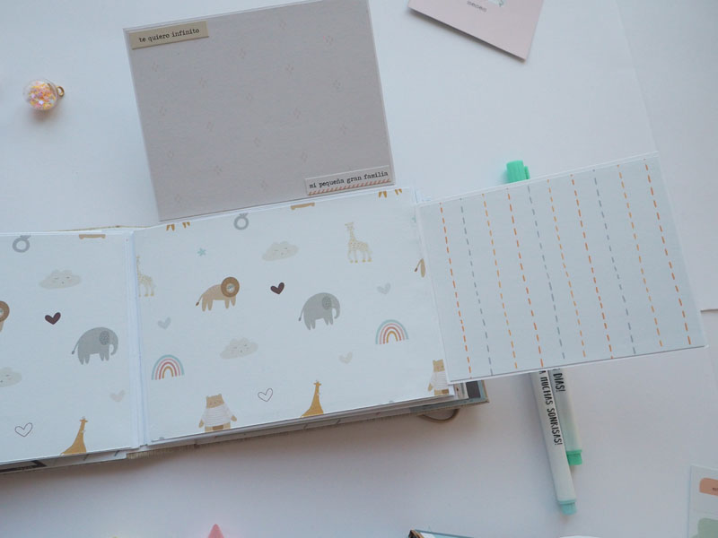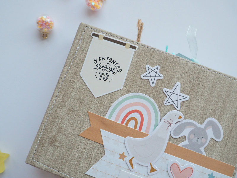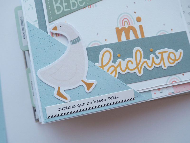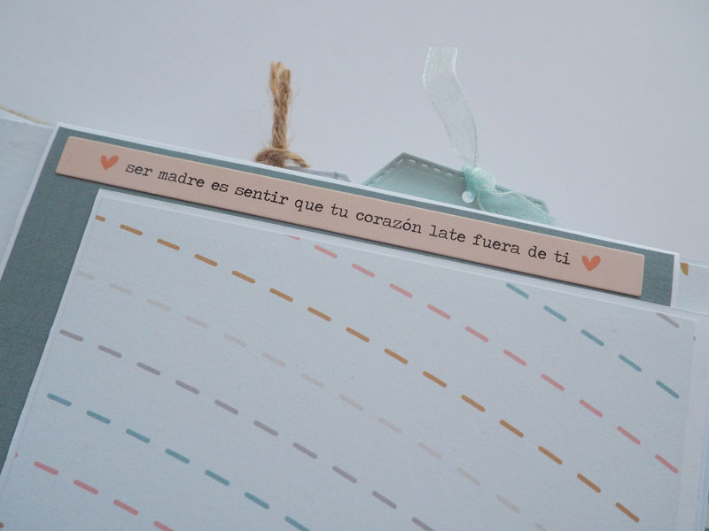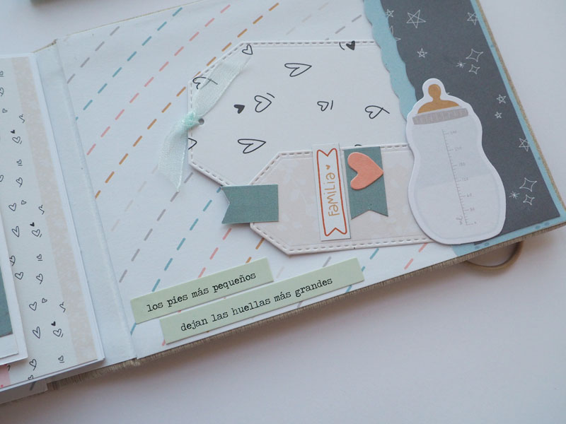 Al ser tan pequeño no he querido decorarlo demadiado, tan solo he puesto algún die cut y los demás los he dejado en un bolsillo para que la mami los ponga cuando ponga las fotos del bebé. Lo que sí he puesto son muchas frases que trae la colección, que quedan super bonitas… mirad las fotos, ya veréis! En instagram os dejo un reels para que lo veais en movimiento… (clica AQUÍ para verlo ) a ver si os gusta 🙂