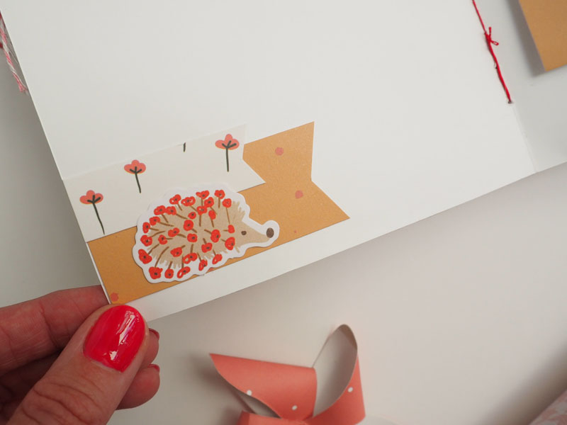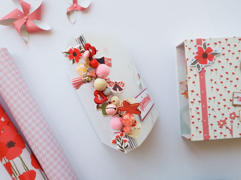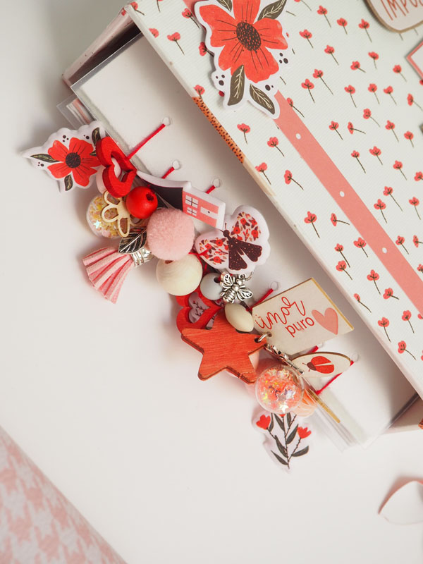 Mi proyecto es un mini álbum con encuadernación cosida, conocida en el mundillo del scrap como encuadernación Copta. En el lomo le he puesto un montón de cositas enganchadas: Maderitas con rubbon, bolitas con lentejuelas, un cascabel, detallitos en madera, charms, bolas de bisutería, foams de la colección… un montón de cositas atadas a la costura del lomo.
