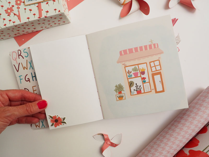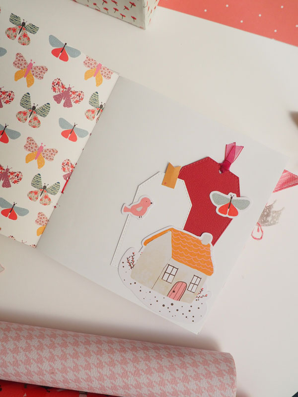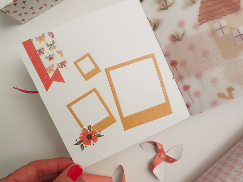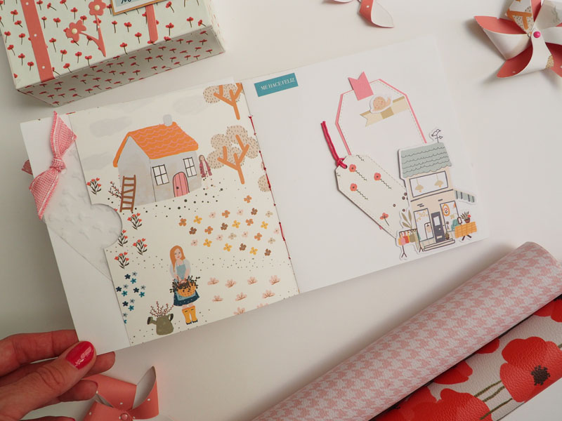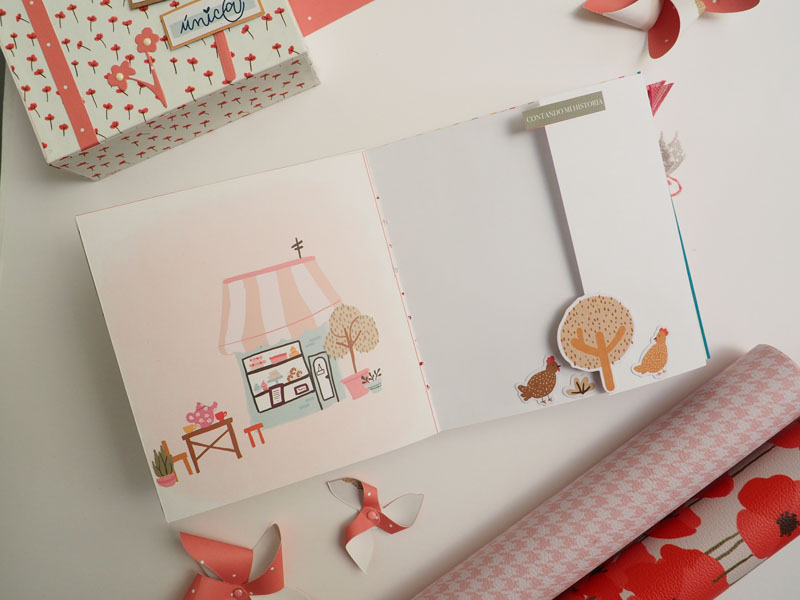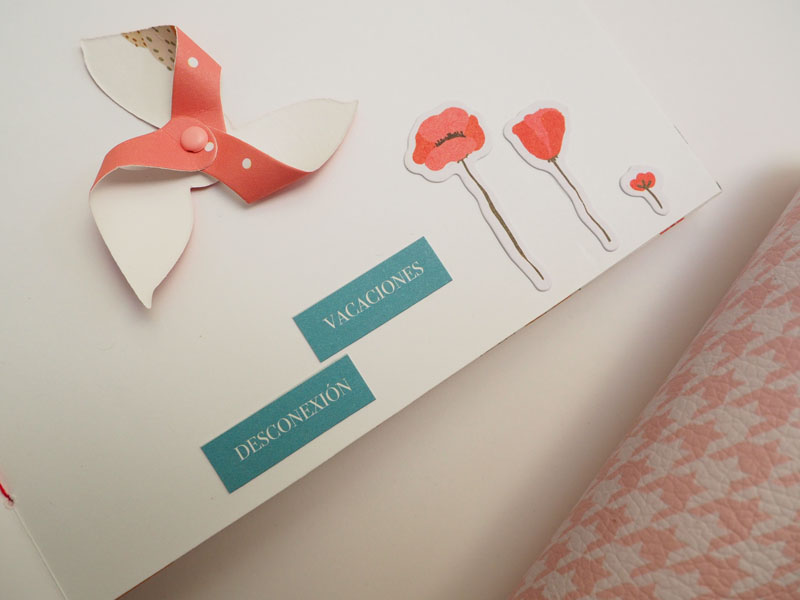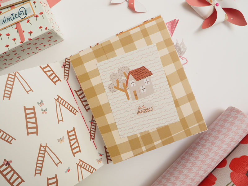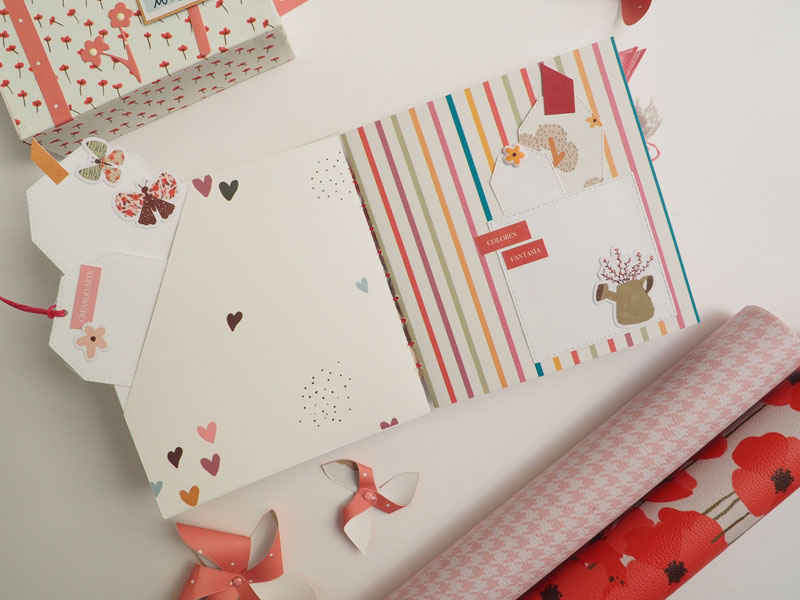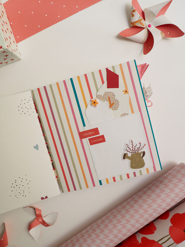 El interior lleva 5 cuadernillos con 3 hojas cada uno, decorados con bolsillos y desplegables. Las tapas son de prolipropileno, del pack de 6 hojas que lleva la colección. Y este álbum va dentro de un archivador forrado con el papel de encuadernar de la colección y decorado con frasecitas de uno de los papeles. Cuando Eva me envió la colección he de decir que me encantó, pero trabajar con ella ha sido una gozada, me he acabado de enarmorar!! Los tonos, los colores, los diecuts, los detallitos que lleva para decorar, los troqueles, las frases… una maravilla!!