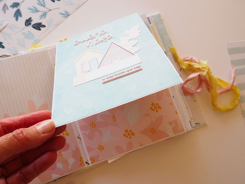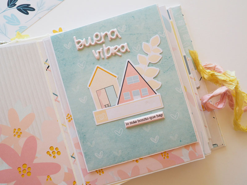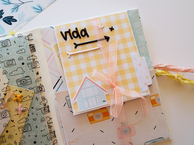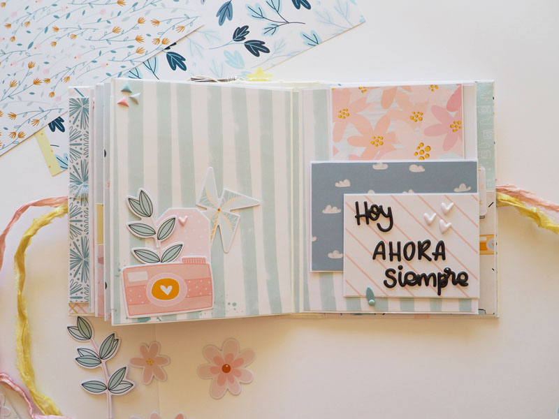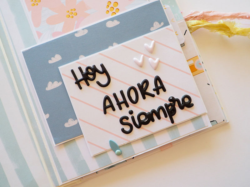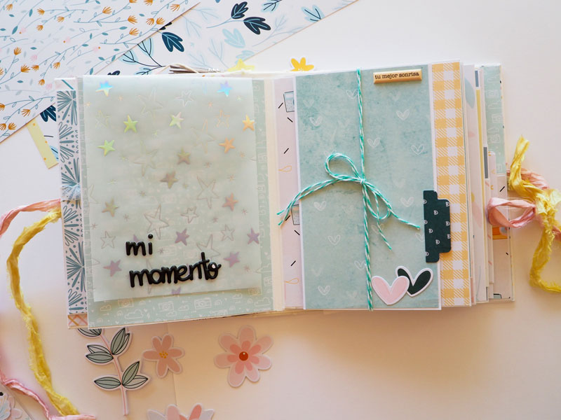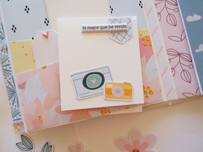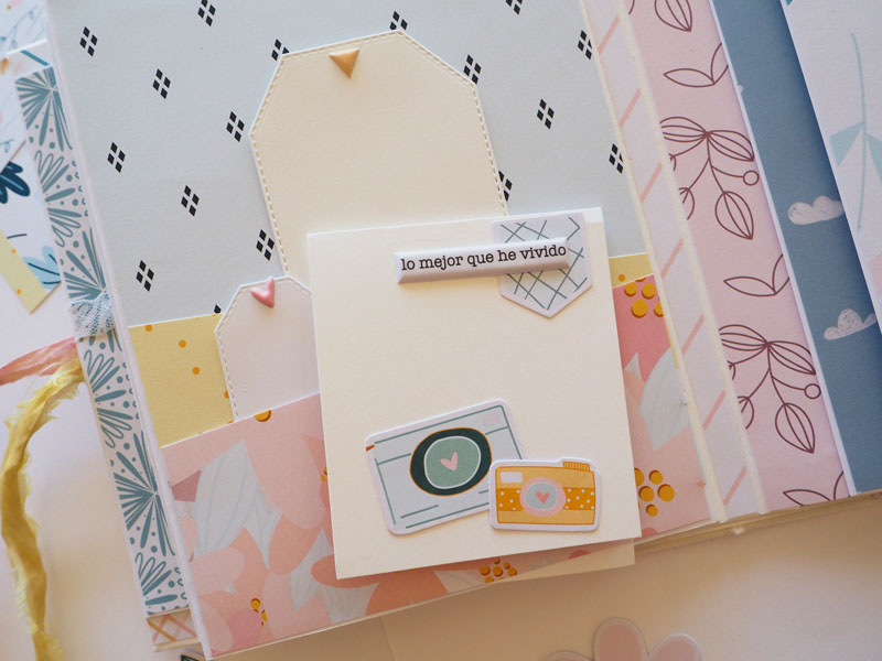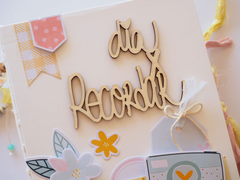 Un álbum con encuadernación de espina, lleno de bolsillos y desplegables, con detalles en velum y acetato… decorado con los die cuts y puffis de la colección. Todo lo que he utilizado es de Dunaon menos la maderita de la portada: «Dia x recordar» que es de Stampam , una tienda online que hace cosas chulísimas en madera.