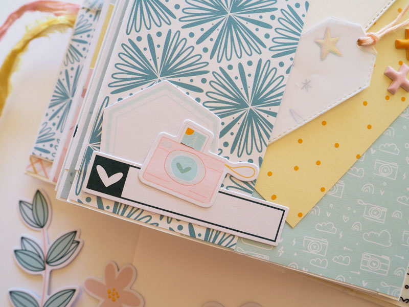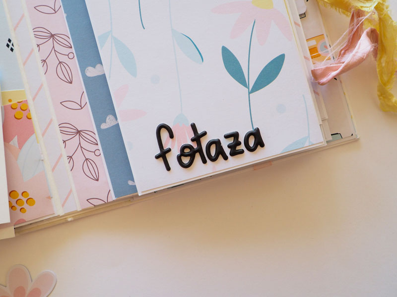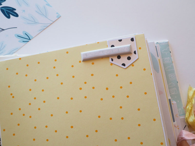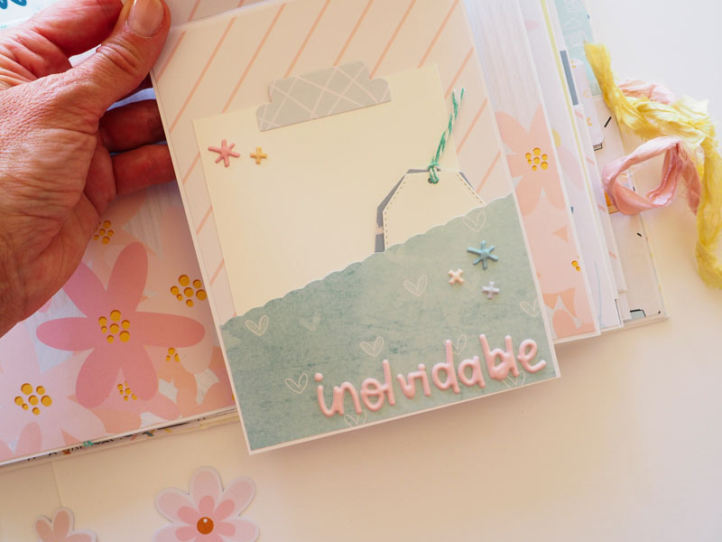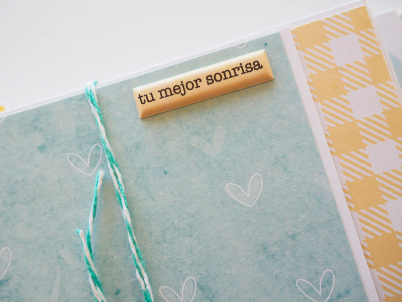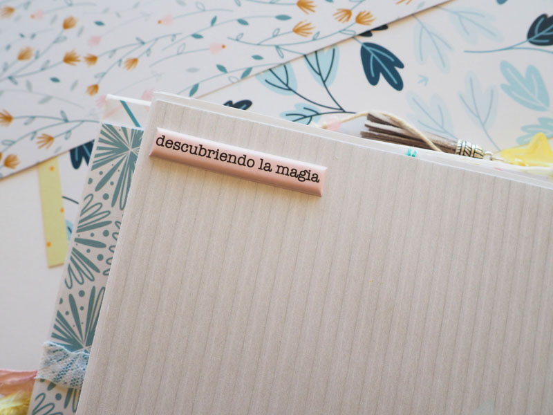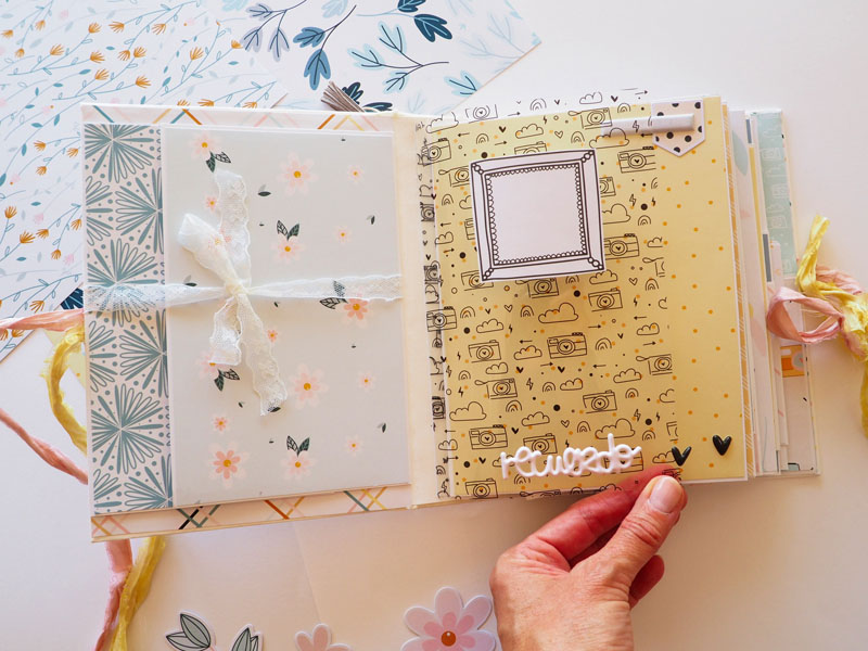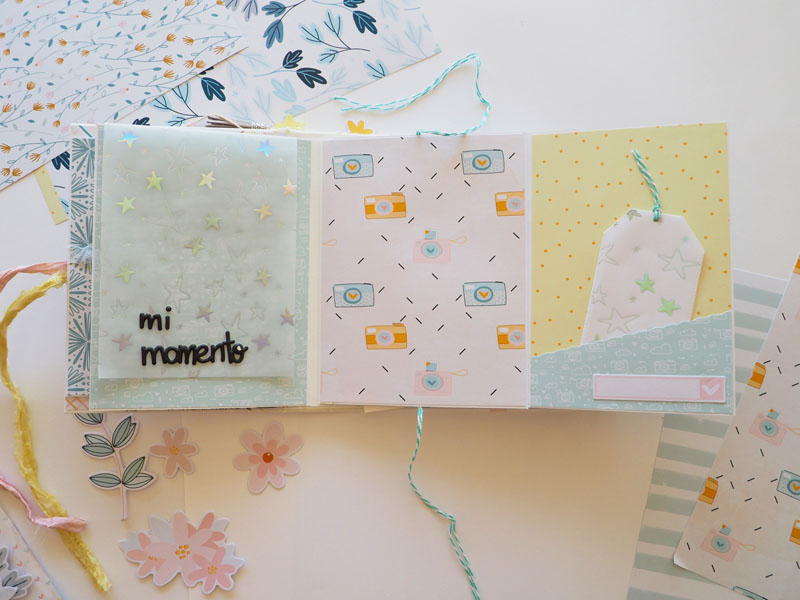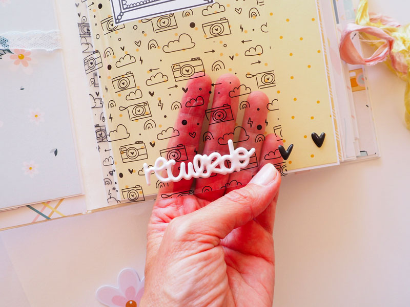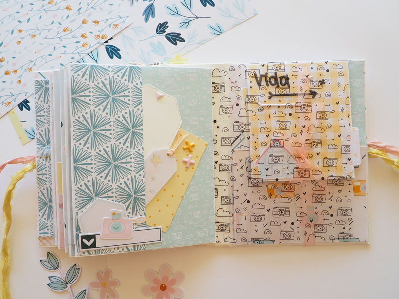 Un álbum con encuadernación de espina, lleno de bolsillos y desplegables, con detalles en velum y acetato… decorado con los die cuts y puffis de la colección. Todo lo que he utilizado es de Dunaon menos la maderita de la portada: «Dia x recordar» que es de Stampam , una tienda online que hace cosas chulísimas en madera.