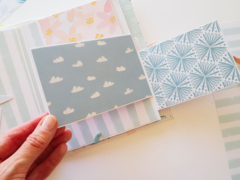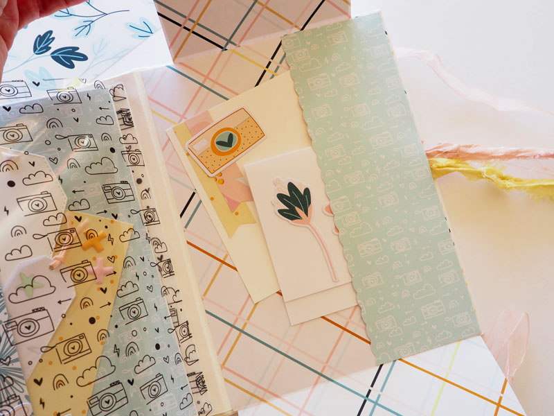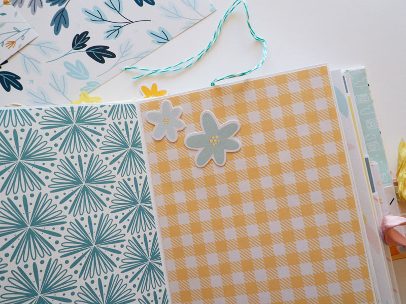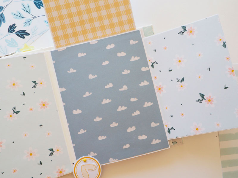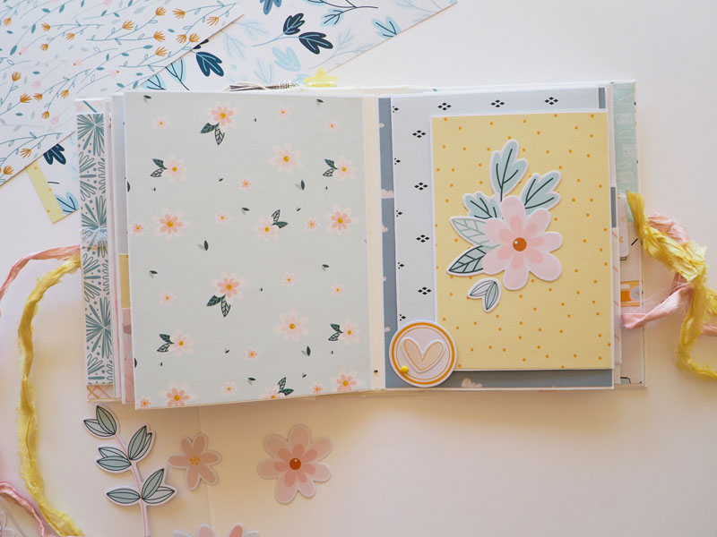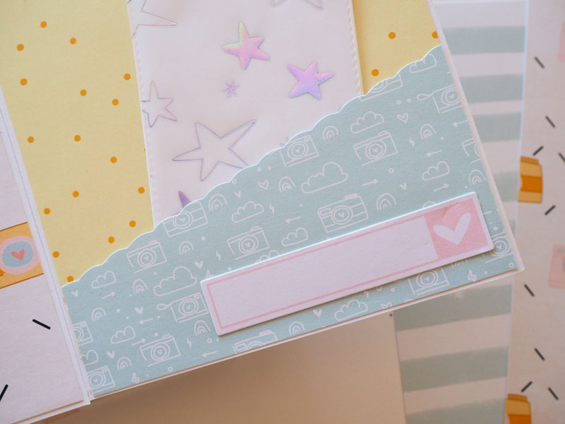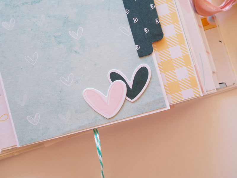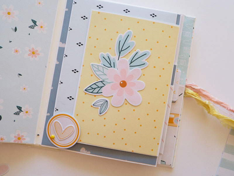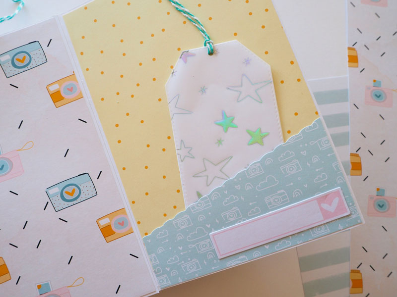 Un álbum con encuadernación de espina, lleno de bolsillos y desplegables, con detalles en velum y acetato… decorado con los die cuts y puffis de la colección. Todo lo que he utilizado es de Dunaon menos la maderita de la portada: «Dia x recordar» que es de Stampam , una tienda online que hace cosas chulísimas en madera.