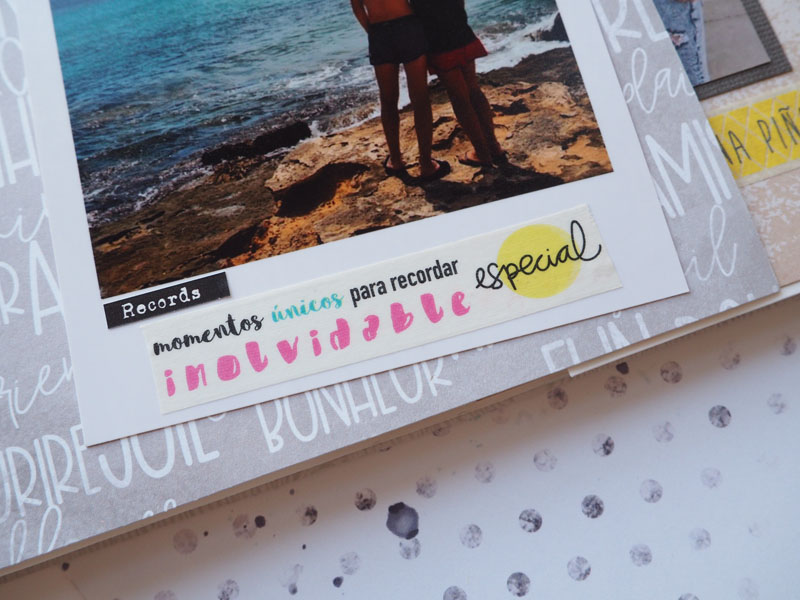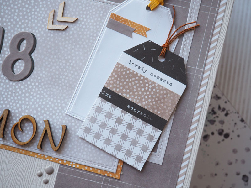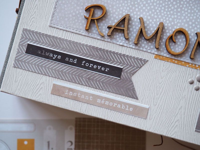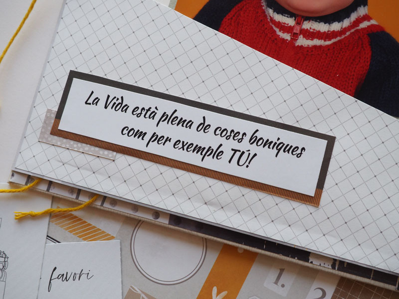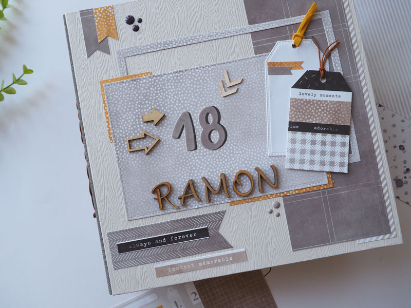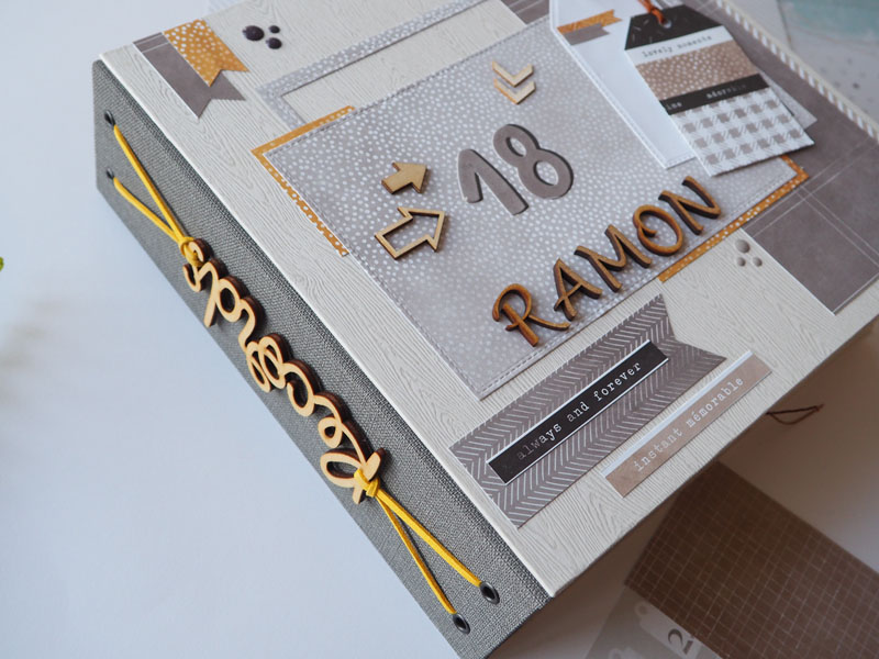 En el lomo «Records» (recuerdos) en madera, atado con una cinta de antelina color mostaza y cogido al lomo con eyelets… En la portada el nombre en madera, un marco, unos recortes de papeles y unos tags. El 18 troquelado en el centro, unas frases y unos detallitos en madera… El interior lo hice con anillas para que su dueño pueda añadir hojas o fotos si quiere… Las hojas llevan bolsillos y desplegables y frases o detallitos decorando las fotos… Fotos desde que nació hasta ahora que ha cumplido 18. Un regalazo, y no porque lo haya hecho yo, sino porque es un recuerdo para siempre. Esta vez solo veréis algunas páginas, porque no pude fotografiarlo antes de ponerle las fotos. Aún así espero que os guste tanto como a Ramón y a su mami, que es quien me lo encargó! Gracias Montse por pensar en mí para un regalo tan especial 🙂